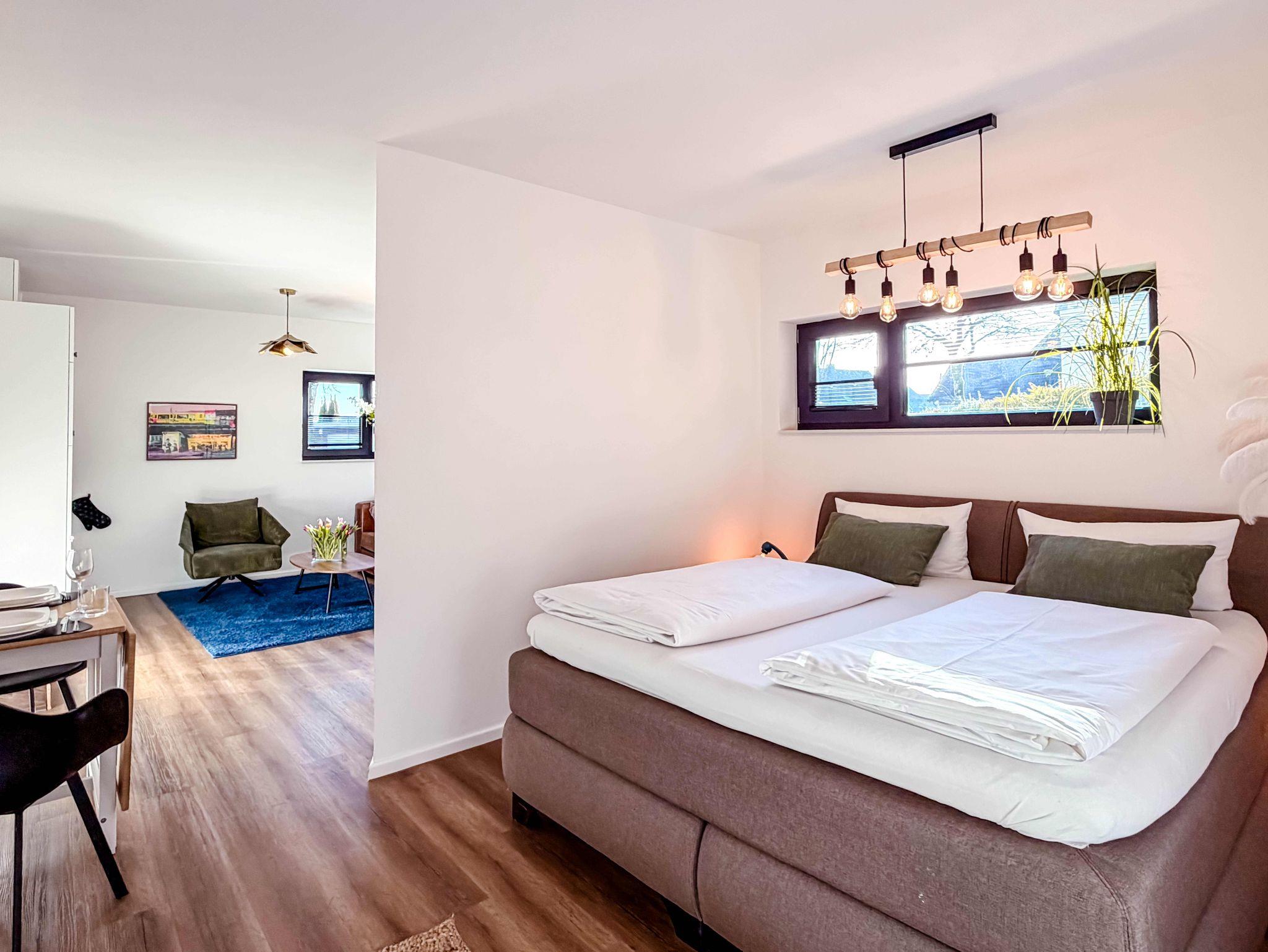 Der offene Wohn- und Schlafbereich bietet ein komfortables Doppelbett sowie ein Schlafsofa. Die Küche ist voll ausgestattet, sodass Sie sich bei Bedarf ganz entspannt selbst versorgen können.