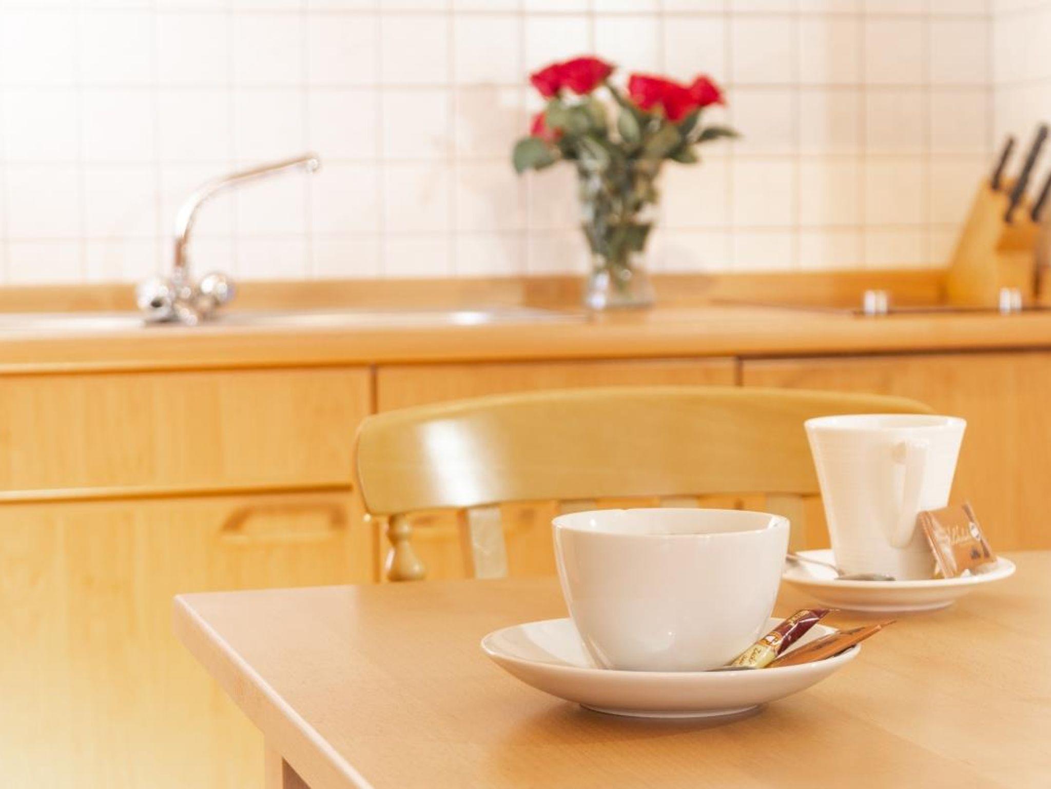 Sie finden einen Fernseher im Wohnraum und einen im Schlafzimmer. Die Küche ist ausgestattet mit Mikrowelle, Kühlschrank mit Gefrierfach, Kaffeemaschine, Herd, Geschirr und Besteck sind vorhanden. Das Bad ist ausgestattet mit Haarfön, Seife und Kosmetikspiegel.