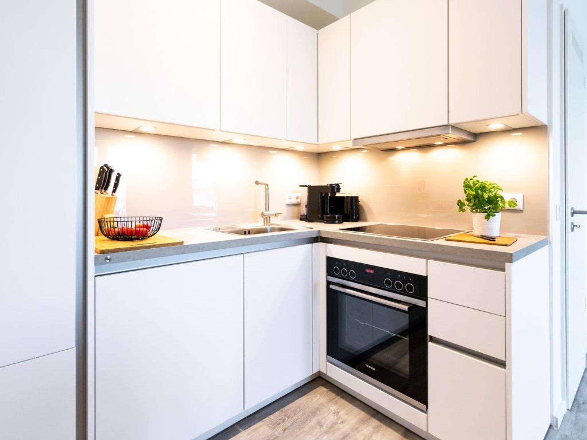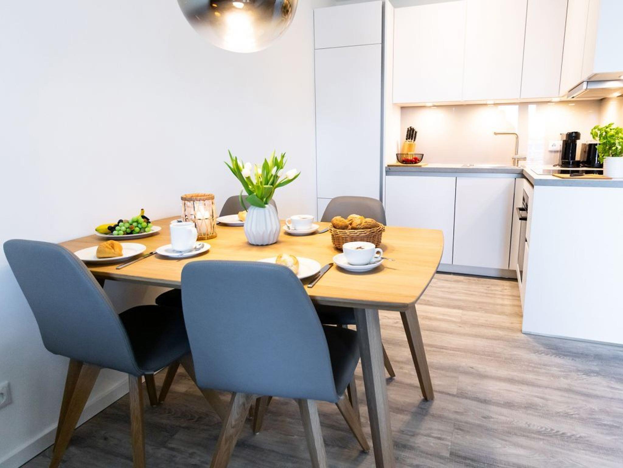 Das hochwertig möblierte 2-Zimmer-Appartement ? Hafenspitze 3- befindet sich in der 1. Etage und empfängt bis zu 2 Gäste mit einer geräumigen Wohnfläche von 63qm. Die zugehörige Loggia bietet interessante Aussicht auf Meer und Holzhafen. Sie bewohnen eine moderne Ferienwohnung direkt im Hafen, welche über einen schicken Wohn-Essbereich verfügt. Zudem ist eine voll ausgestattete, offene Wohnküche integriert, in der Herd, Backofen, Mikrowelle sowie Geschirrspüler und selbstverständlich auch Kaffeemaschine, Toaster usw. vorhanden sind. Ebenso bieten ein internetfähiges Fernsehgerät sowie Internetradio Unterhaltung und auch WLAN steht kostenfrei zur Verfügung.