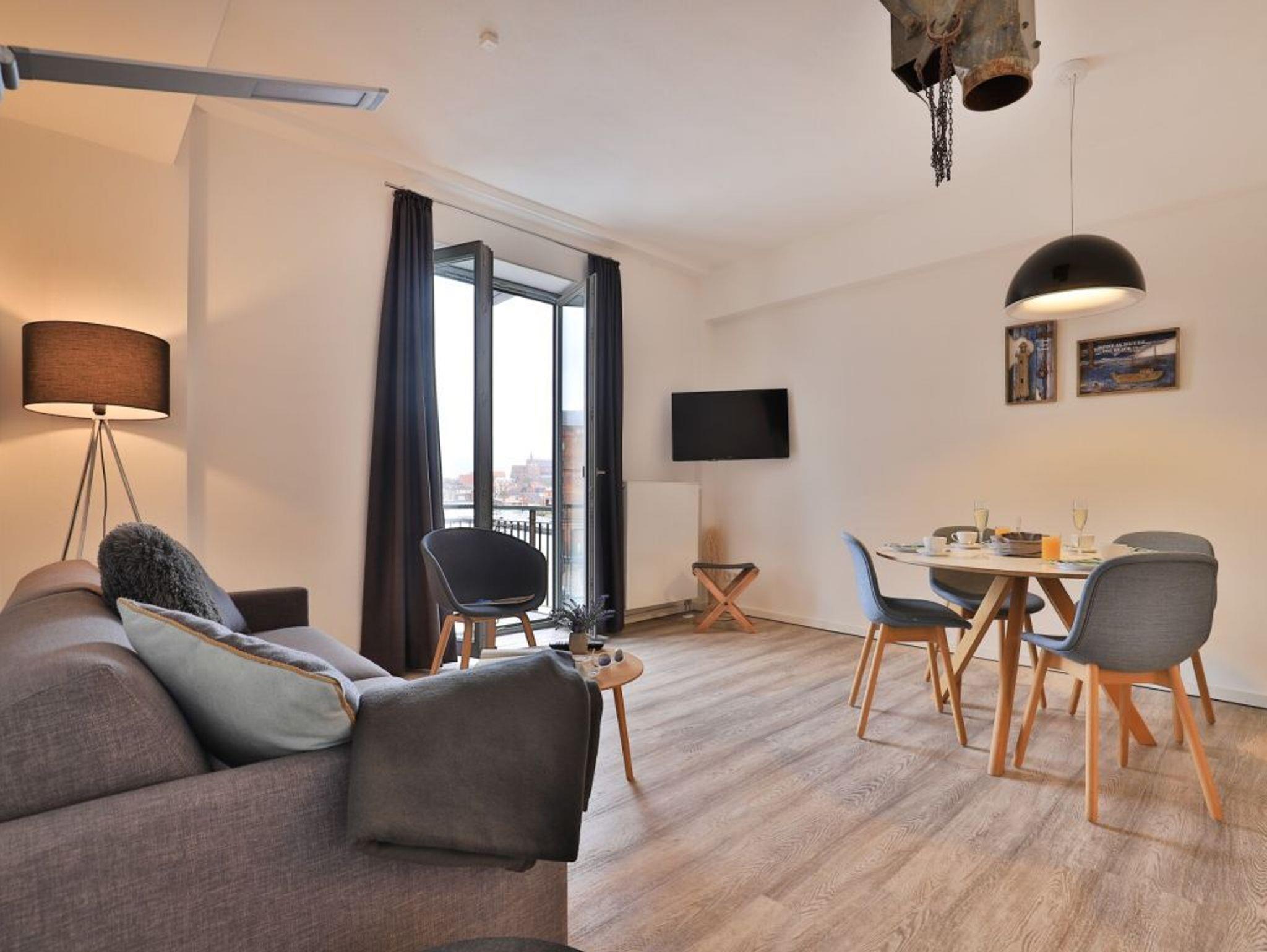 Das elegante 2-Zimmer-Appartement mit Balkon bietet mit seinen 51 m² für 3 Personen einen unvergesslichen Urlaub. In der 2. Etage werden Sie werden von einem modern eingerichteten Wohnzimmer mit Essecke und Fernseher empfangen. Von dort können Sie den Balkon erreichen und den traumhaften Blick auf den Wismarer Hafen genießen. Die separate Küche ist komplett ausgestattet mit Geschirrspüler, Kühlschrank, Kaffeemaschine, Wasserkocher u.v.m.. Das große Doppelbett und der Flachbild-Fernseher im Schlafzimmer sorgen für erholsame Stunden. Das Duschbad ist hochwertig eingerichtet. Bei Anreise sind 2 Betten bezogen und Handtücher liegen für Sie bereit. WLAN steht Ihnen kostenfrei zur Verfügung.