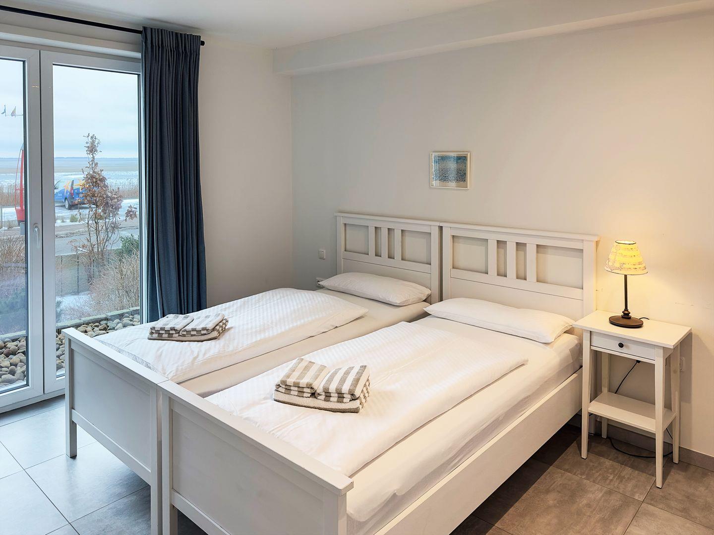 Die Wohnung verfügt über 1 Wohnraum mit WLAN, Sat-TV und offener Küche, 2 Schlafzimmer, 1 Badezimmer mit Dusche und WC, 1 Gäste-WC; 1 Süd-Balkon vom Wohnzimmer, 1 Nord-Balkon mit Meerblick vom Esszimmer, Balkonmöbel (April – Oktober). Im rechten Keller (1. Tür rechts) befinden sich eine Münz-Waschmaschine und ein Münz-Trockner zur Gemeinschaftsnutzung. Eigener PKW-Stellplatz in der Nähe des Hauses, Unterstellmöglichkeit für Fahrräder. Nur wenige Meter vom Meer entfernt.