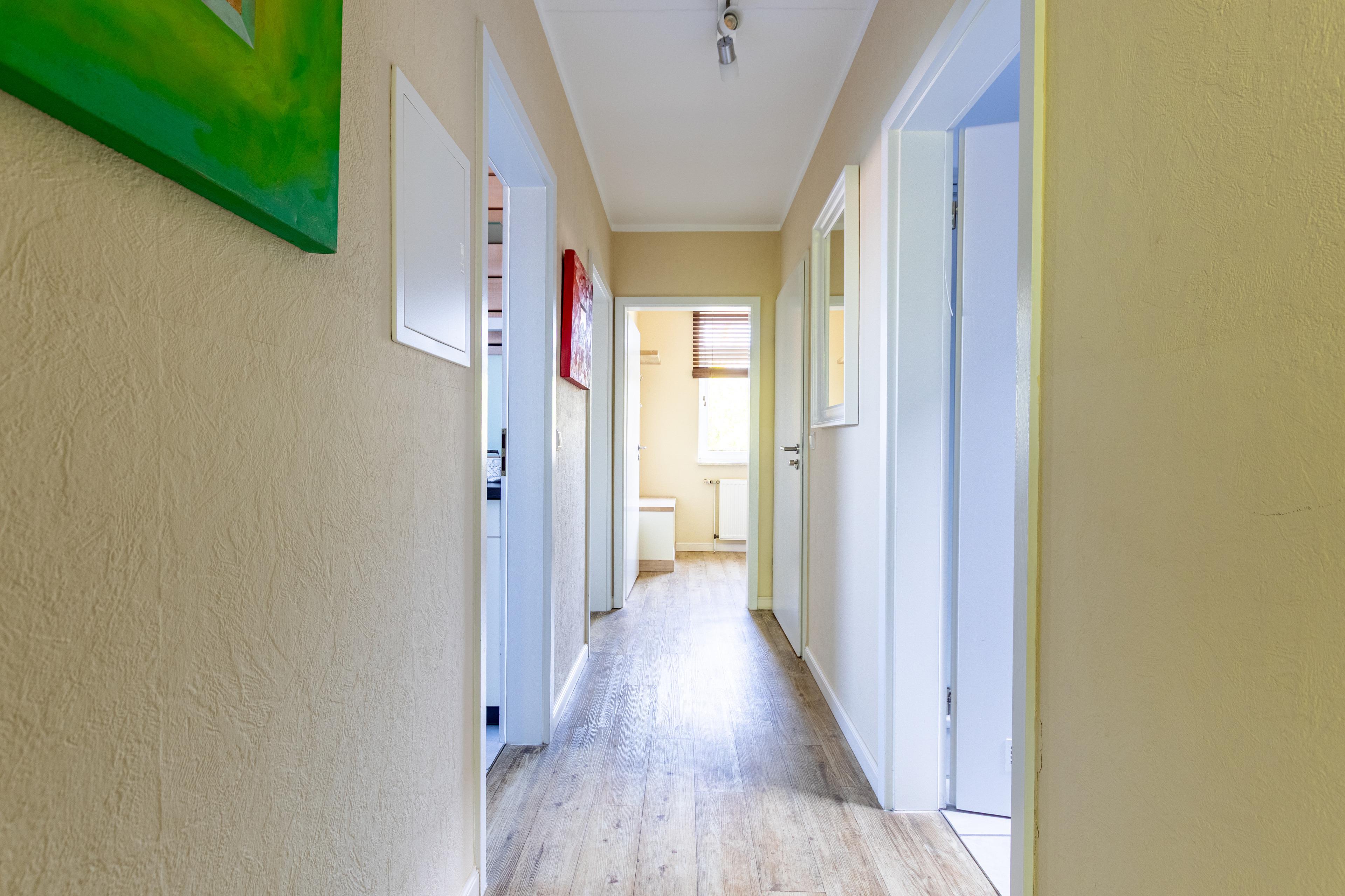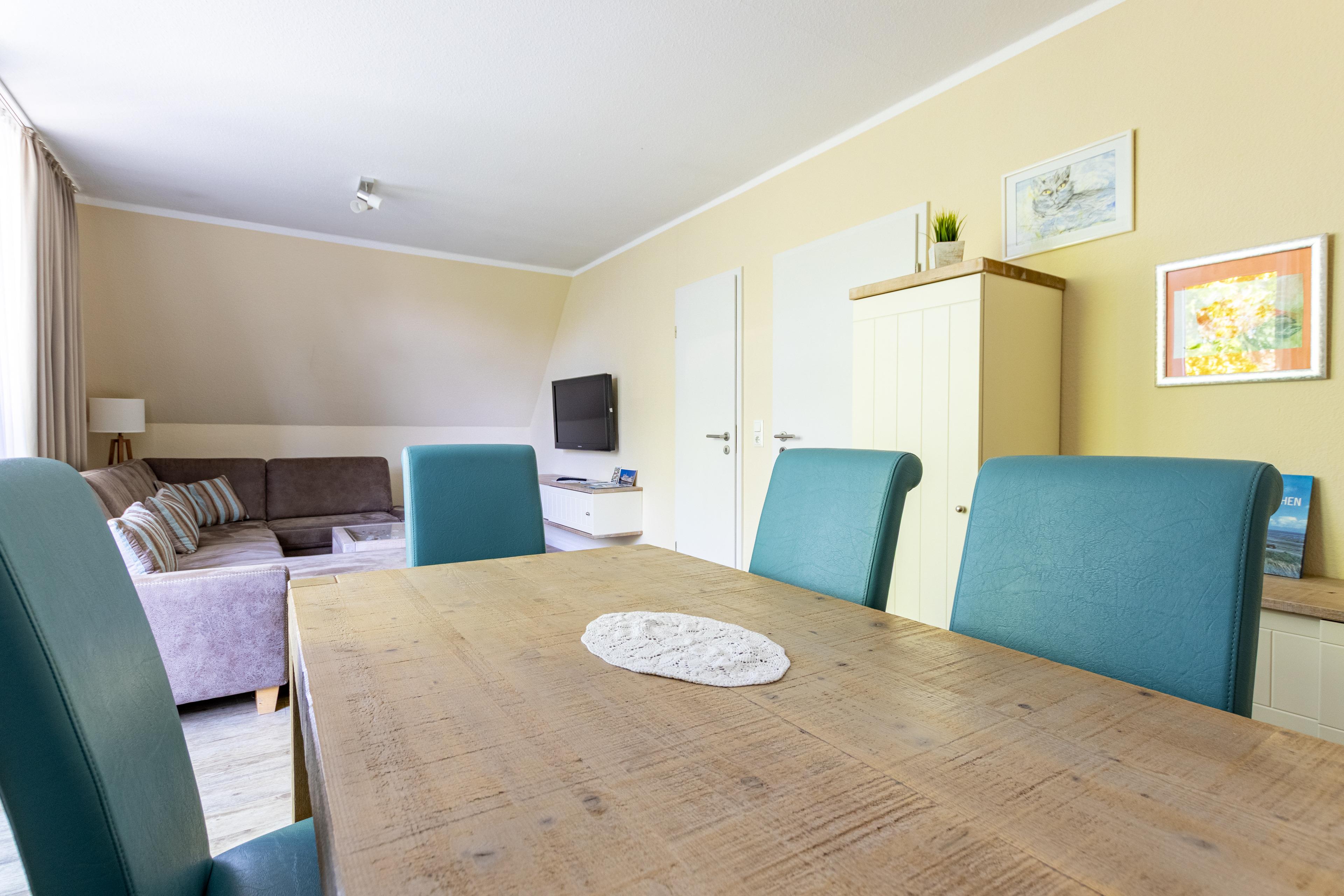 Die Wohnung überzeugt durch ihre helle und freundliche Atmosphäre sowie eine praktische Raumaufteilung. Der gemütliche Wohnbereich lädt mit einer bequemen Sitzgruppe und einem modernen HDTV-Flachbildschirm zum Entspannen ein. Direkt angeschlossen befindet sich der Essbereich, der ausreichend Platz für gemeinsame Mahlzeiten oder gesellige Spieleabende bietet.