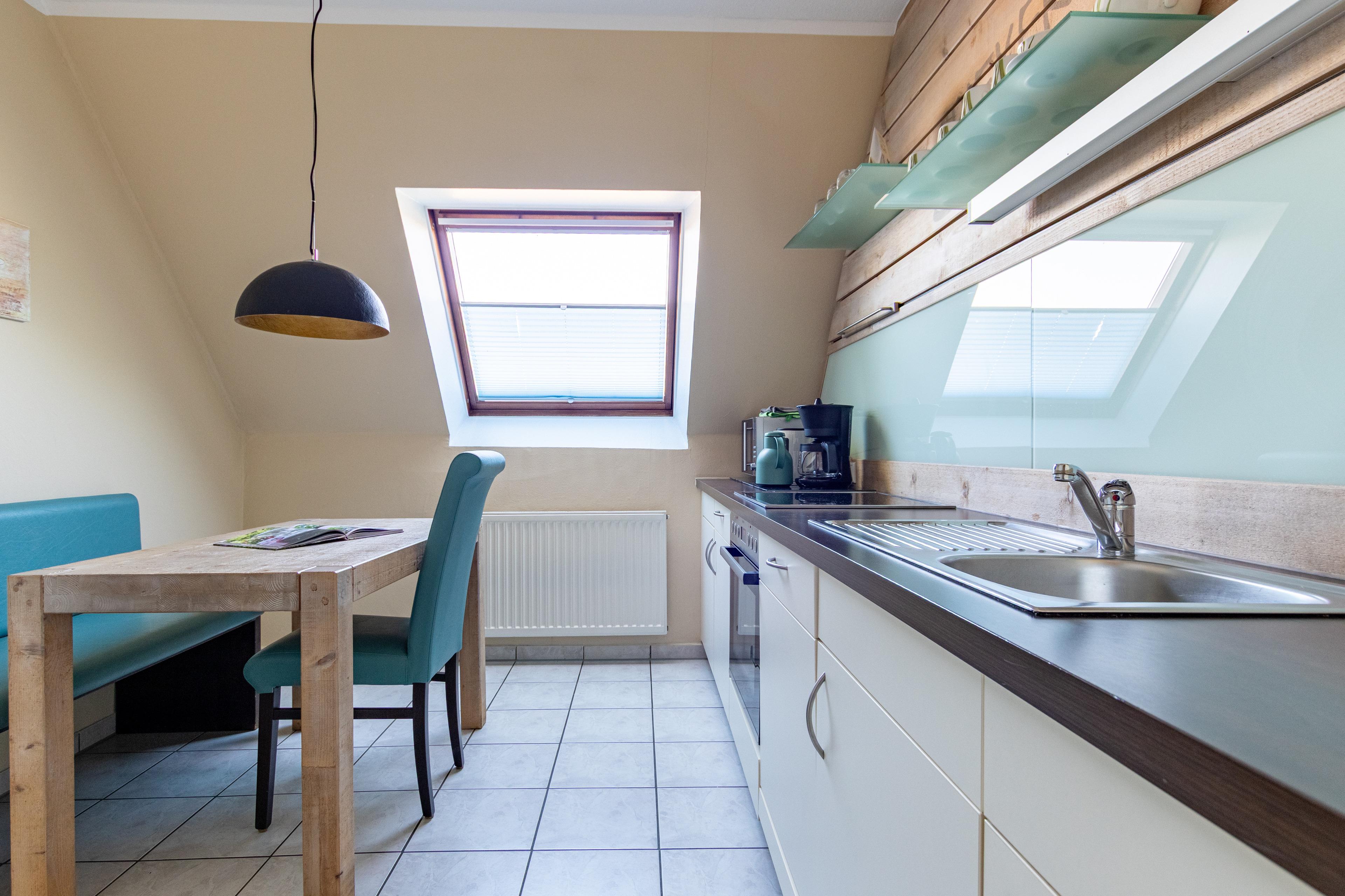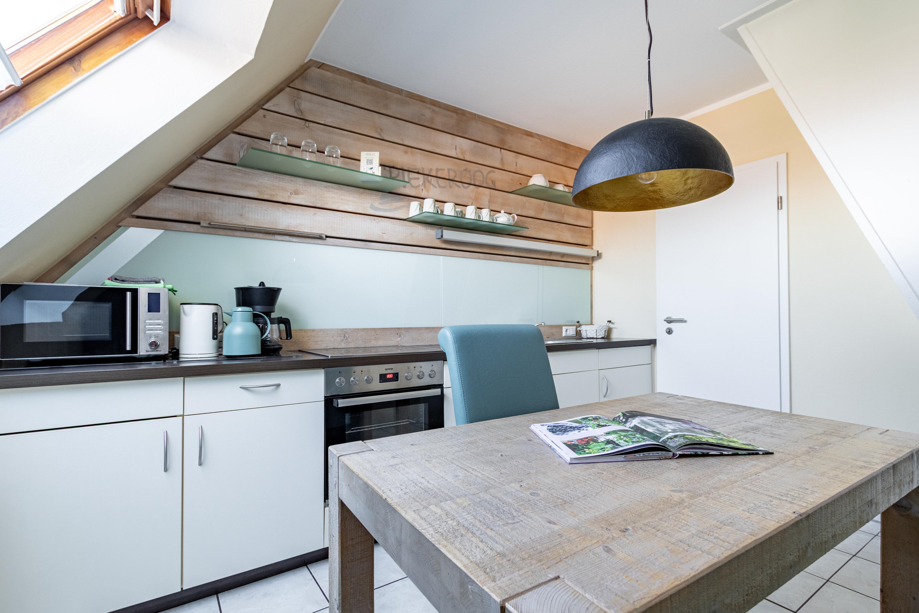 Die separate Küche ist modern ausgestattet und bietet alles, was Sie für eine unkomplizierte Selbstversorgung im Urlaub benötigen – darunter Spülmaschine, Mikrowelle, Toaster und zahlreiche Küchenutensilien.