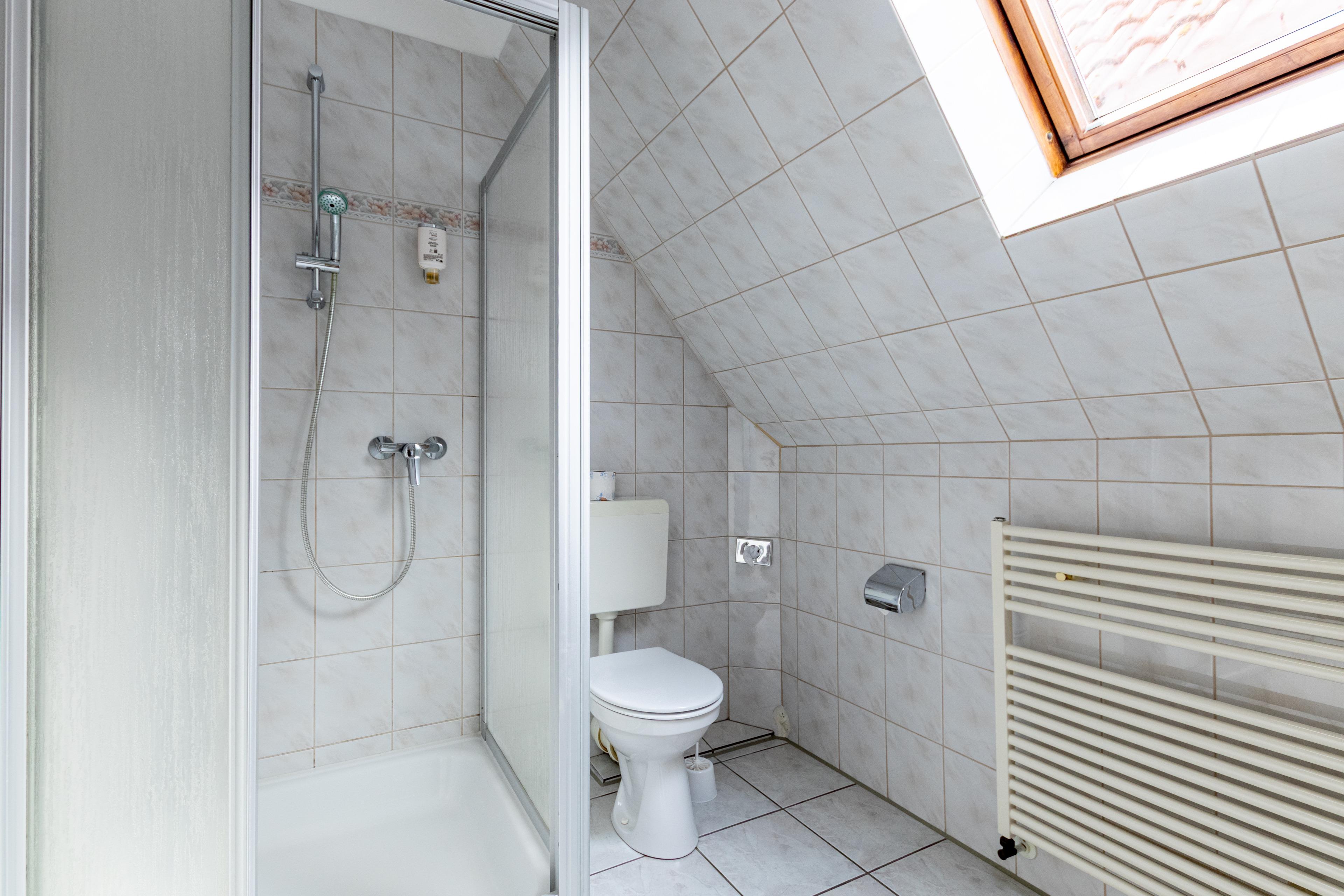 Das moderne Badezimmer verfügt über Dusche, WC, Waschbecken und Föhn.