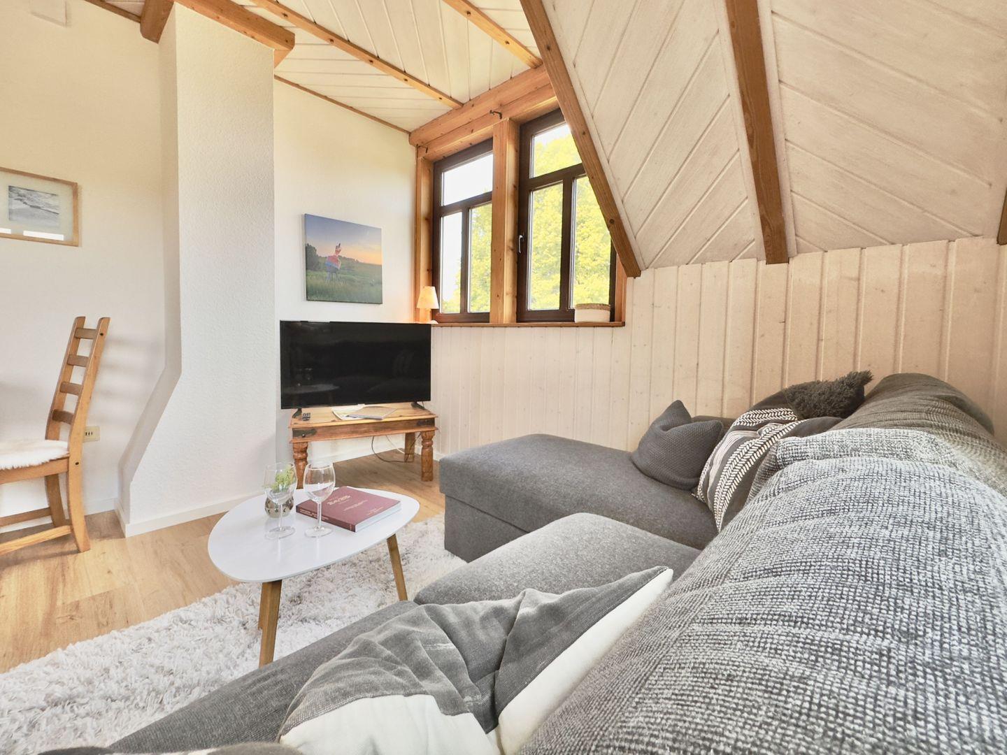 Über eine stabile Holztreppe betreten Sie Ihr persönliches Urlaubsnest im ersten Obergeschoss. Helles Licht, warme Holztöne und stilvolle Akzente empfangen Sie und schaffen sofort ein Gefühl von Geborgenheit. Der offene Wohnbereich mit gemütlichem Sofa und kleiner Essecke lädt zum Verweilen ein – hier beginnt das Zusammensein, das Lesen, das Träumen.
