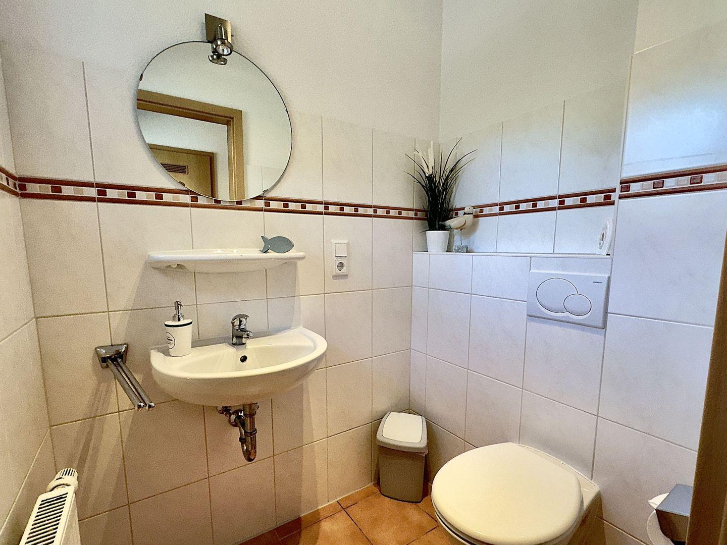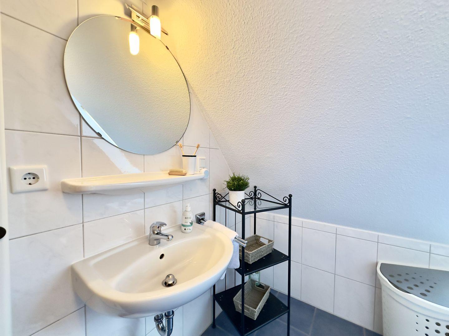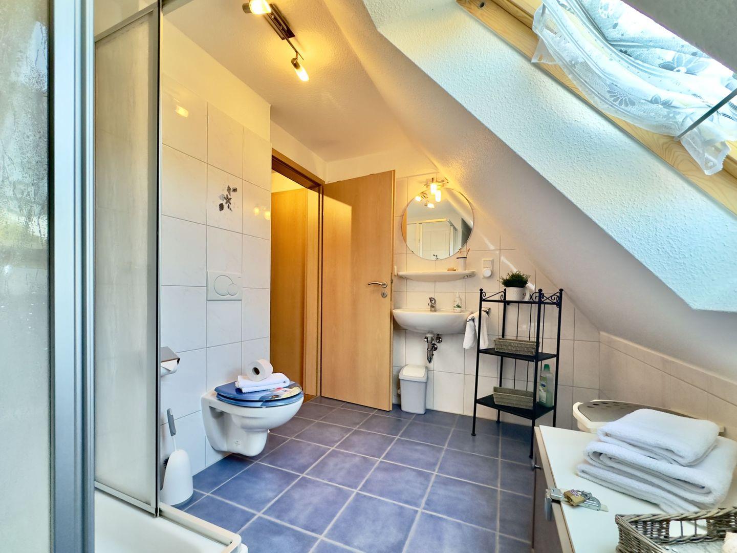 Das große Badezimmer mit Dusche und Wickeltisch sorgt dafür, dass auch die Kleinsten bestens versorgt sind.