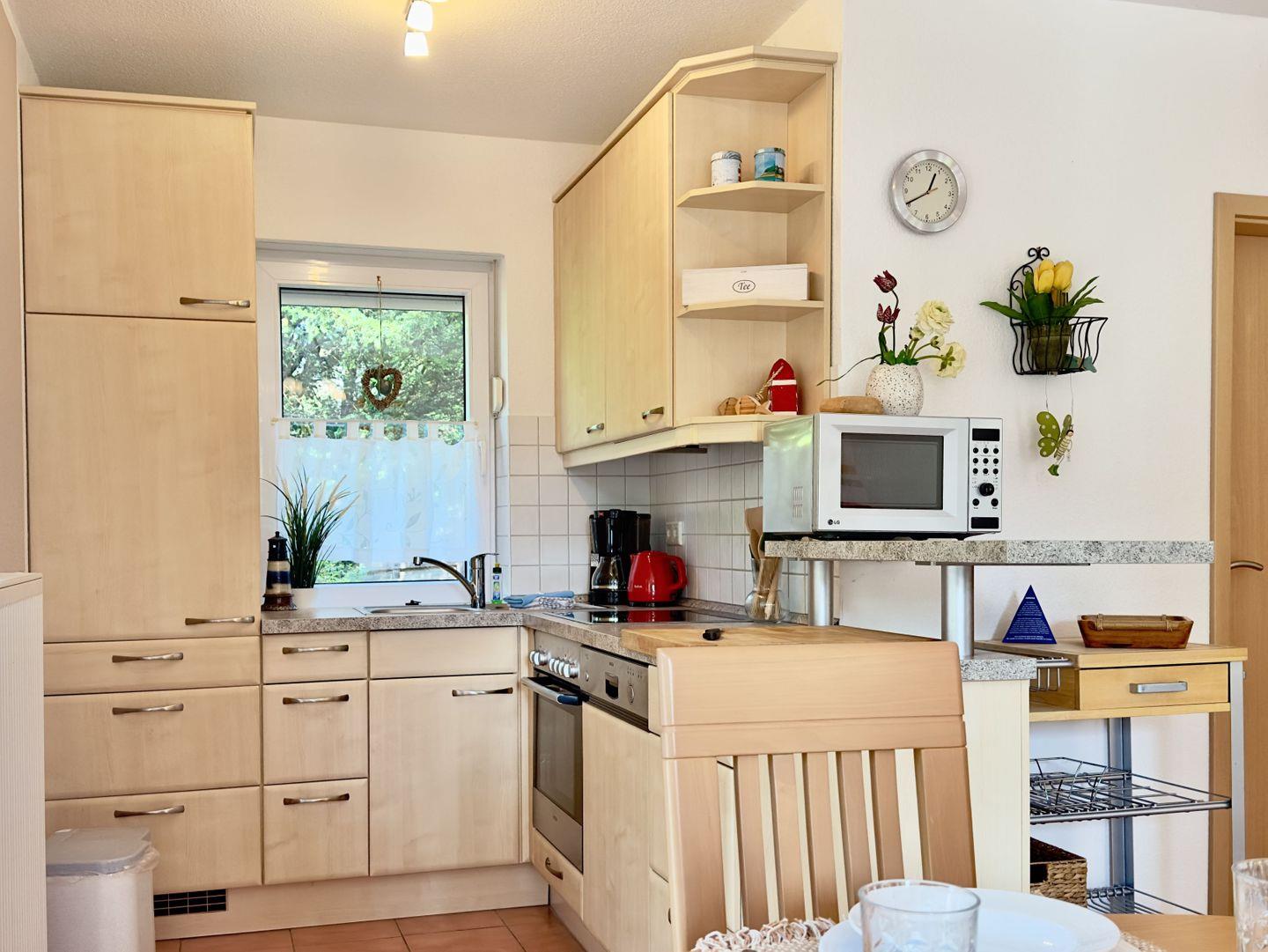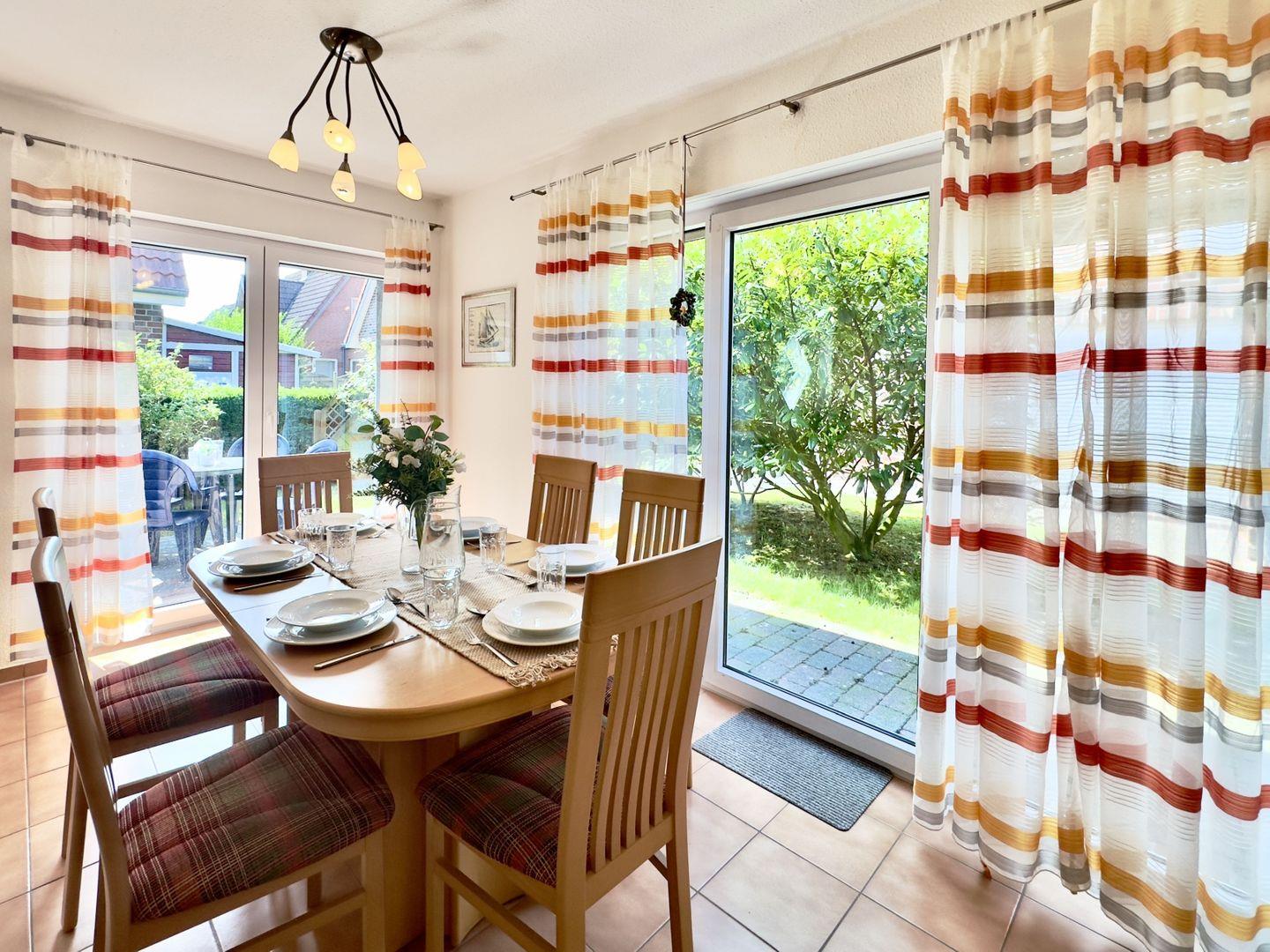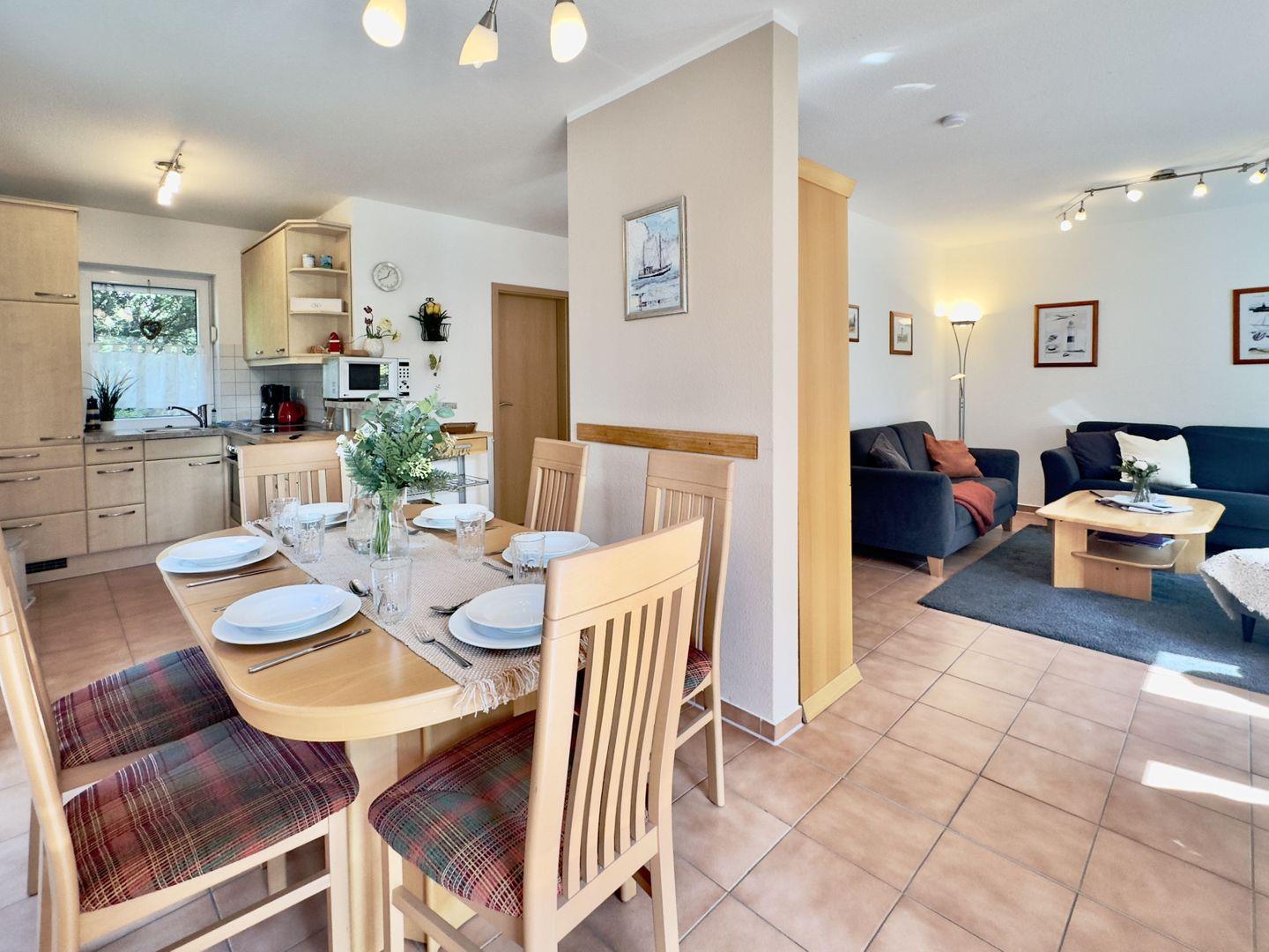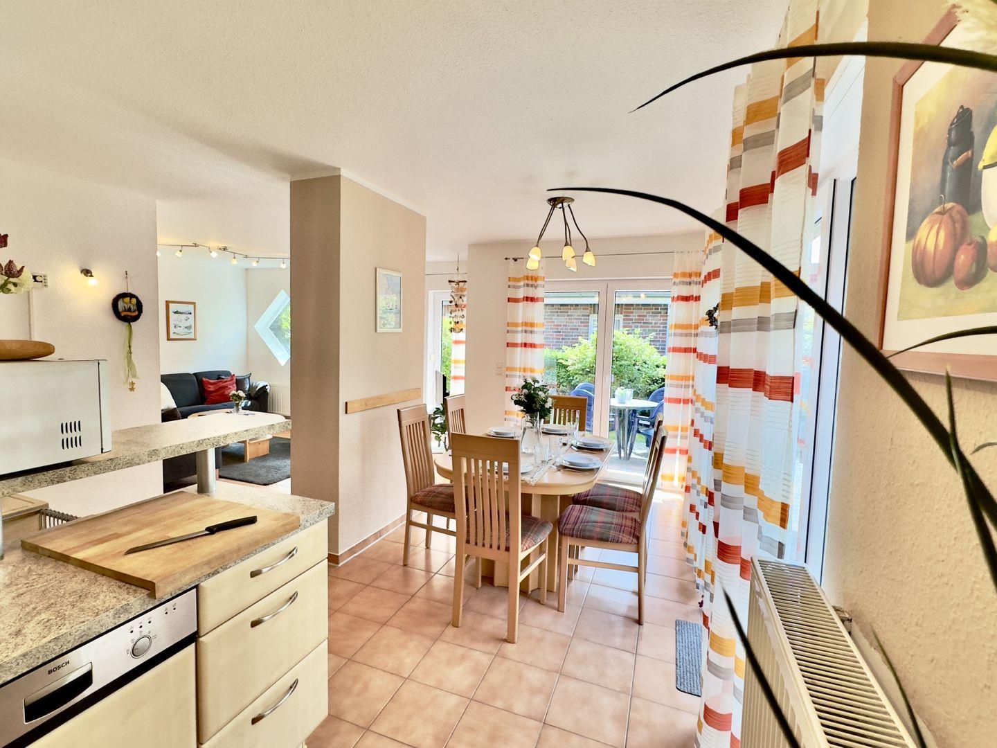 Betreten Sie das Haus durch den charmanten Eingangsbereich und lassen Sie sich vom lichtdurchfluteten Wohnbereich verzaubern. Die offene Küche mit moderner Einbauküche und Mikrowelle lädt zum gemeinsamen Kochen ein, während der große Esstisch das Herzstück für gesellige Mahlzeiten und schöne Gespräche bildet. Für entspannte Stunden sorgen die gemütliche Sofaecke, ein Ohrensessel und der Fernseher – perfekt für gemeinsame Filmabende. Ein Gäste-WC sowie ein praktischer Hauswirtschaftsraum mit Waschmaschine und Trockner machen Ihren Aufenthalt rundum komfortabel.