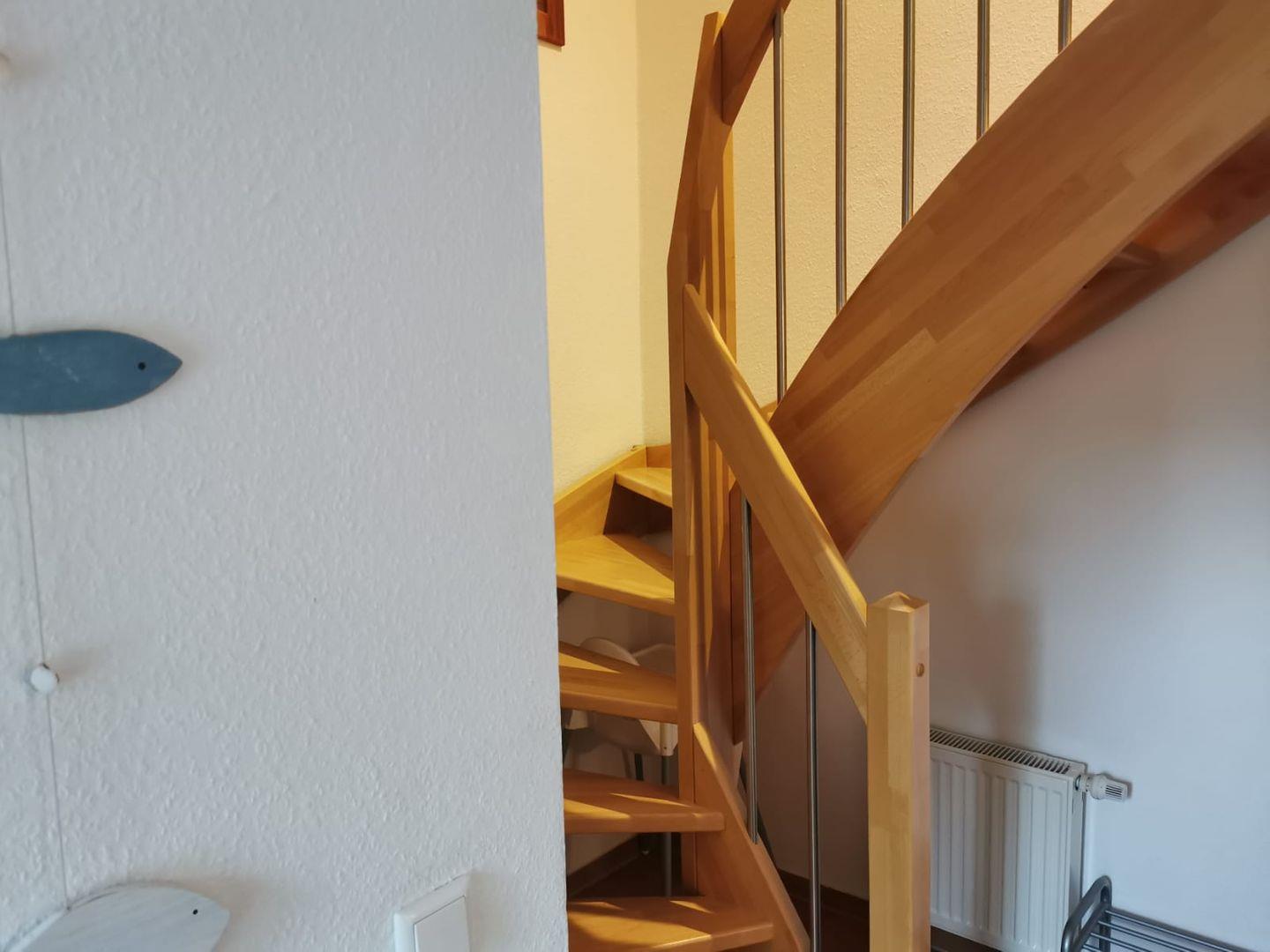 Über die helle Holztreppe gelangen Sie in die erste Etage, wo drei einladende Schlafzimmer auf Sie warten.