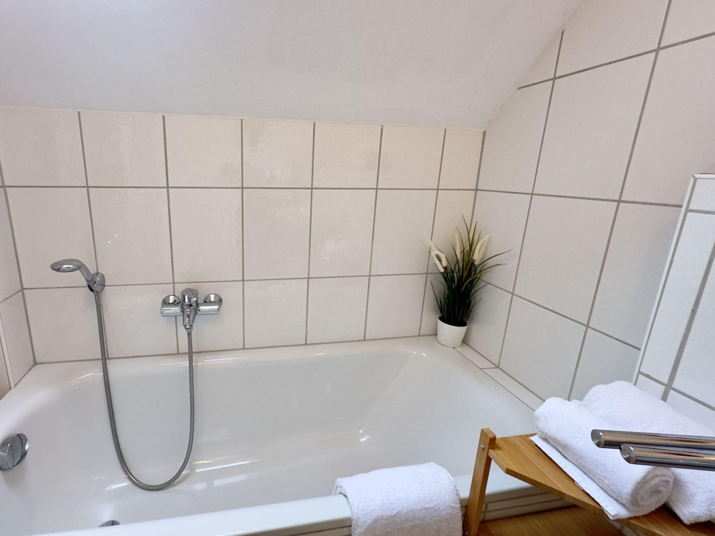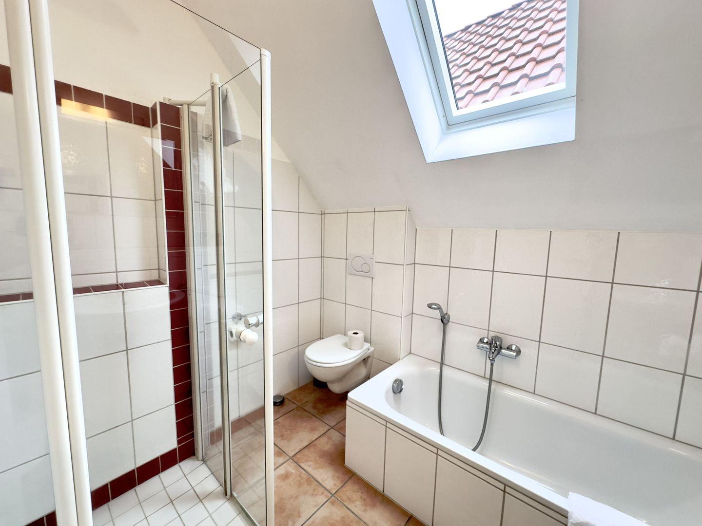 Im Badezimmer erwarten Sie Komfort und Helligkeit – mit Badewanne, Dusche und einem großen Spiegel, der den Raum noch großzügiger wirken lässt.