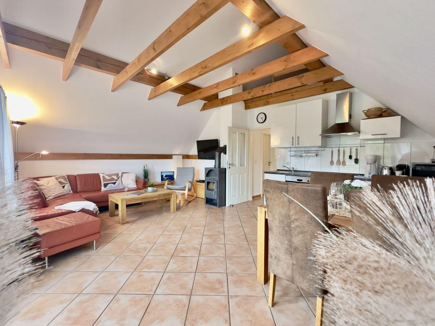 Das Wohnzimmer begeistert mit seinen hohen Decken und den charaktervollen Holzbalken, die den Raum mit einem besonderen nordischen Flair erfüllen. Große Fenster lassen die Sonne herein und tauchen die Wohnung in ein helles, einladendes Licht. In der gemütlichen Sofaecke vor dem Kamin lassen sich lange Abende mit guten Gesprächen oder einem Buch in aller Ruhe genießen. (Bitte beachten Sie: Kaminholz ist nicht in der Buchung enthalten.)