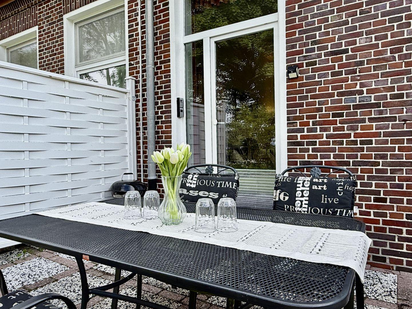 Das absolute Highlight der Wohnung ist die wunderschöne Terrasse mit Blick in die Natur und auf die Harle. Von hier aus können Sie bereits den Steg sehen, der mit einer Treppe zum direkten Baden einlädt – ein Paradies für Wasserratten und Naturliebhaber.