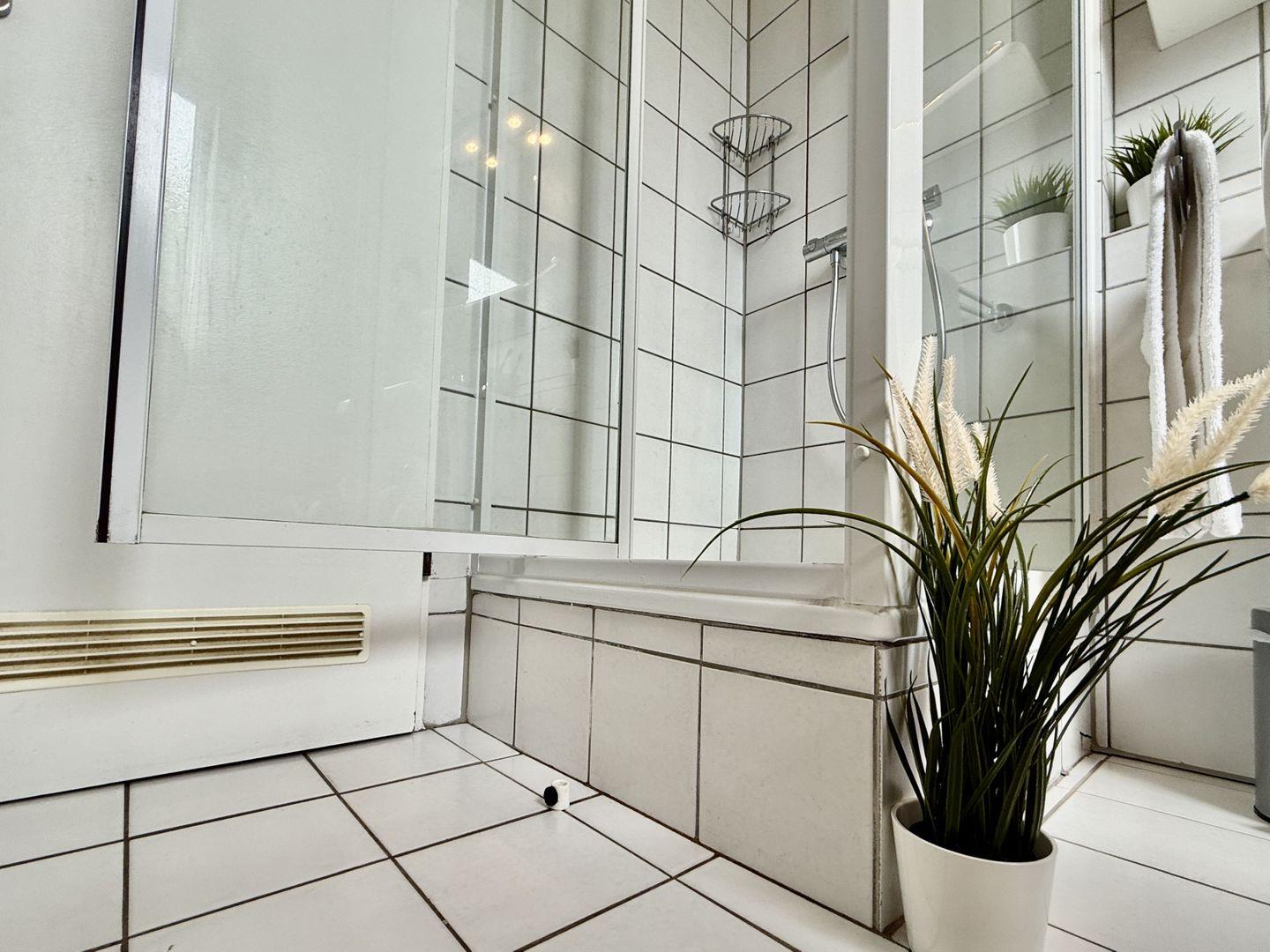 Das moderne, helle Badezimmer mit Dusche, Waschbecken und Fenster bietet Ihnen ausreichend Platz für Ihre morgendliche Routine.
