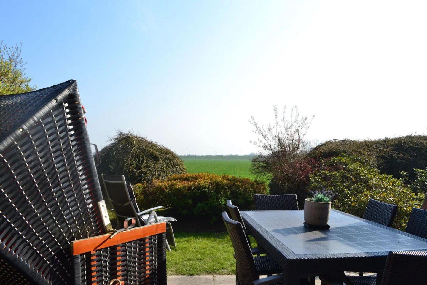 Genießen Sie den freien Blick in die Natur und entspannen Sie im Garten mit gemütlichen Sitzmöbeln. Ein ganz besonderes Highlight ist der hauseigene Strandkorb am Strand von Harlesiel, der Ihnen während Ihres Aufenthalts exklusiv zur Verfügung steht – perfekt, um die Nordseeluft zu genießen und entspannte Stunden direkt am Meer zu verbringen.
