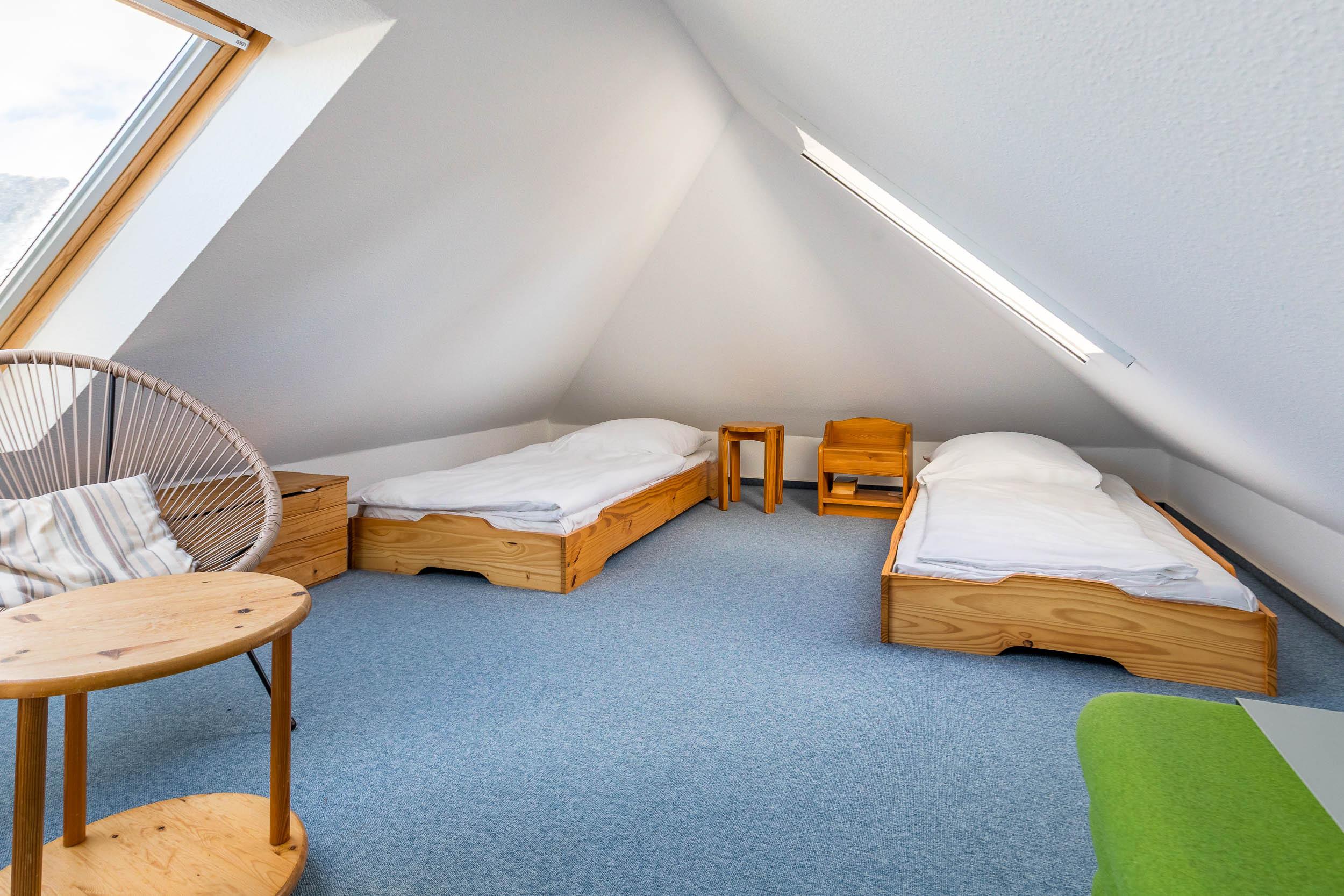Hier können Sie in der offenen Schlafgalerie in Urlaubsträumen schlummern. Zwei Einzelbetten sowie eine Urlaubsbibliothek mit Sitzecke stehen bereit.