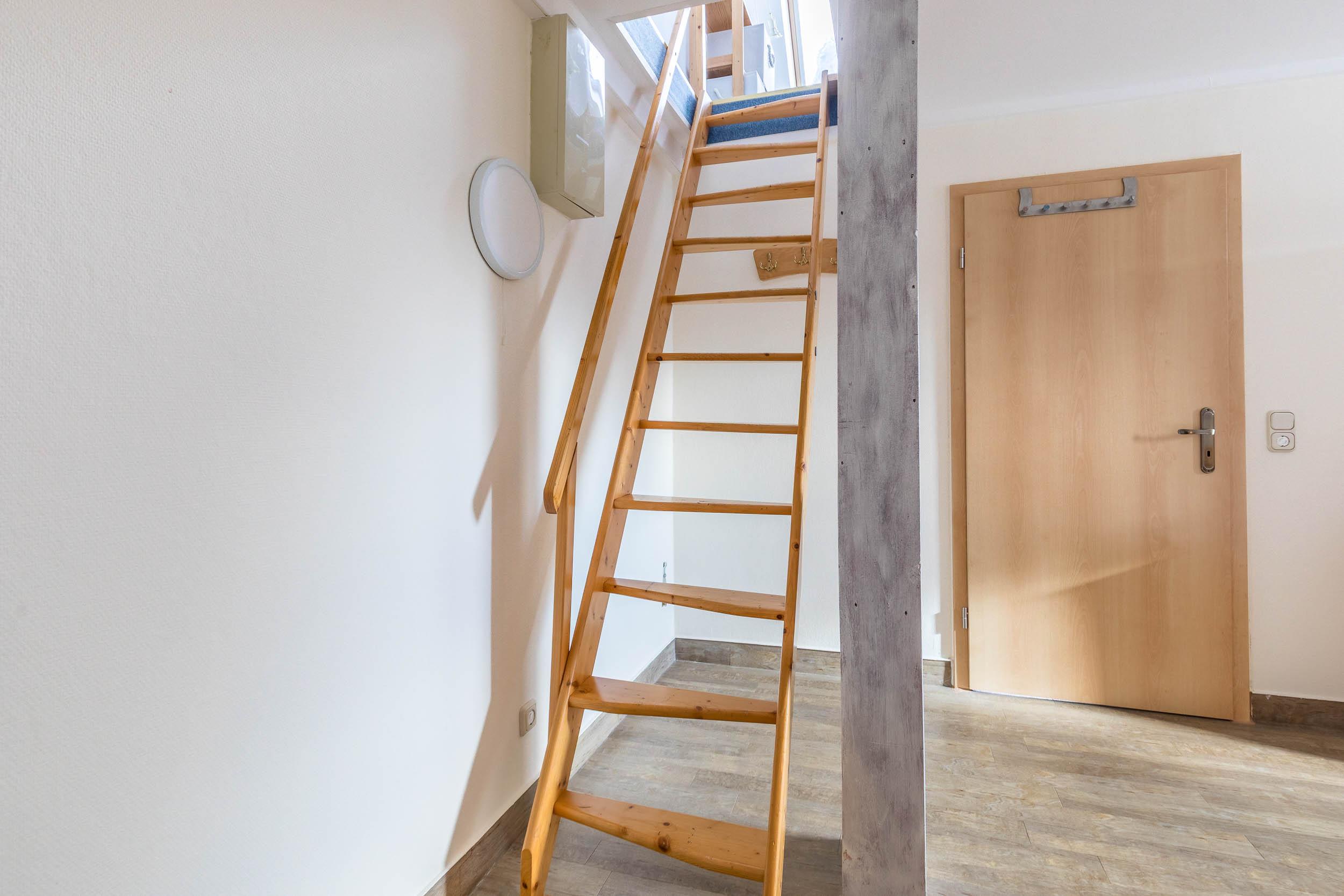 In der zweiten Ebene, im Dachgeschoss, welche Sie vom Schlafzimmer aus über eine offene Holztreppe erreichen, sorgen die schrägen Decken für Gemütlichkeit.