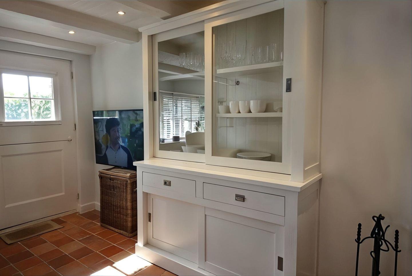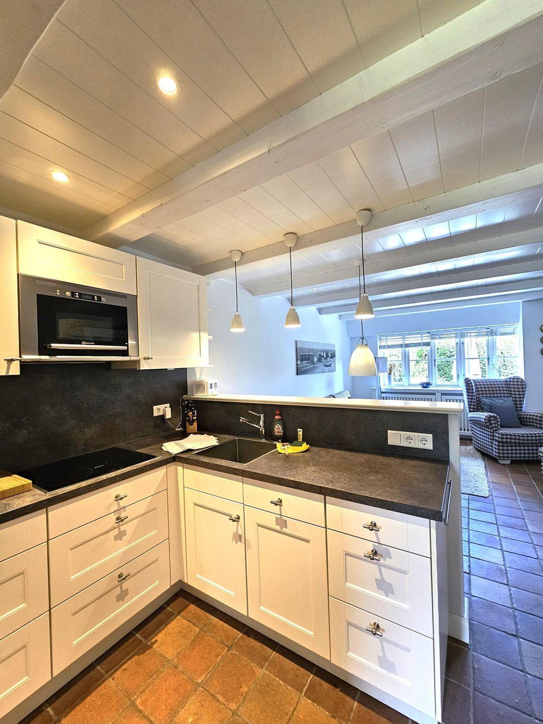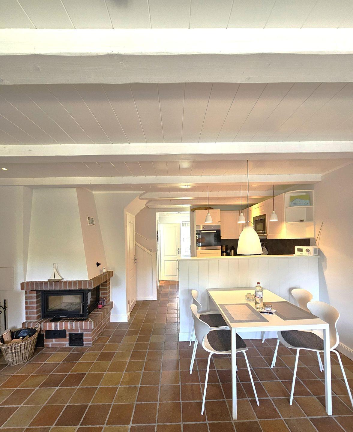 Der Wohnbereich ist mit einer offen zum Wohnzimmer gestalteten Küche verbunden und schafft damit eine angenehme, kommunikative Atmosphäre. Zur Ausstattung gehören ein Essbereich mit Esstisch, Sofa und Sessel sowie TV und Radio. Für behagliche Stunden steht Ihnen ein offener Kamin zur Verfügung – ideal, um den Tag entspannt ausklingen zu lassen. Internet und WLAN sind vorhanden.