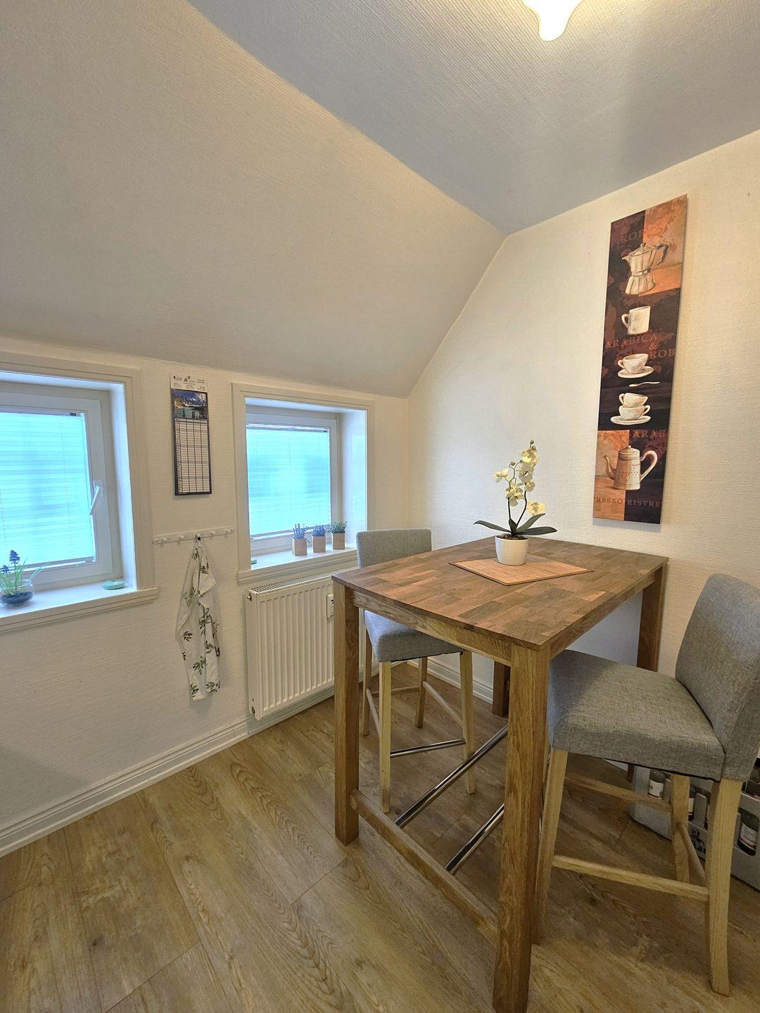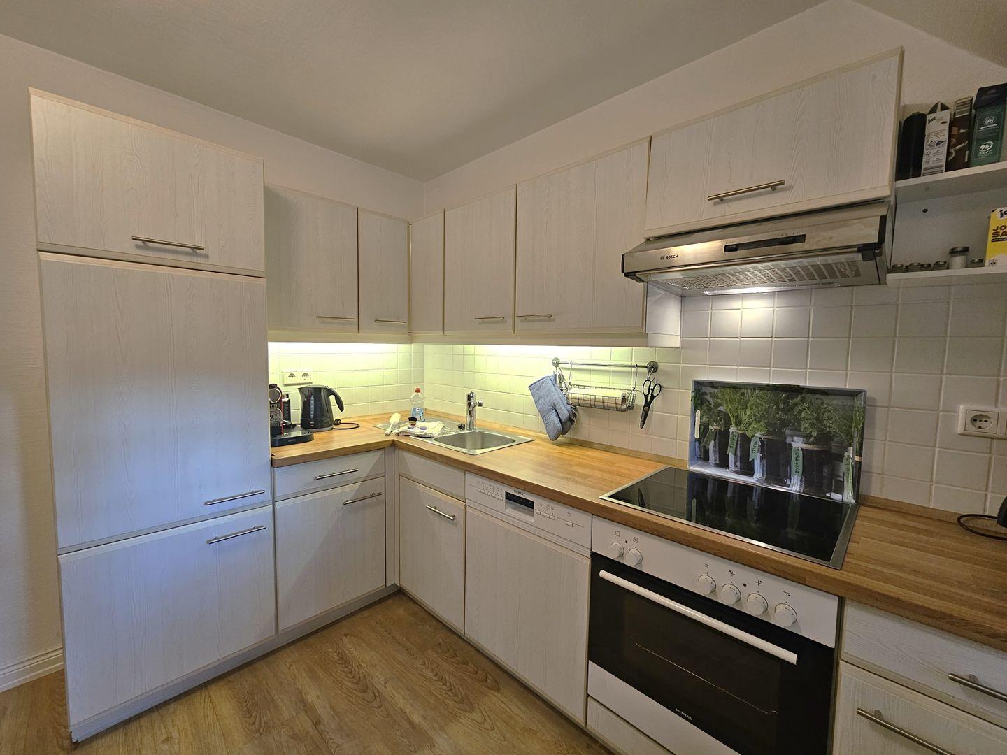 Die geschlossene Küche mit Esstisch und Essbereich ist vollständig auf die Selbstversorgung ausgerichtet. Zur Ausstattung gehören 4-Platten-Herd, Backofen, Kühlschrank mit Gefrierfach, Spülmaschine, Kaffeemaschine, Wasserkocher, Eierkocher sowie Küchenutensilien, Geschirr und Besteck. Damit sind sowohl das schnelle Frühstück als auch ein gemeinsames Abendessen am Esstisch problemlos möglich.