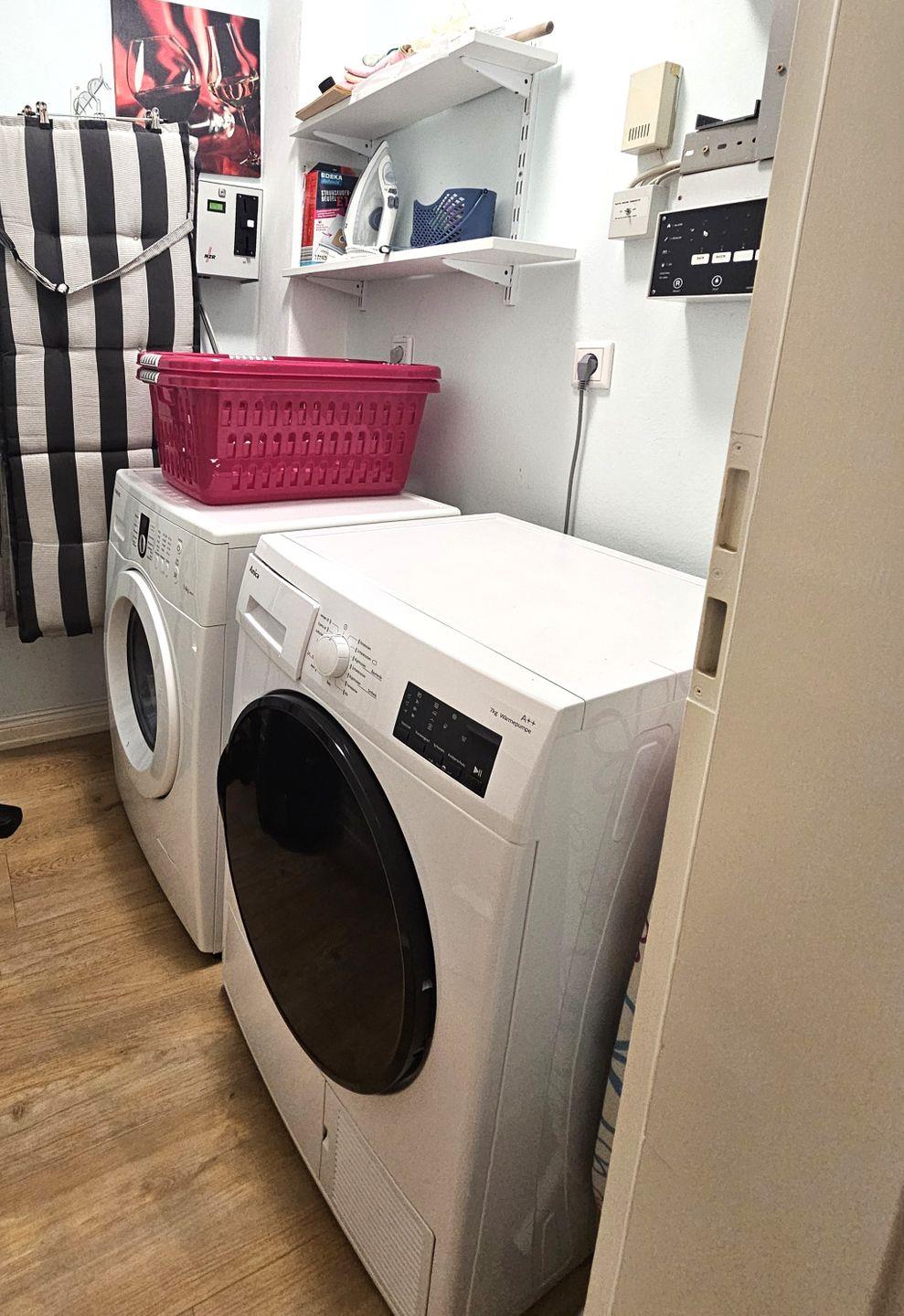 Das Badezimmer verfügt über WC, Waschbecken, Spiegel und eine Dusche. Ein Haartrockner ist vorhanden. Für längere Aufenthalte besonders praktisch: Waschmaschine und Trockner (gegen Gebühr) stehen zur Eigennutzung bereit; Bügeleisen und Bügelbrett ergänzen die Ausstattung. Bettwäsche und Handtücher sind inklusive, ebenso eine Erstausstattung. Staubsauger, Abfalleimer und Garderobe runden den Komfort ab.