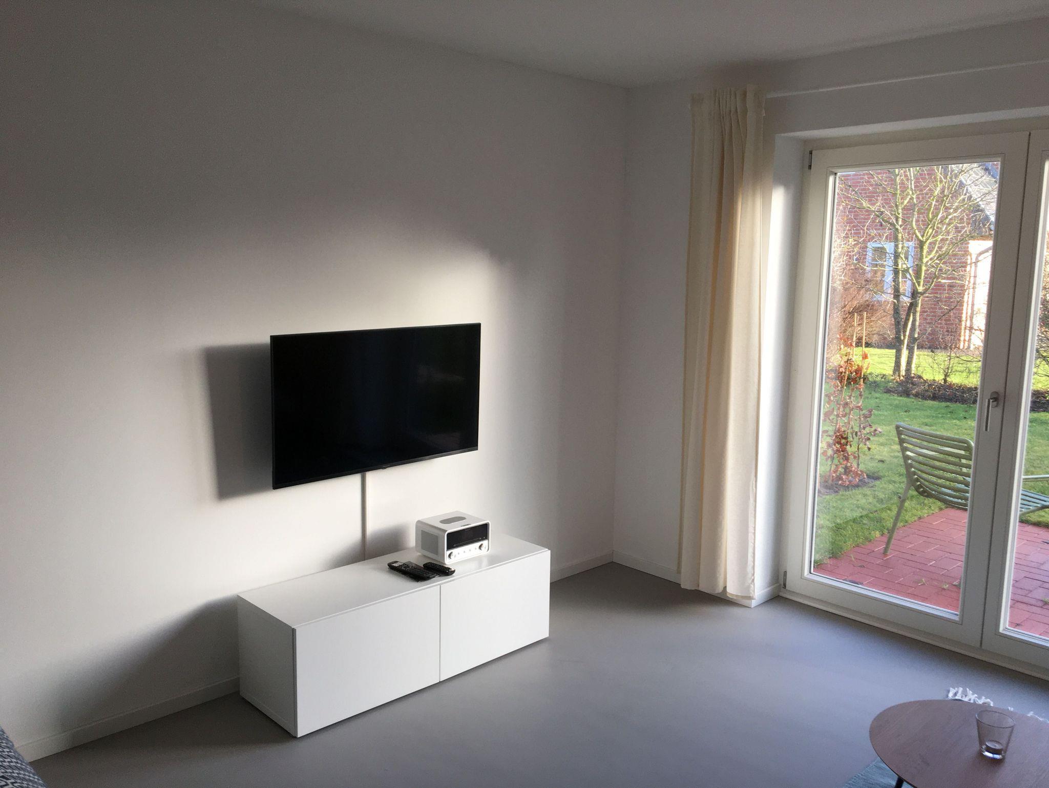 Für Unterhaltung sorgt ein Panasonic 43 Zoll Ultra HD TV, das mit einem Schwenkarm an der Wand montiert ist und so chilliges Fernsehen auch vom Bett aus ermöglicht. Ein Sound Wunder ist das DAB/Internetradio mit Bluetooth Streaming und Spotify Connect zum Abspielen von Playlists vom eigenen Smartphone. Das läßt sich durch einfaches Rauflegen auf das Radio kabellos wieder aufladen. Weitere Steckdosen mit Smartphone bzw USB Anschlüssen befinden sich im Raum.