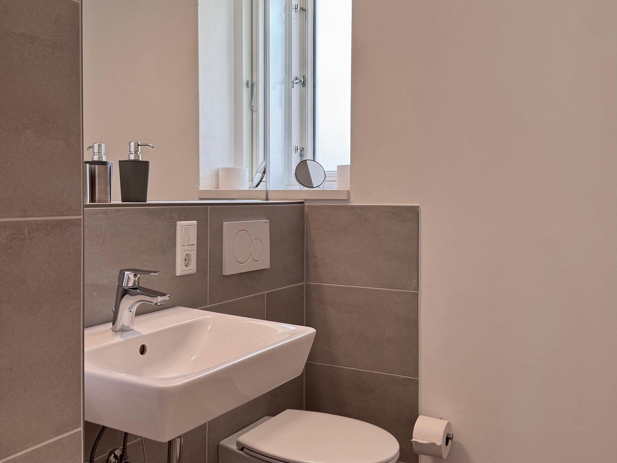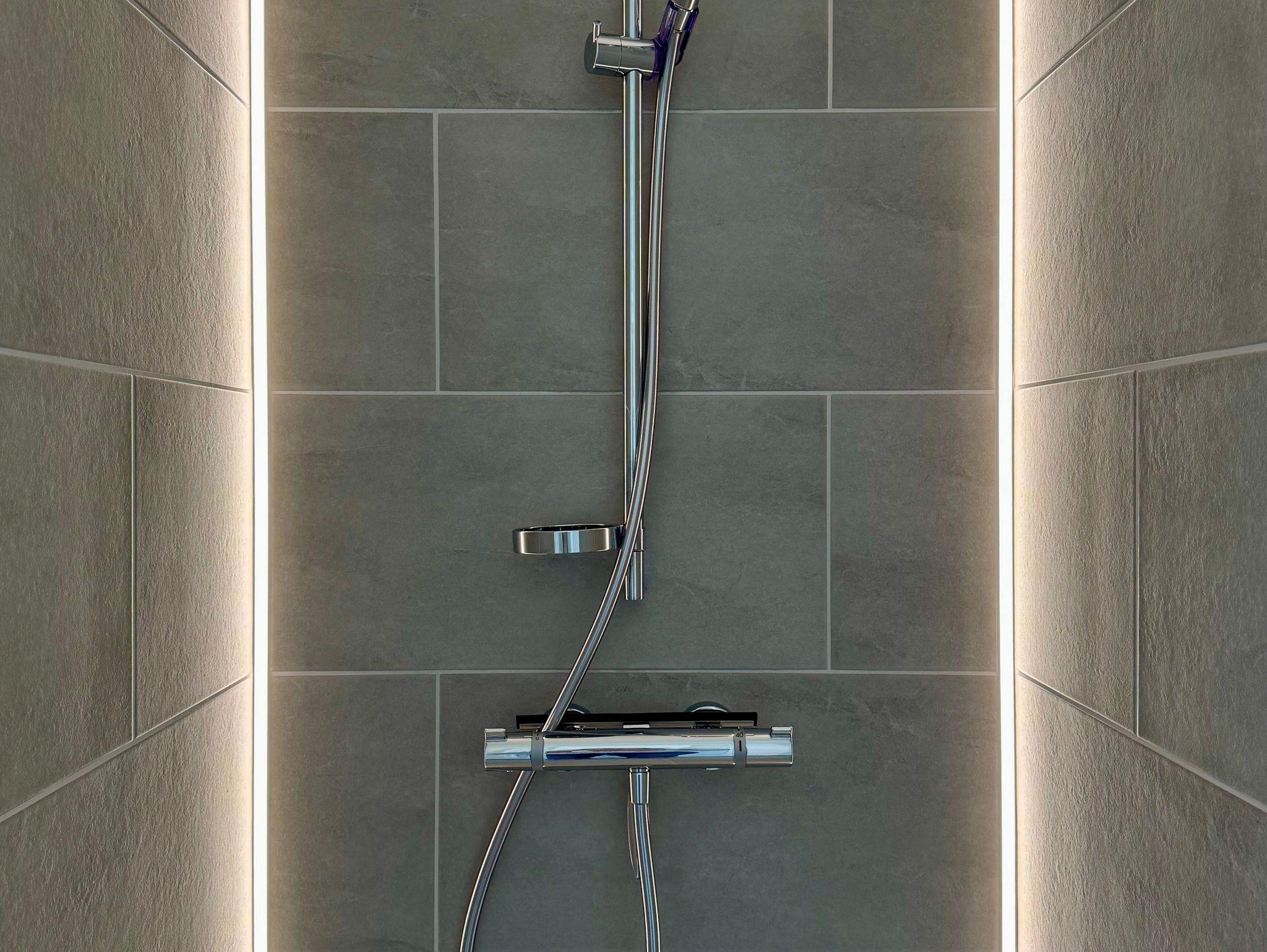 Zum Apartment gehört ein Badezimmer mit bodenebener Dusche. Für Licht sorgen im Duschbereich senkrechte Led - Lichtbänder. Ein elektrisch betriebener Badheizkörper trocknet bei Bedarf die Handtücher. Ein Waschtisch, ein WC, ein großer Spiegel, sowie ein Fenster für die Zufuhr frischer Luft runden das Bild ab.