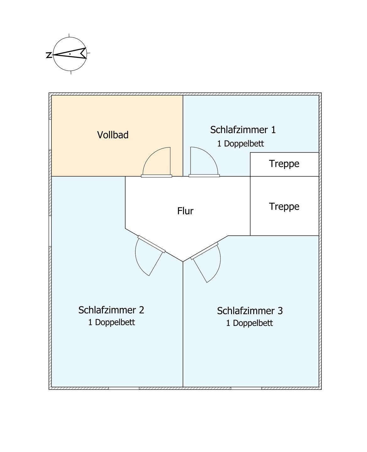 Im Obergeschoss befinden sich zwei Schlafzimmer mit jeweils einem Doppelbett und ein drittes Schlafzimmer, welches über ein gut für Kinder geeignetes Alkovenbett verfügt (ein neben der Treppe eingebautes Bett mit zwei nebeneinander liegenden Matratzen 80x200cm). Von dem dritten Schlafzimmer gelangen Sie ins Dachgeschoss, wo noch ein Tagesbett zu finden ist. Eine Tür zwischen Dachgeschoss und Schlafzimmer 3 gibt es nicht. Im 1. OG befindet sich das größere der beiden Bäder, welches neben einer Dusche auch eine Badewanne enthält.