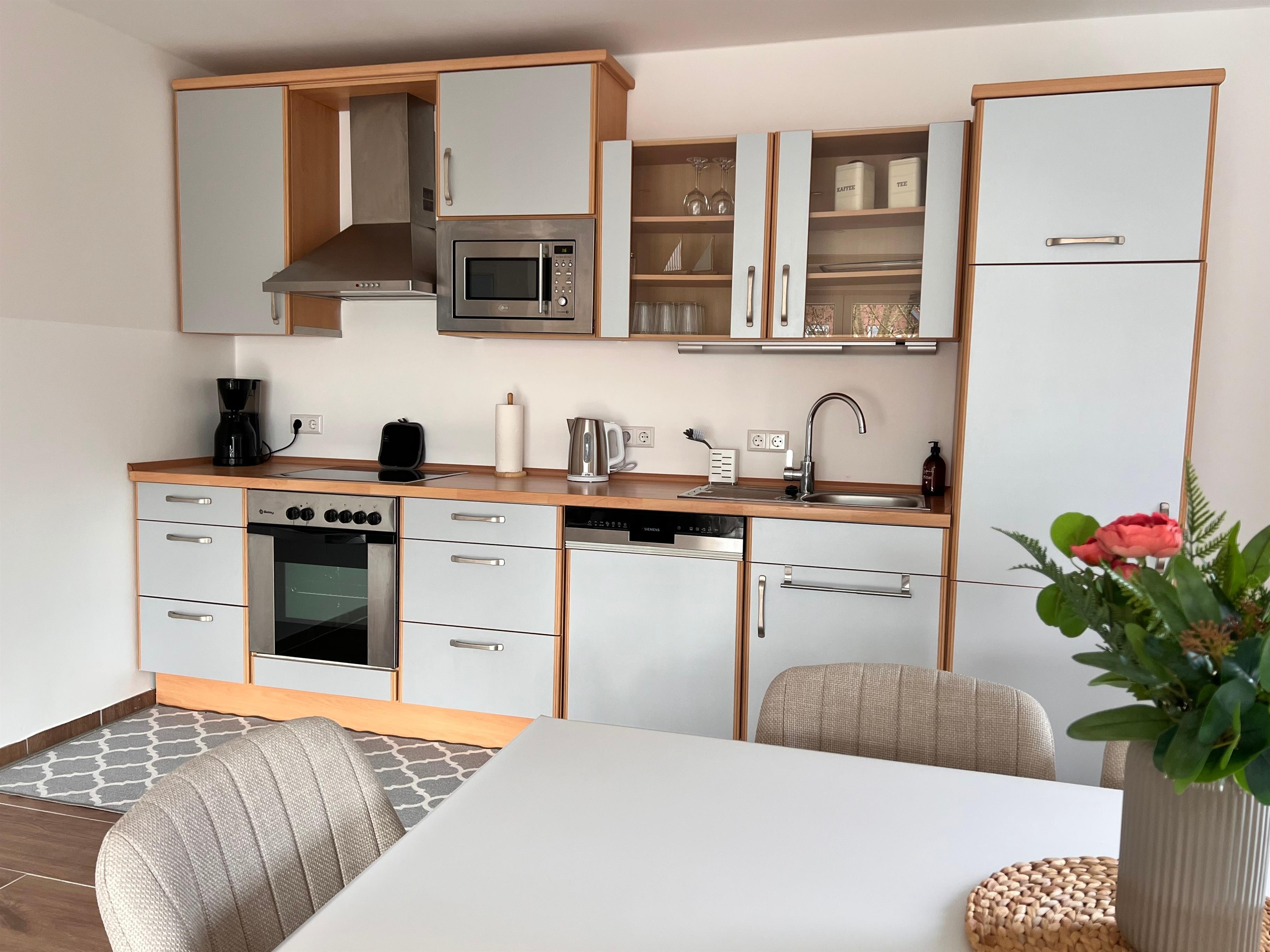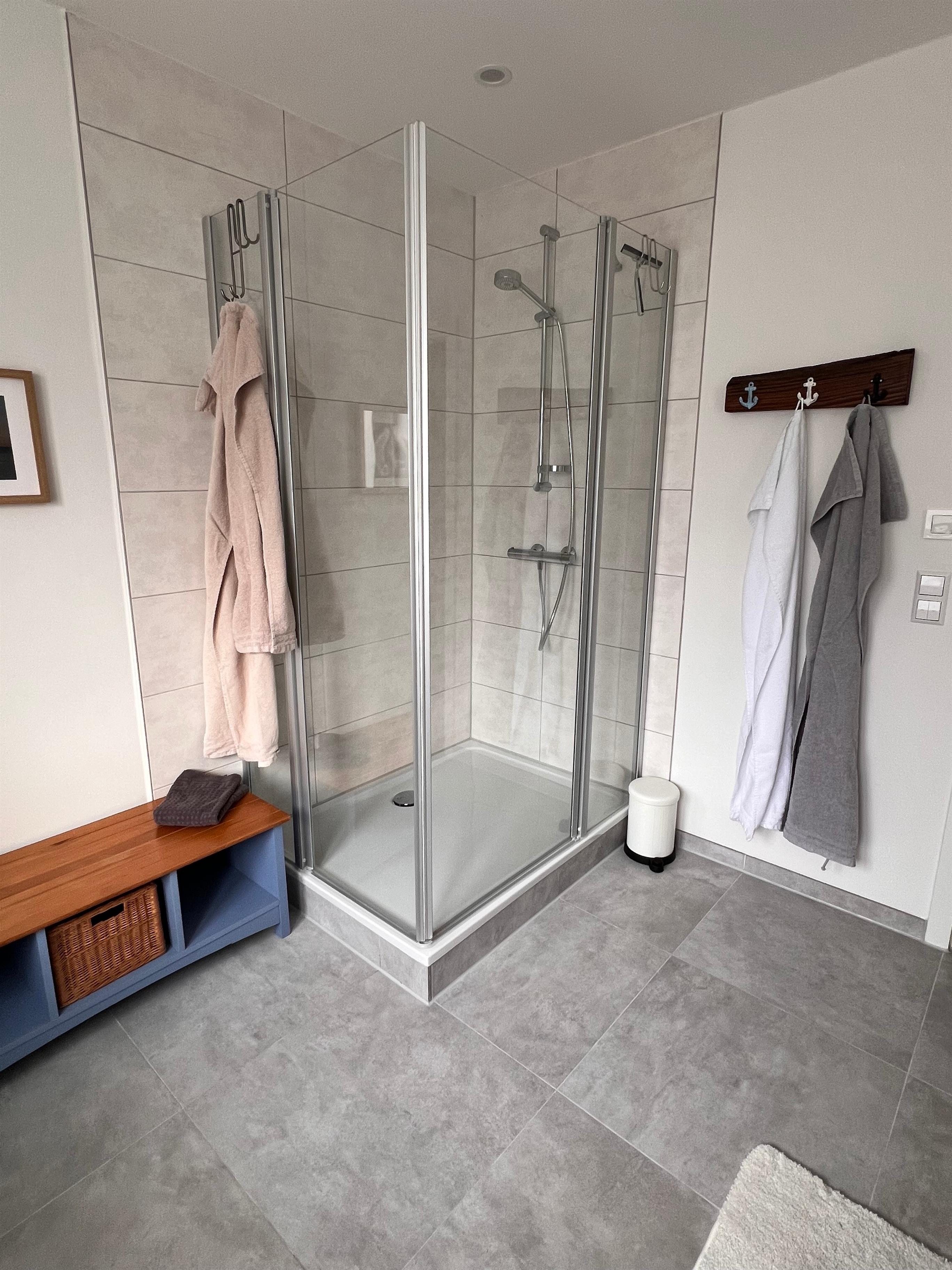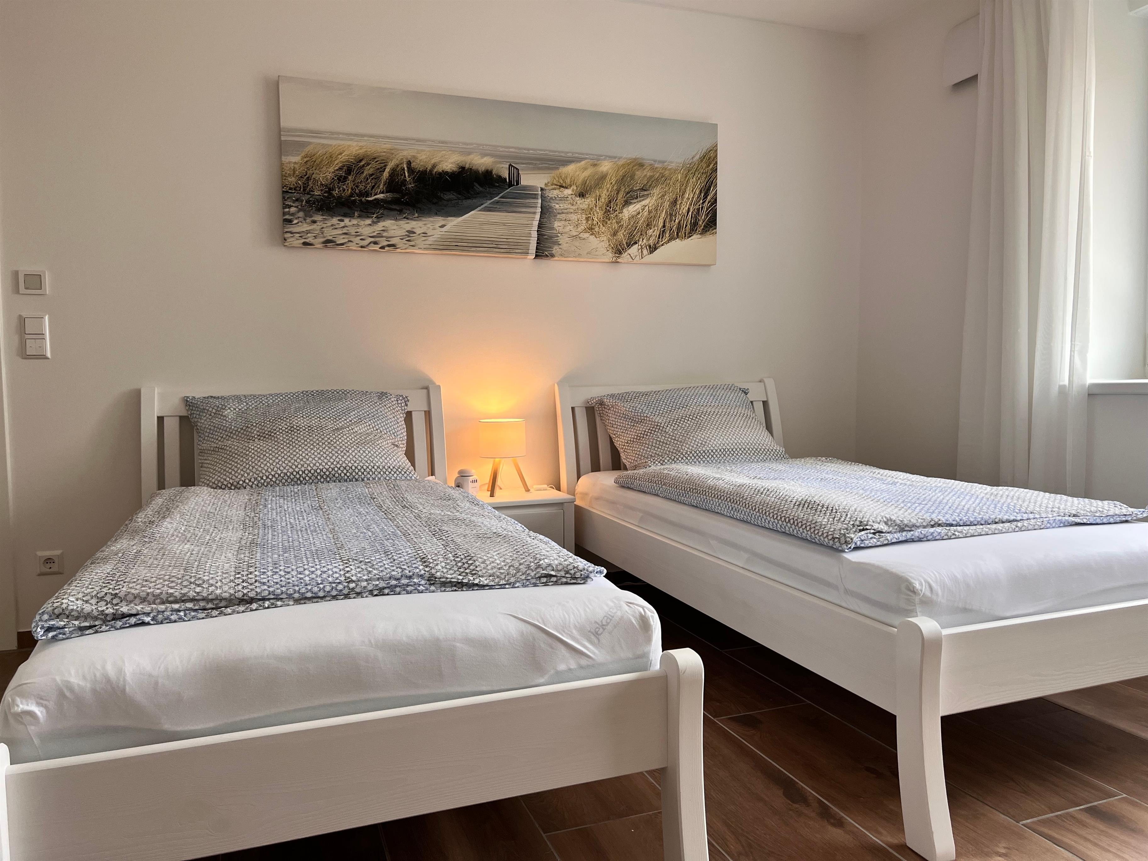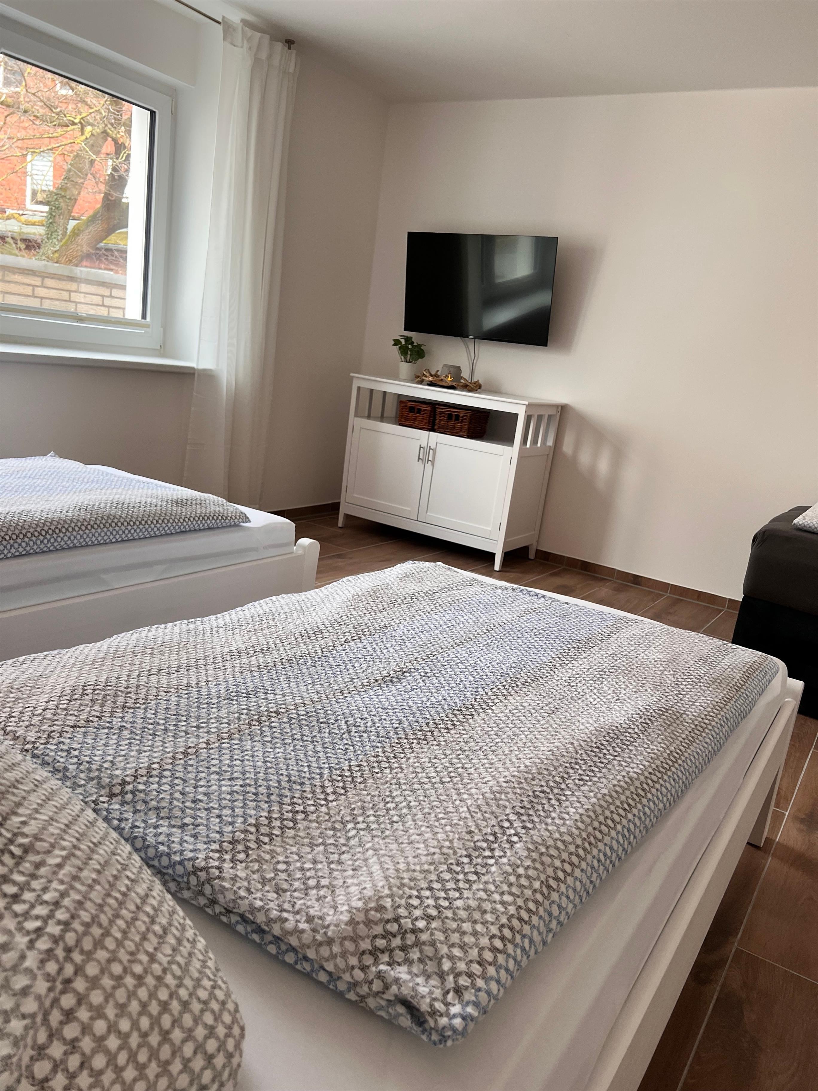 Die 96 qm große Ferienwohnung im Erdgeschoss wurde im Jahr 2022 frisch saniert und im Jahr 2026 renoviert. Sie bietet Platz für bis zu 5 Urlauber. Sie hat eine große Terrasse mit Blick in die umliegenden Gärten. Die Wohnung verfügt über einen geräumigen, lichtdurchfluteten Wohn-/Essbereich mit einer voll ausgestatteten Küchenzeile, Flat-TV, und freiem WLAN. Das behagliche Haupt-Schlafzimmer wartet mit einem großen Boxspringbett (180x200), mit zwei Härtegraden (H3,H4) auf. Das zweite Schlafzimmer ist mit zwei Einzelbetten (100x200) und einem Boxspringbett (120x200) ausgestattet. Es verfügt über einen eigenen Fernseher. Sollten Ehepaare die Wohnung buchen und beide Schlafzimmer nutzen wollen, teilen Sie dies bitte bei der Buchung mit. Auf Wunsch kann ein Kinderreisebett und ein Hochstuhl bereitgestellt werden (bitte vorher mitteilen). Für regnerische Tage liegen einige Spiele oder auch Bücher parat. Sollten Sie mal länger bleiben, oder etwas zu waschen haben, steht eine Waschmaschine bereit. Das moderne Badezimmer verfügt über eine große Dusche und rundet das Wohlfühlpaket gekonnt ab.