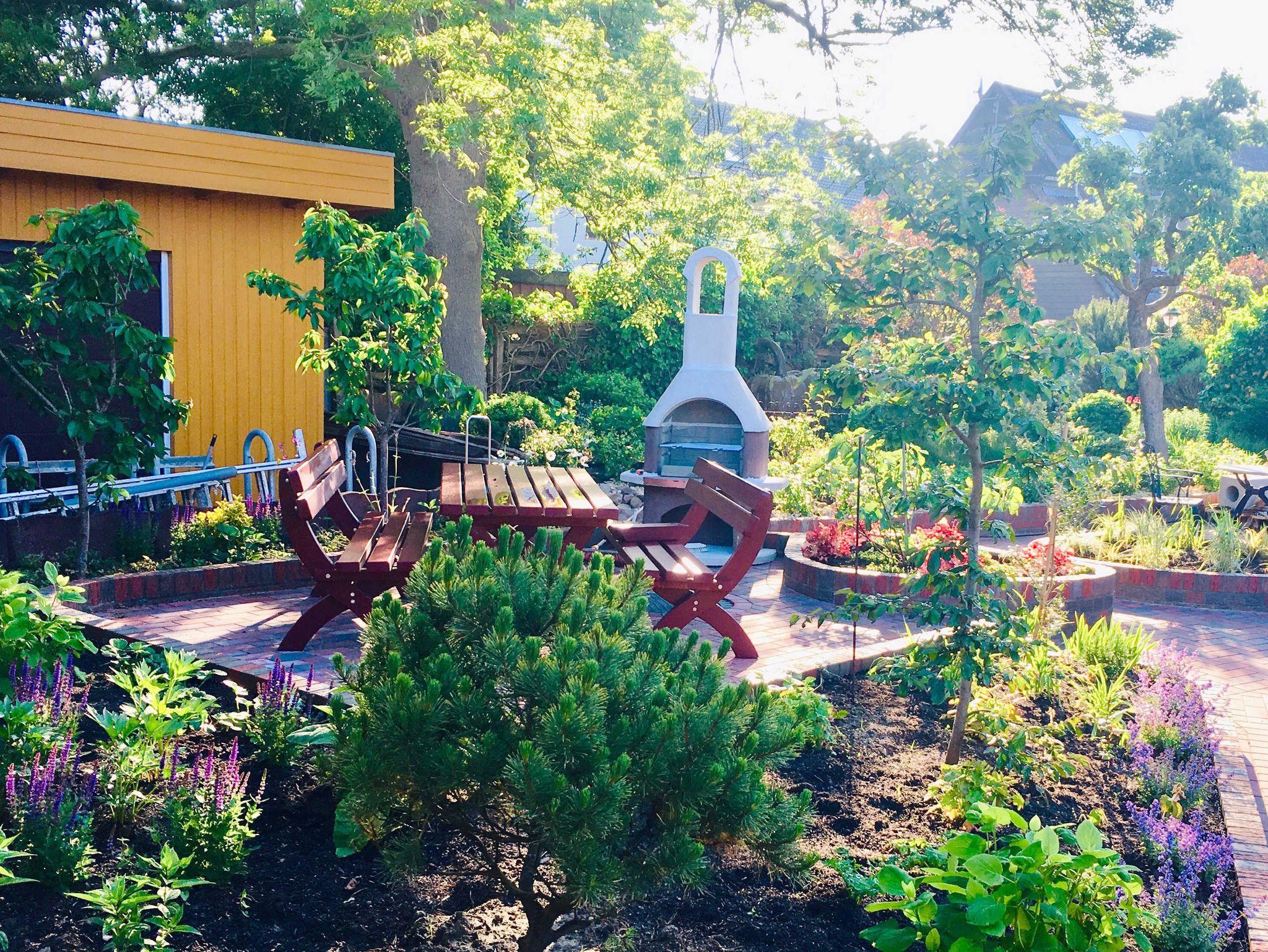 Für unsere Gäste gibt es PKW-Stellplätze, eine Fahrradgarage, eine überdachte Terrasse und einen Garten mit lauschigen Sitzplätzen und einem Grillplatz.