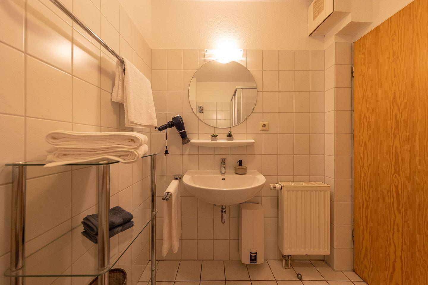 Die Wohnküche ist offen integriert und bestens ausgestattet, ideal für Familienmahlzeiten oder ein schnelles Frühstück vor dem nächsten Nordseespaziergang. Das moderne Bad mit Dusche sorgt für einen entspannten Start in den Tag. Laminat in den Wohnräumen, Fliesen in Küche und Bad: alles klar und gepflegt.
