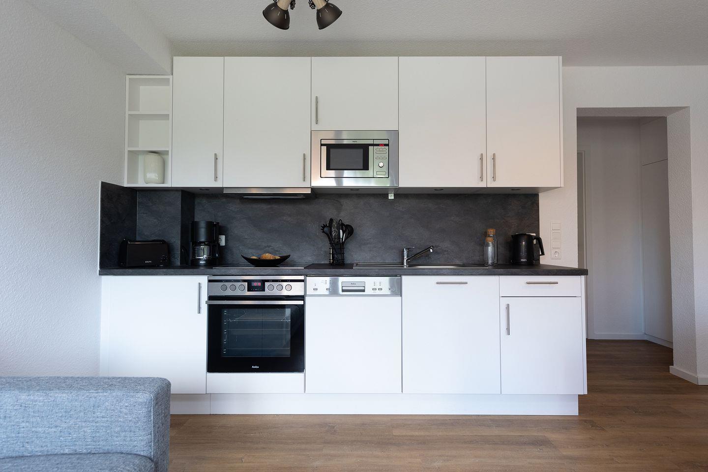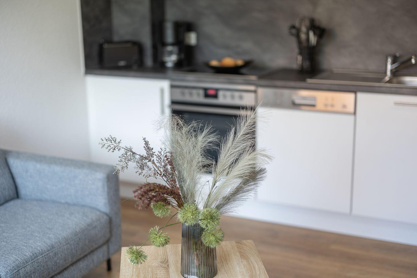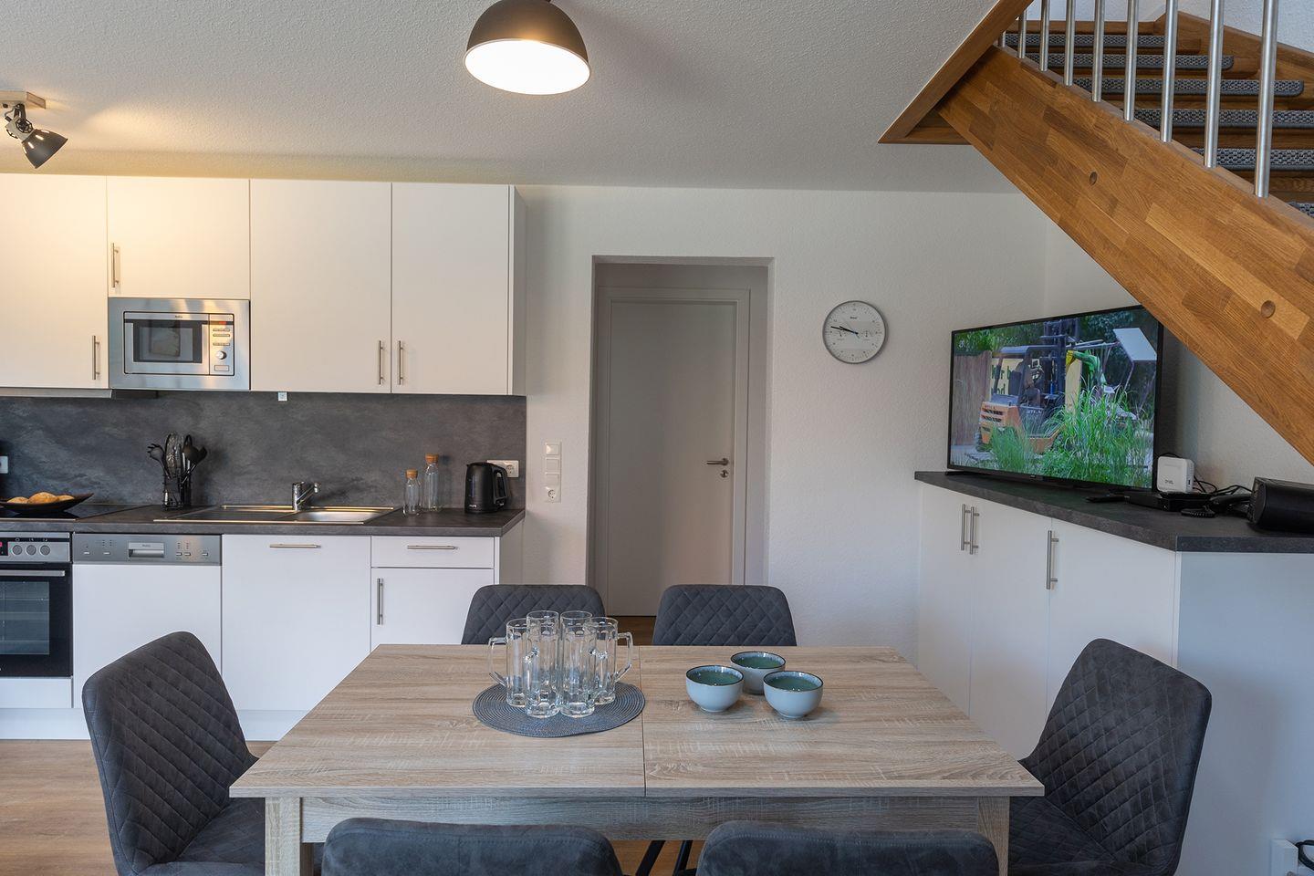 Im Erdgeschoss: ein heller Wohn-Essbereich mit gemütlicher Wohnlandschaft, offener Küche, Esstisch und Gäste-WC, sowie ein Schlafzimmer mit Doppelbett. Im Obergeschoss: zwei Schlafzimmer – mit Doppelbett – sowie ein Duschbad. Alle Schlafräume können verdunkelt werden und sind mit Laminat ausgelegt. Fußbodenheizung und automatische Be- und Entlüftung sorgen für ein angenehmes Raumklima.