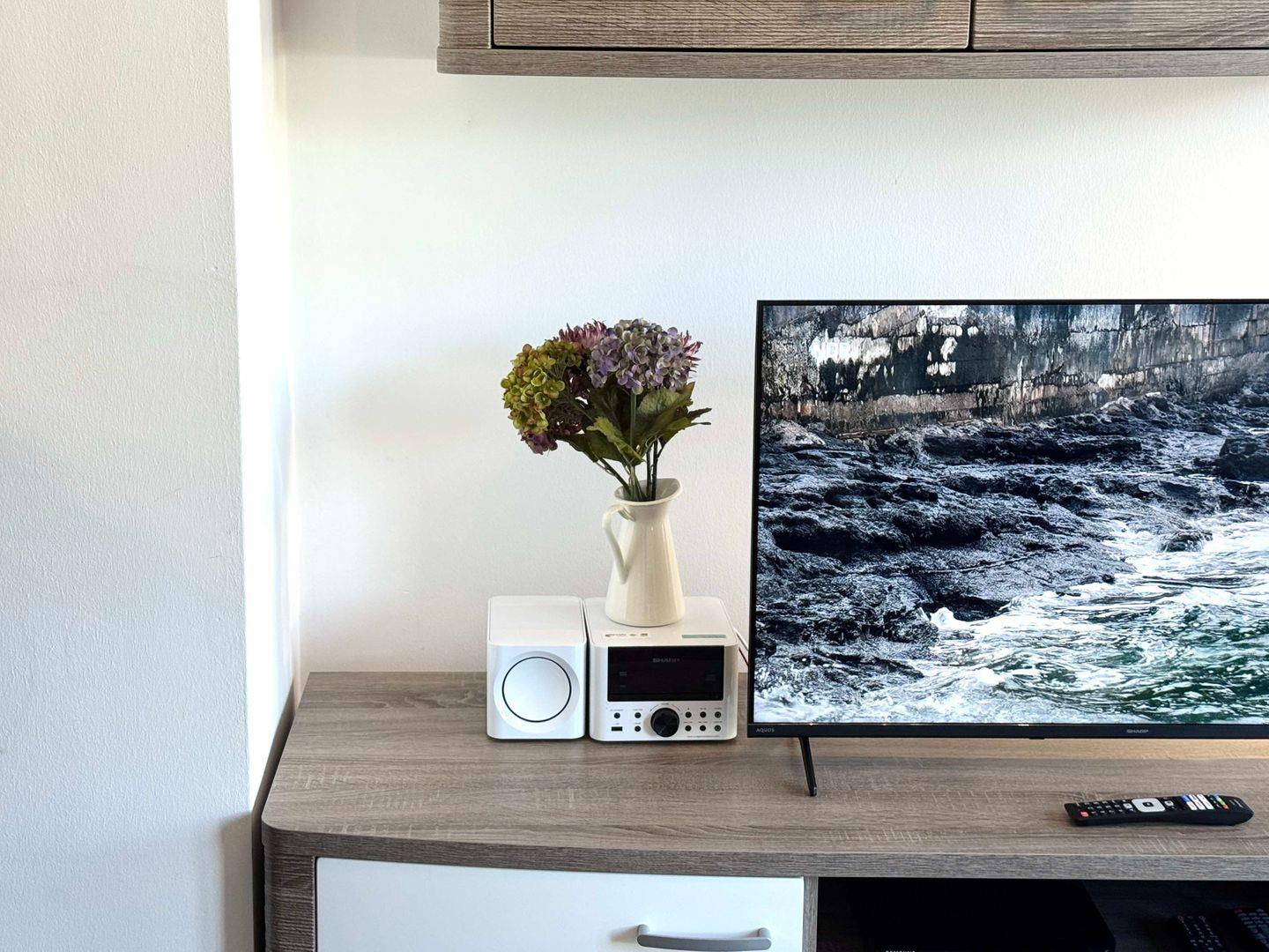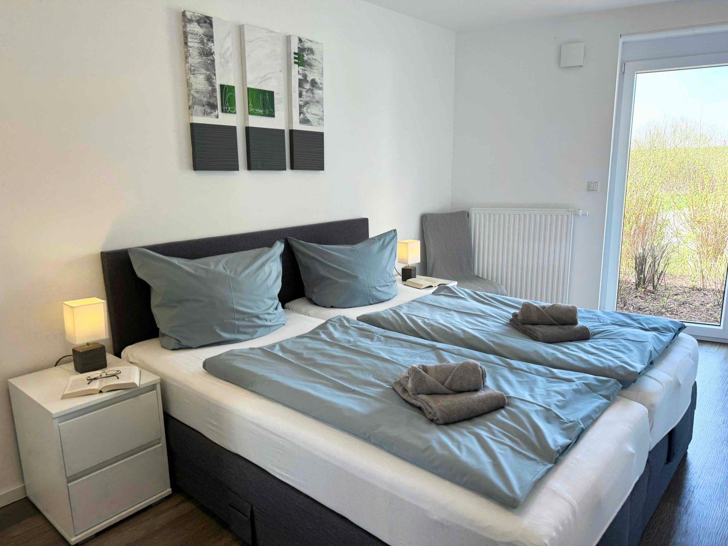 Im Schlafzimmer erwartet dich ein komfortables Boxspring-Doppelbett (zwei Matratze je 0,90 m x 2,00 m), Nachttische und ein Kleiderschrank. Das zweite Schlafzimmer bietet ein Einzelbett ( Matratze 0,90 m x 2,00 m), einen Schlafsessel und einen weiteren Flachbild-TV.