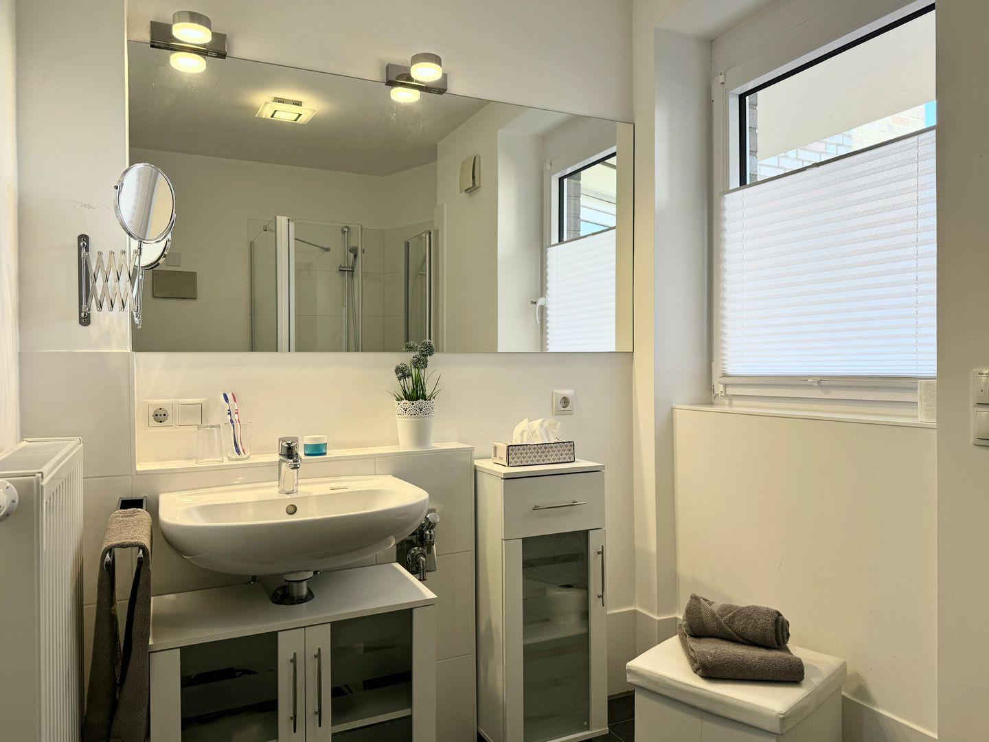 Das moderne Duschbad ist ausgestattet mit einem Waschtisch, einer ebenerdigen Dusche, Föhn und Fenster.