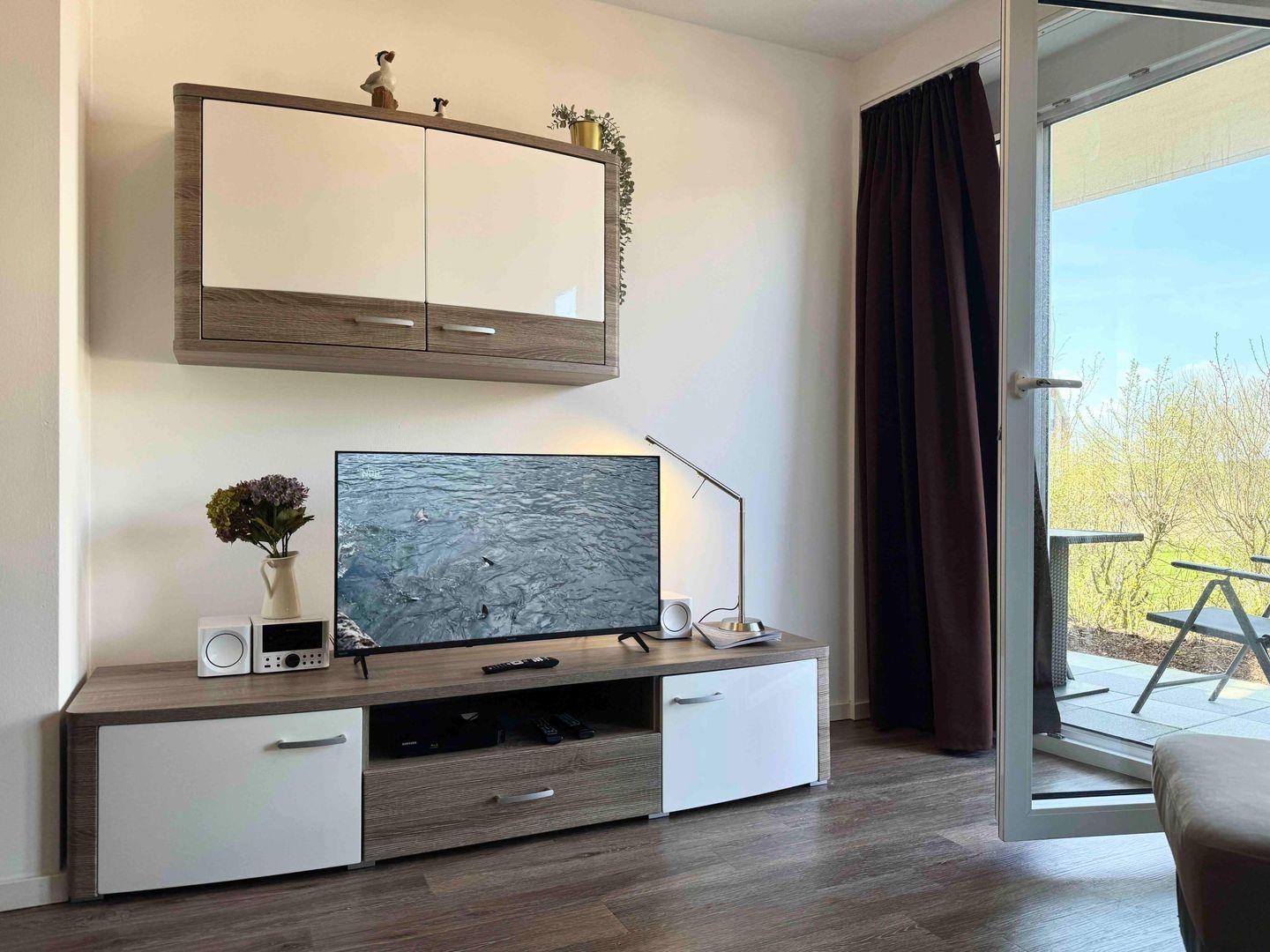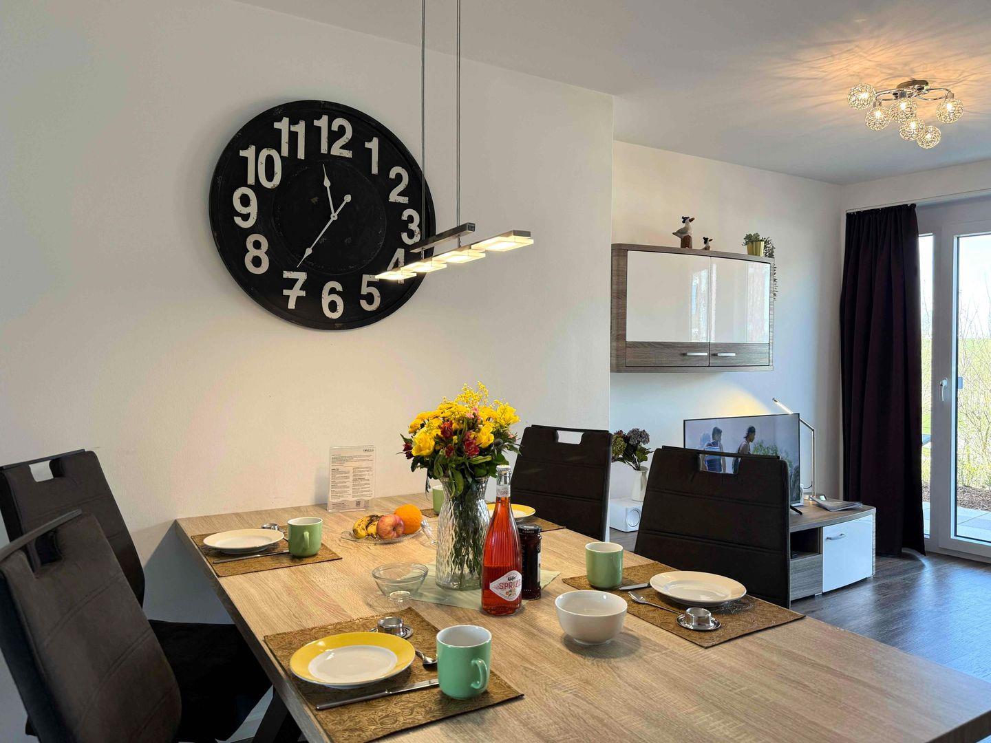 Das helle und modern eingerichtete Wohnzimmer mit gemütlicher Sitzgarnitur, Flachbild-TV, DVD-Player und einer Essecke mit großem Esstisch sorgt für eine angenehme Atmosphäre. Die offene Küche ist vollständig ausgestattet, damit du deine Mahlzeiten bequem zubereiten kannst.