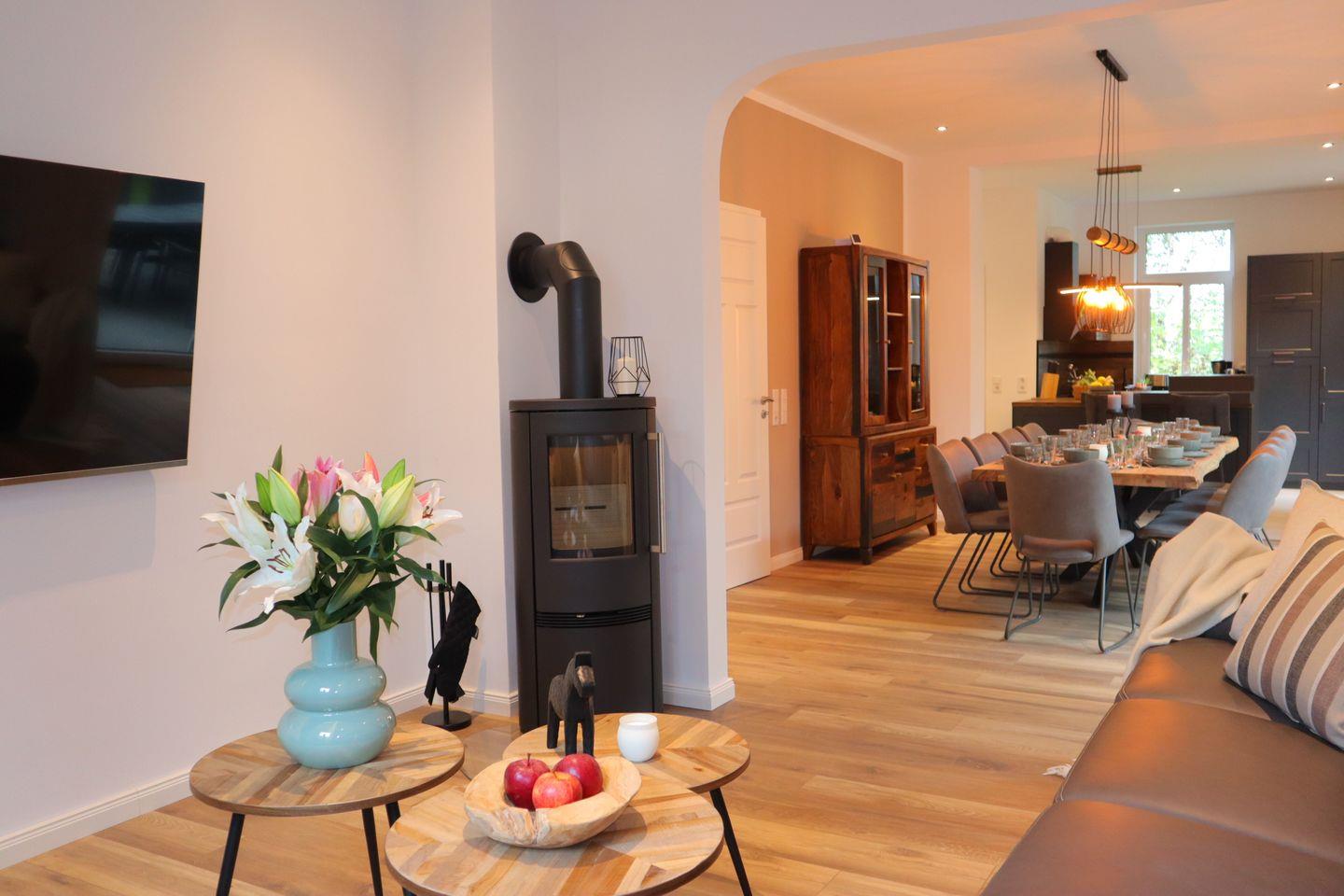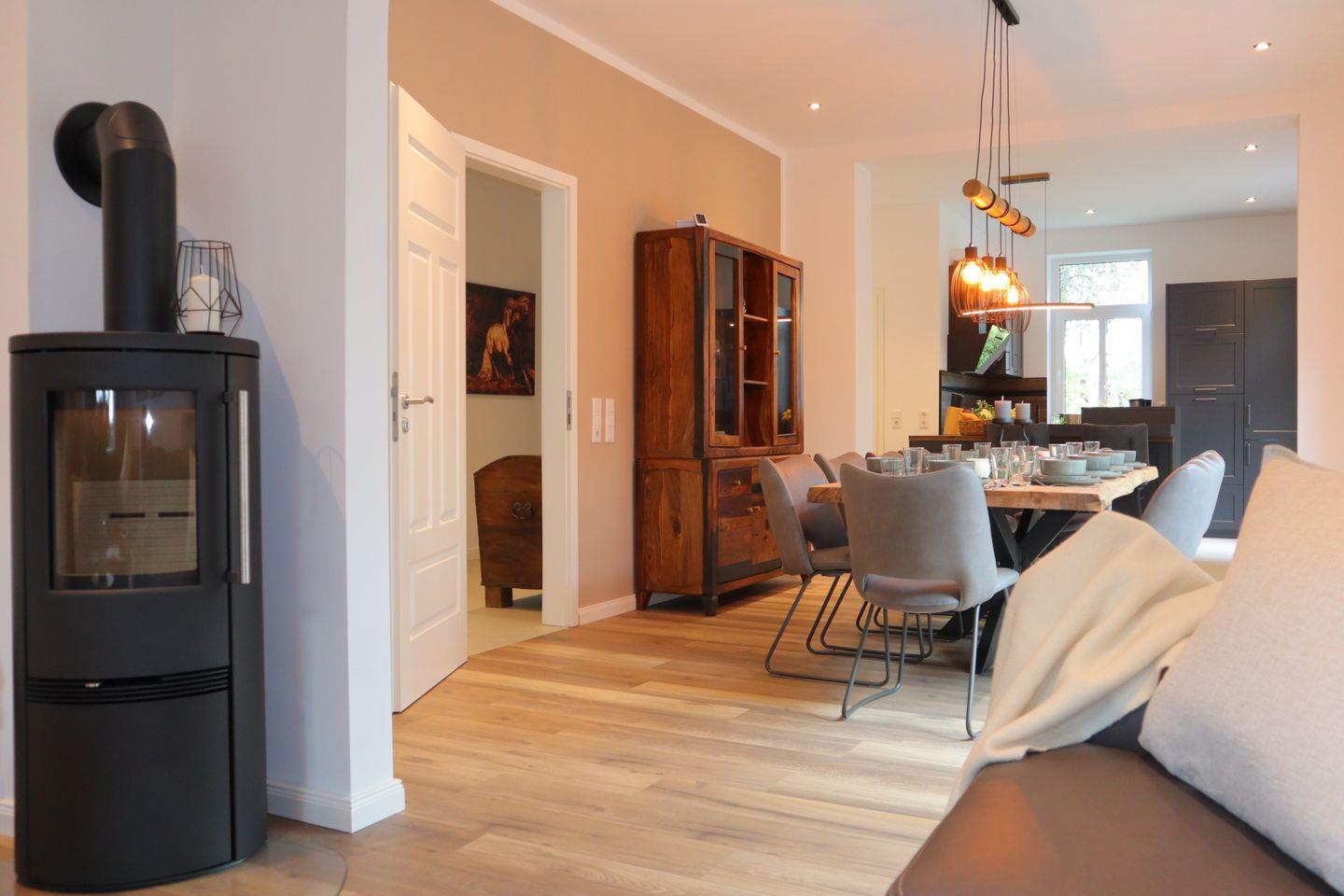 Der Kamin bildet das Herz des Hauses – ein Ort, an dem man gerne zusammen kommt um den Abend bei sanftem Licht ausklingen zu lassen. Die moderne, hochwertig ausgestattete Küche fügt sich nahtlos in das Ambiente ein und schafft Raum zum gemeinsamen Genießen.