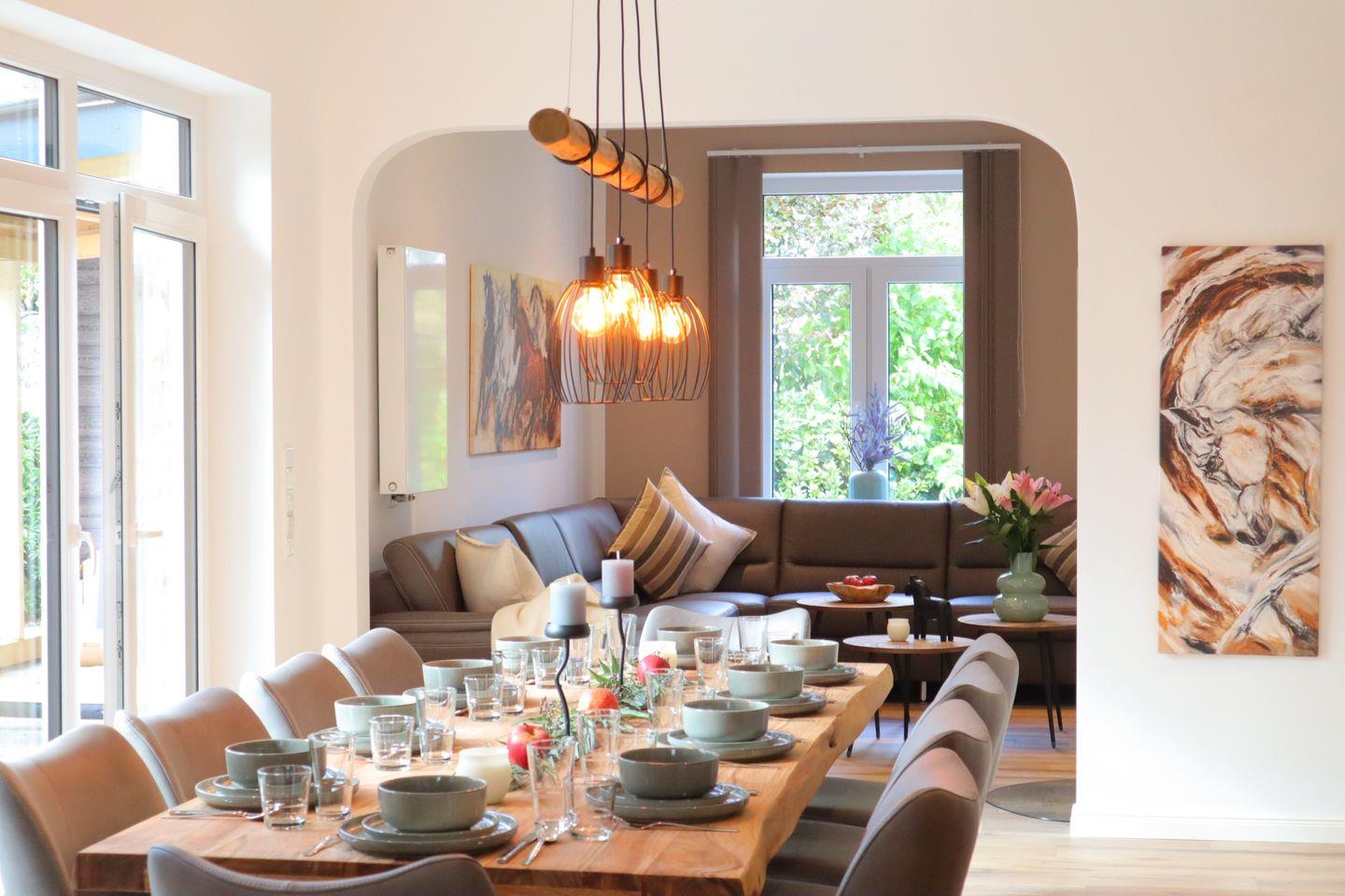 Im offenen Wohn- und Essbereich treffen hochwertige Materialien auf zeitlose Eleganz und natürliche Wärme.