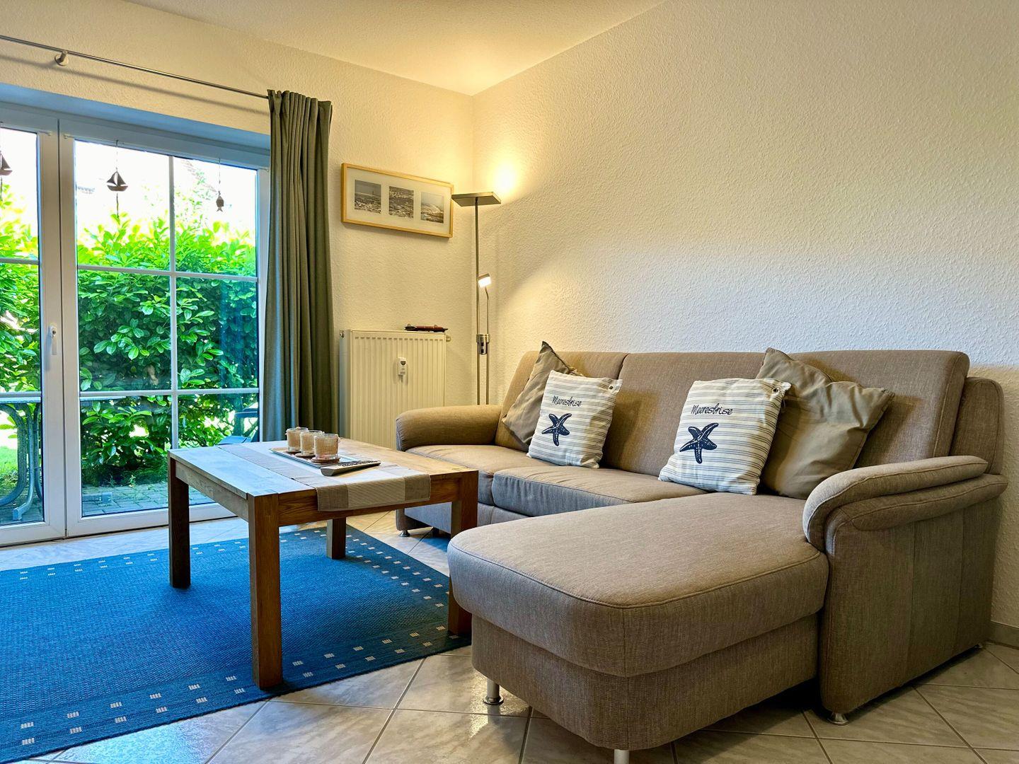 Unsere liebevoll eingerichtete, ebenerdige Einzimmerwohnung ist der perfekte Rückzugsort für erholsame Urlaubstage am Meer. Der kombinierte Wohn- und Schlafbereich ist gemütlich gestaltet und verfügt über ein bequemes Doppelbett (1,80 x 2,00 m) sowie eine zusätzliche Sofaecke zum Entspannen.