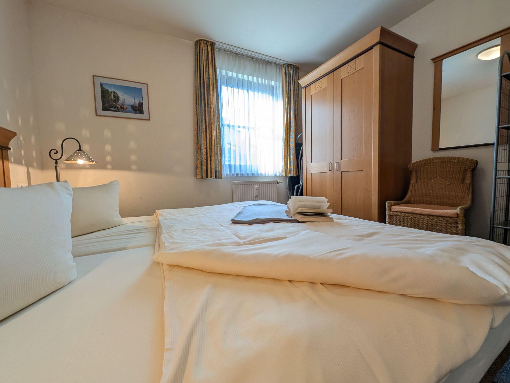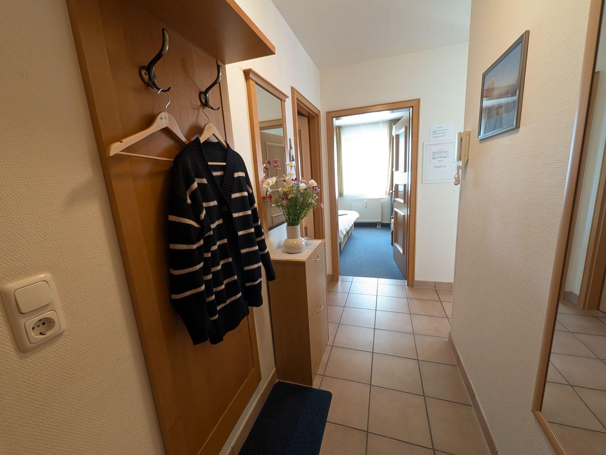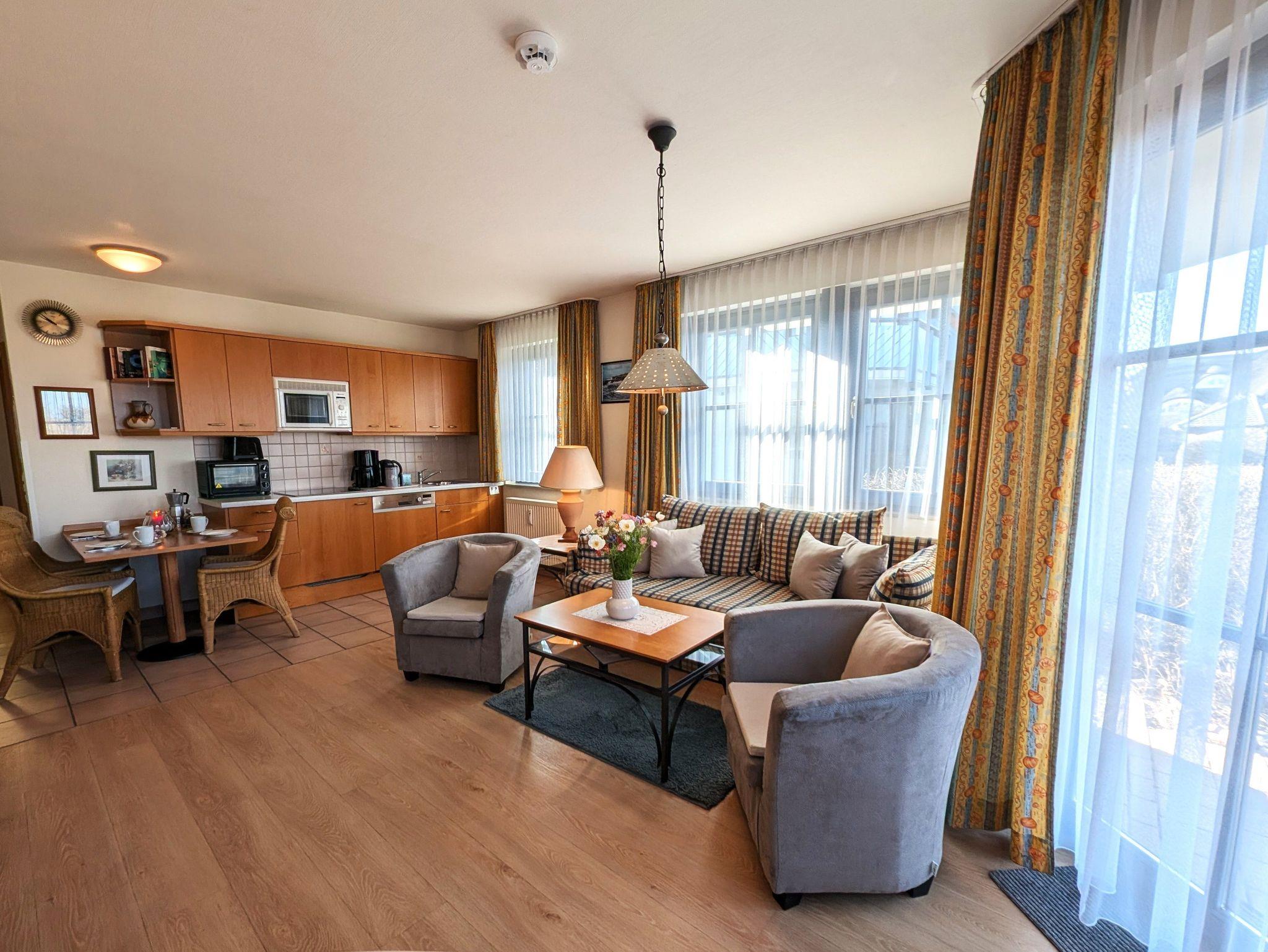 die helle und freundliche Wohnung liegt in direkter Strandlage. Die Terrasse liegt süd- westseitig und lädt zum gemütlichen Frühstück oder Abendessen ein, oder genießen Sie einfach die traumhaften Sonnenuntergänge am feinsandigen Ostseestrand in 50 m Entfernung. Das Wohnzimmer verfügt über eine Schlafcouch für 2 Personen, SAT- TV, Musikanlage und kostenlosem WLAN- Zugang. Das Schlafzimmer ist ausgestattet mit einem Radiowecker und einem Doppelbett 1,80 x 2,00 m (getrennte Matratzen) sowie viel Stauraum. Die offen gestaltete Küchenzeile mit umfangreichen Kochutensilien, 4-Platten- Cerankochfeld, Geschirrspülmaschine, Minibackofen und dem Essplatz laden zum gemeinsamen Kochen und Beisammensein ein. Teilweise ist ein Insektenschutz vorhanden. Das Bad mit Badewanne inkl. Duschabtrennung und WC ist innen-liegend. Der Parkplatz befindet sich in der Tiefgarage. Ein Münz-Waschsalon finden Sie im Nachbarhaus. Die Wohnung wird inklusive Bettwäsche übergeben, Handtücher können in der Zimmervermittlung für 7,00 pro Person (1 Badetuch, 1 Handtuch) dazugebucht werden. Haustiere sind nicht gestattet.Die Wohnung ist eine Nichtraucherwohnung.