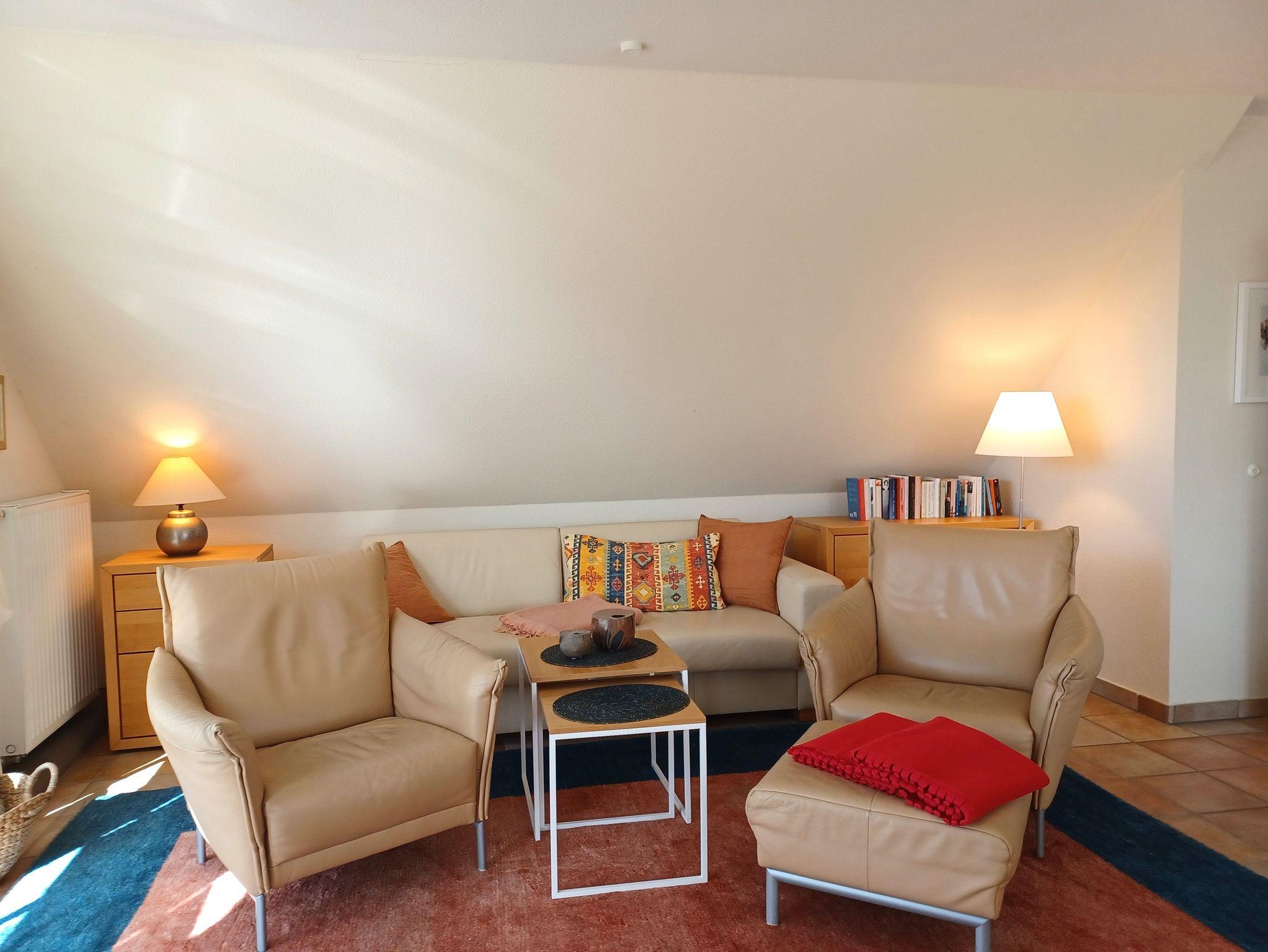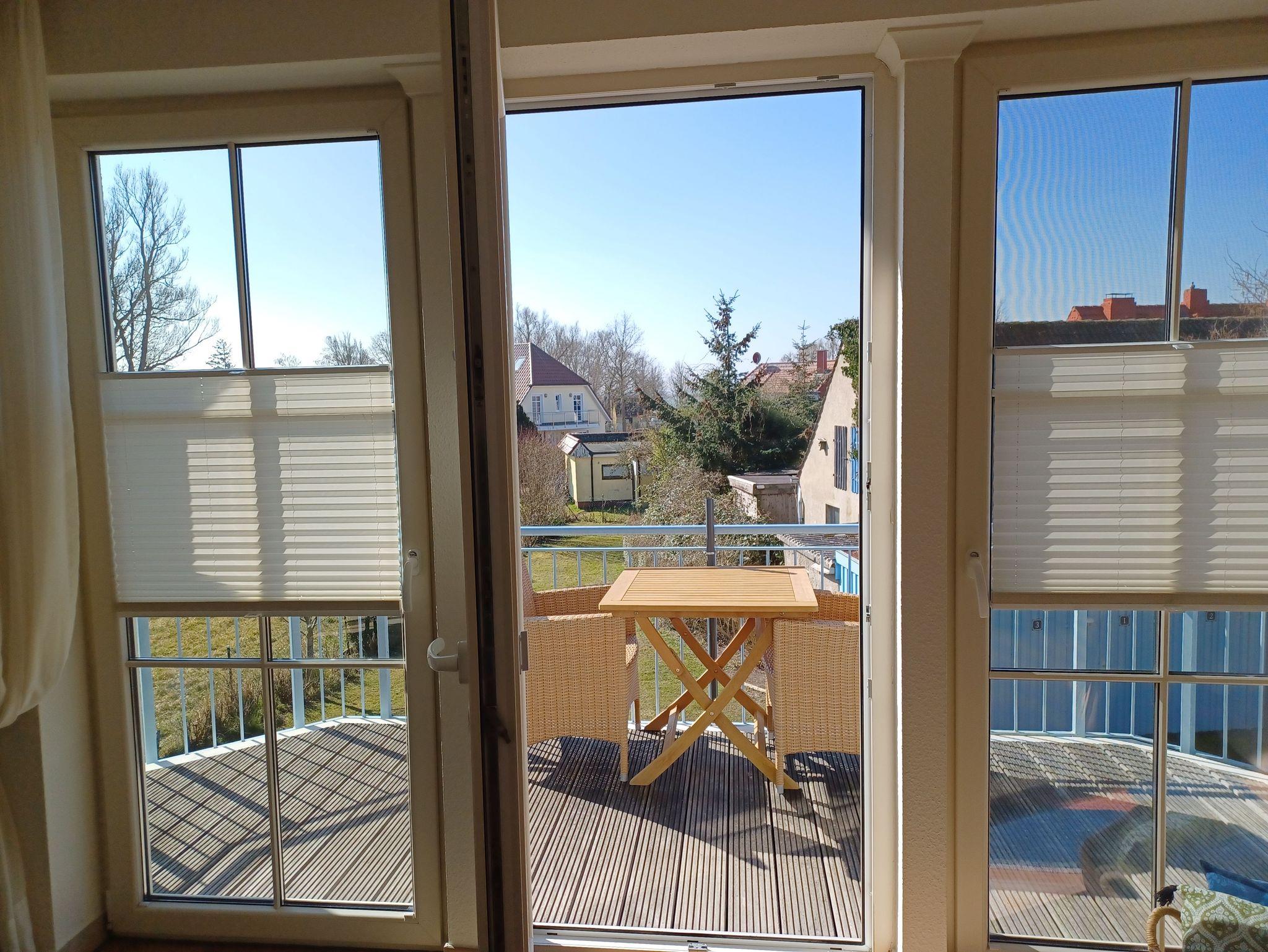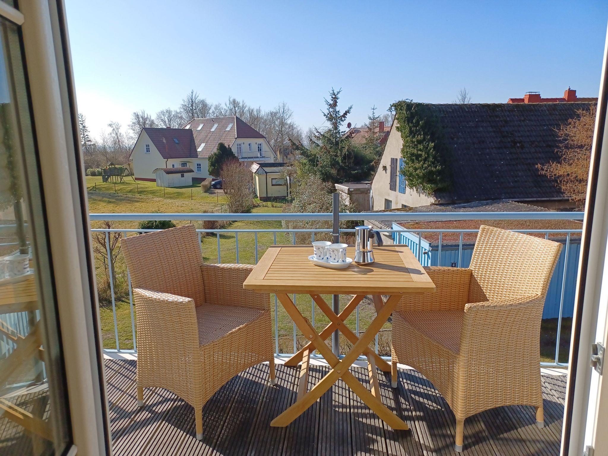 in der Wunderschönen, lichtdurchfluteten Vollkomfortwohnung im Obergeschoss mit Balkon (Süd- West- Ausrichtung) und Boddenblick. Die Ferienwohnung liegt in sehr ruhiger Lage am Ortsrand. Der großzügige Wohnraum ist mit viel Liebe zum Detail ausgestattet worden. Die offene Küchenzeile verfügt über einen Essbereich, einen Geschirrspüler, Cerankochfeld, Backofen, Kaffeemaschine, Toaster und einer weiteren umfangreichen Ausstattung. Im Bad finden Sie eine Dusche und eine Waschmaschine. Das Schlafzimmer wurde mit einem Doppelbett 2,00 x 2,00 m ( getrennte Matratzen ) und einem Kleiderschrank mit viel Stauraum ausgestattet. Der Strand liegt in ca. 10 min. Entfernung.. Für unsere Gäste steht auf dem Grundstück ein abschließbarer Fahrradschuppen zur Verfügung. Die Wohnung wird inclusive Bettwäsche übergeben, Handtücher können Sie in der Zimmervermittlung für 7,00 pro Person (1 Badetuch, 1 Handtuch) zubuchen. Der Parkplatz befindet sich direkt am Grundstück.