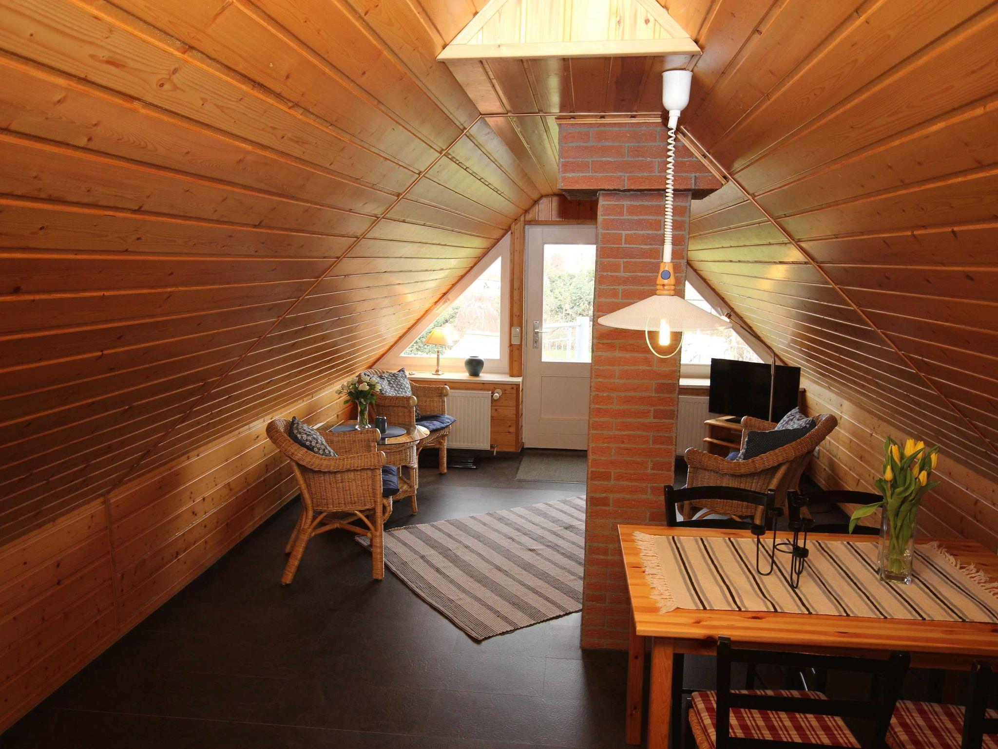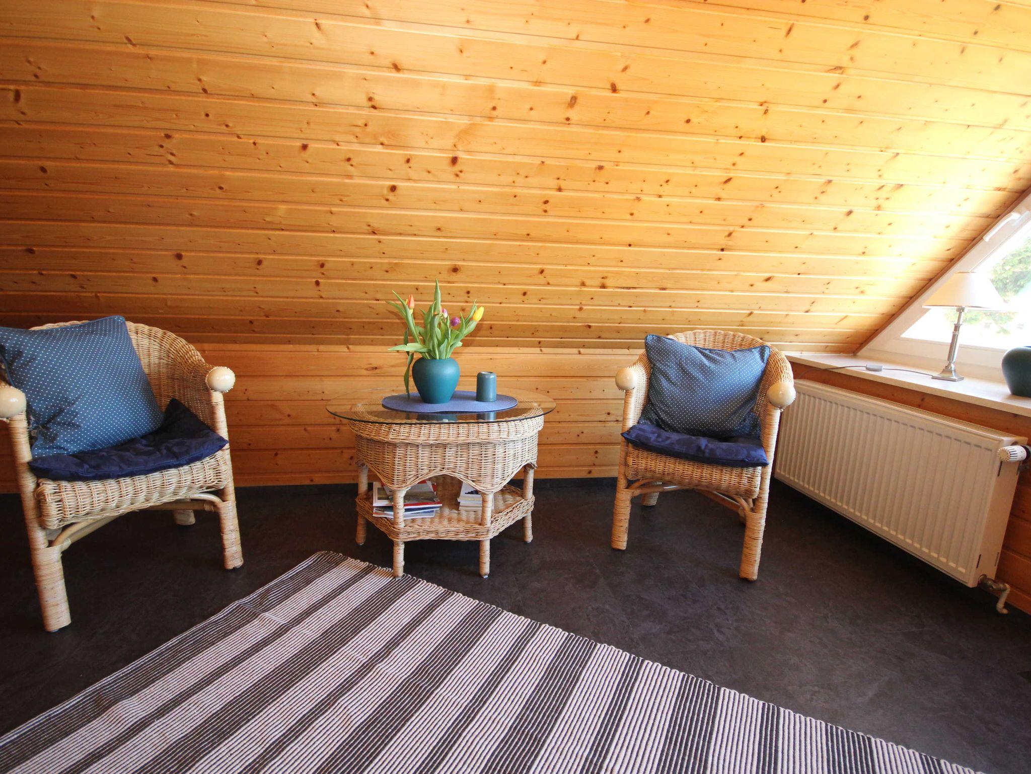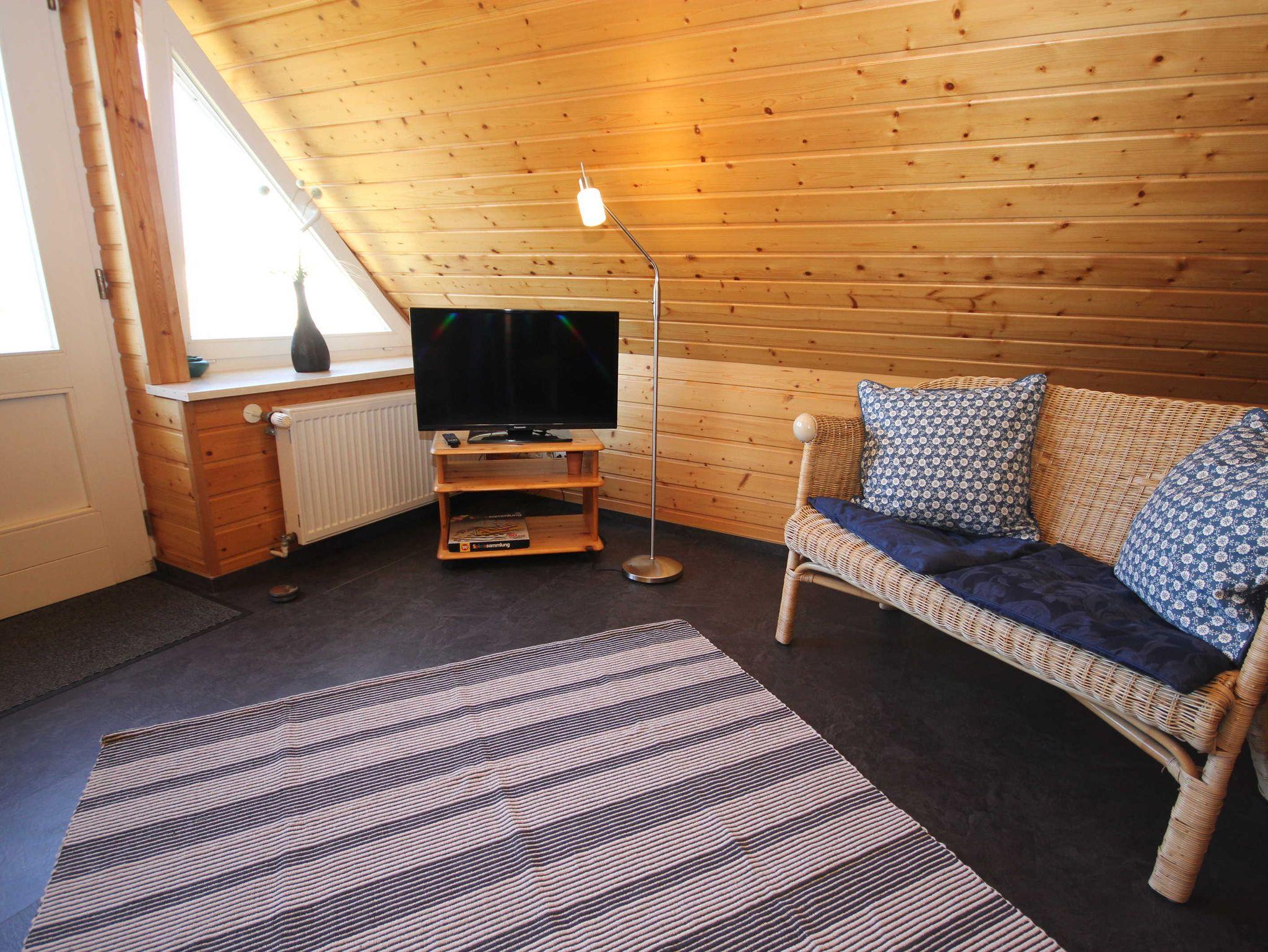 die Ferienwohnung im Obergeschoss mit separatem Eingang, in ruhiger Lage am Ortsrand ist über eine Aussentreppe erreichbar. Der Sitzplatz im Garten auf der separaten Terrasse lädt Sie zum verweilen und entspannen ein. An das offene Wohnzimmer mit kostenlosen WLAN- Gästezugang und SAT-TV, schließt sich die kleine Küchenzeile mit Essplatz an. Die Ferienwohnung verfügt über 2 - 1.Schlafzimmer mit Doppelbett 1,80 x 2,00 m (getrennte Matratzen) und das 2. Schlafzimmer ist über eine Raumspartreppe zur Schlafgalerie mit 2 Einzelbetten erreichbar 0,90 x 2,00 m. Die Wohnung wird inclusive Bettwäsche übergeben, Handtücher können in der Zimmervermittlung für 7,00 pro Person (1 Badetuch, 1 Handtuch) dazugebucht werden. Das Rauchen in der Wohnung ist nicht gestattet. In der abgeschlossenen Garage ist Platz für 1 PKW. Der Strand ist in ca. 15 Gehminuten zu erreichen.