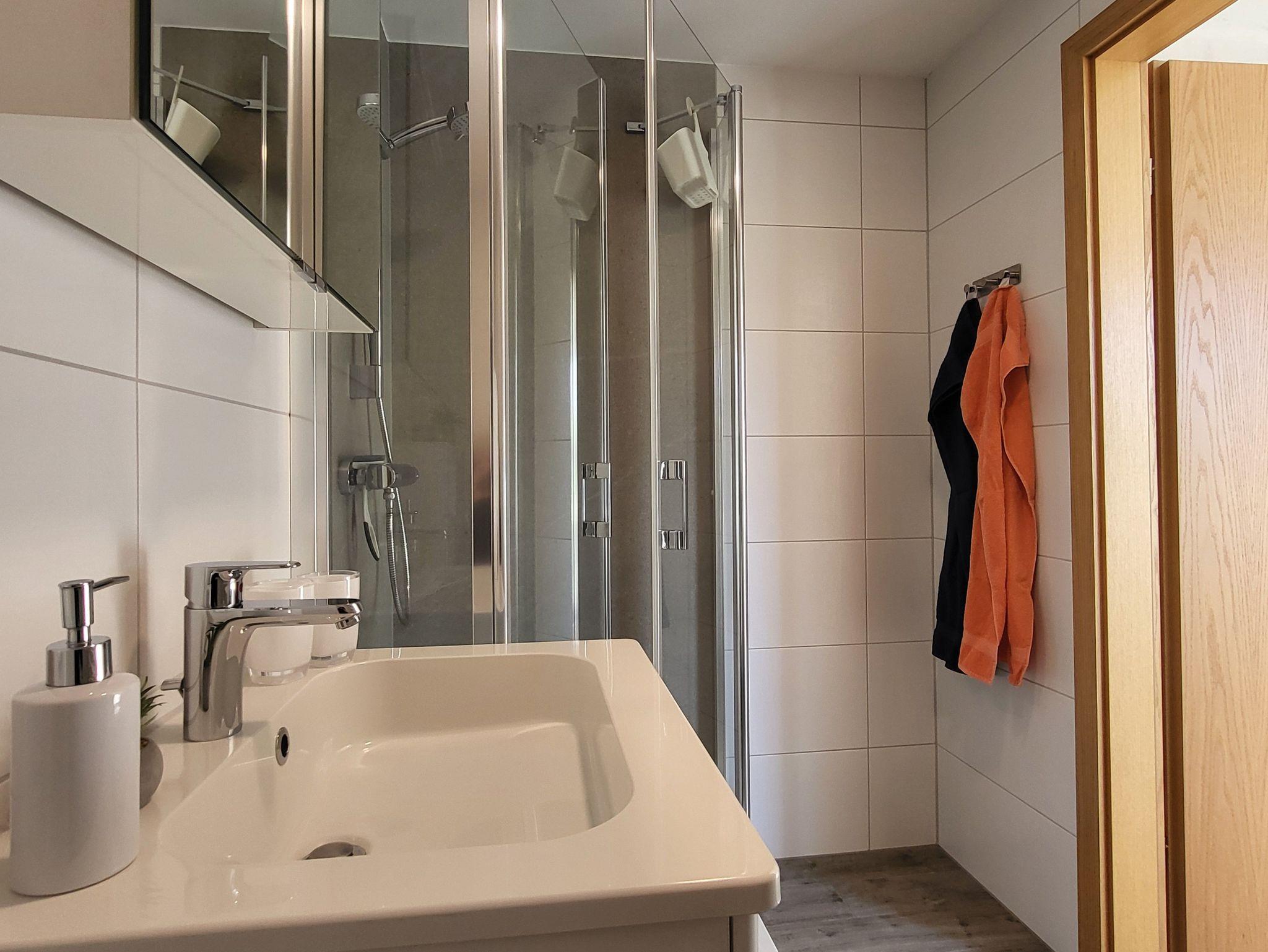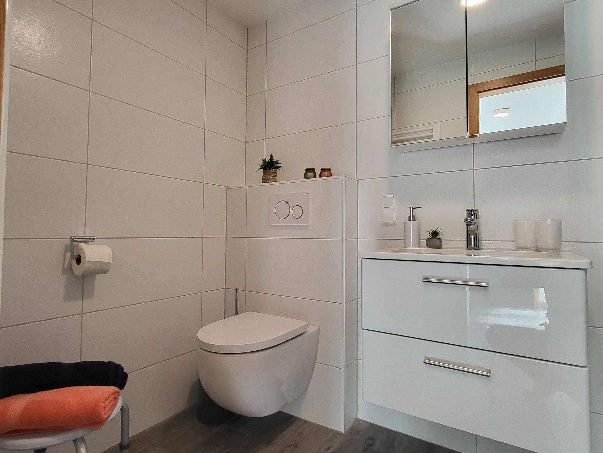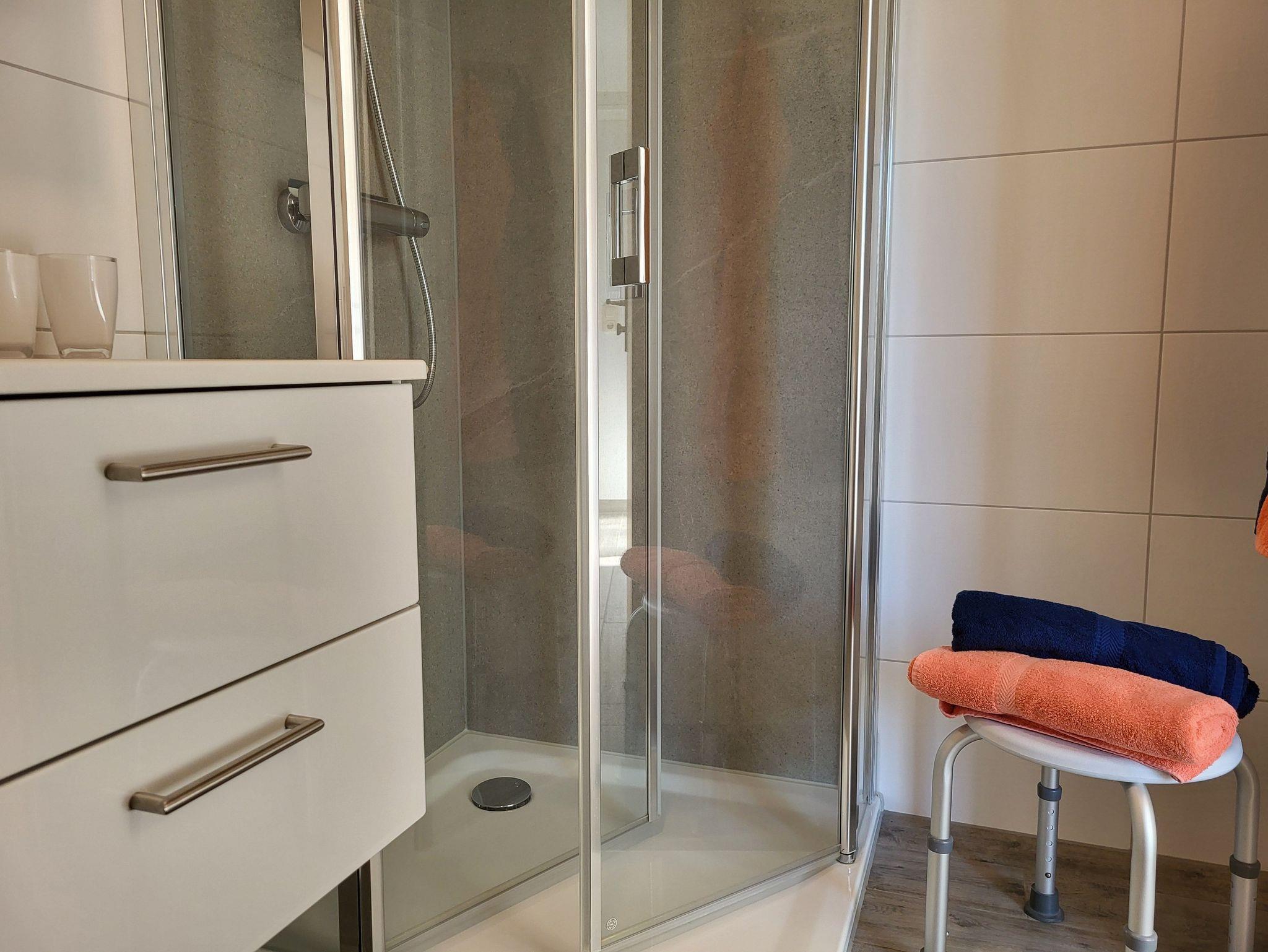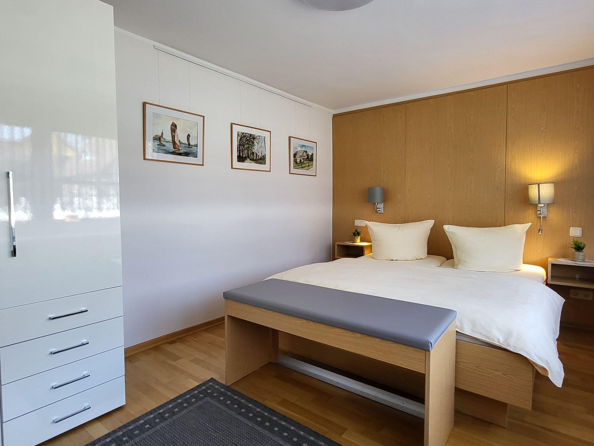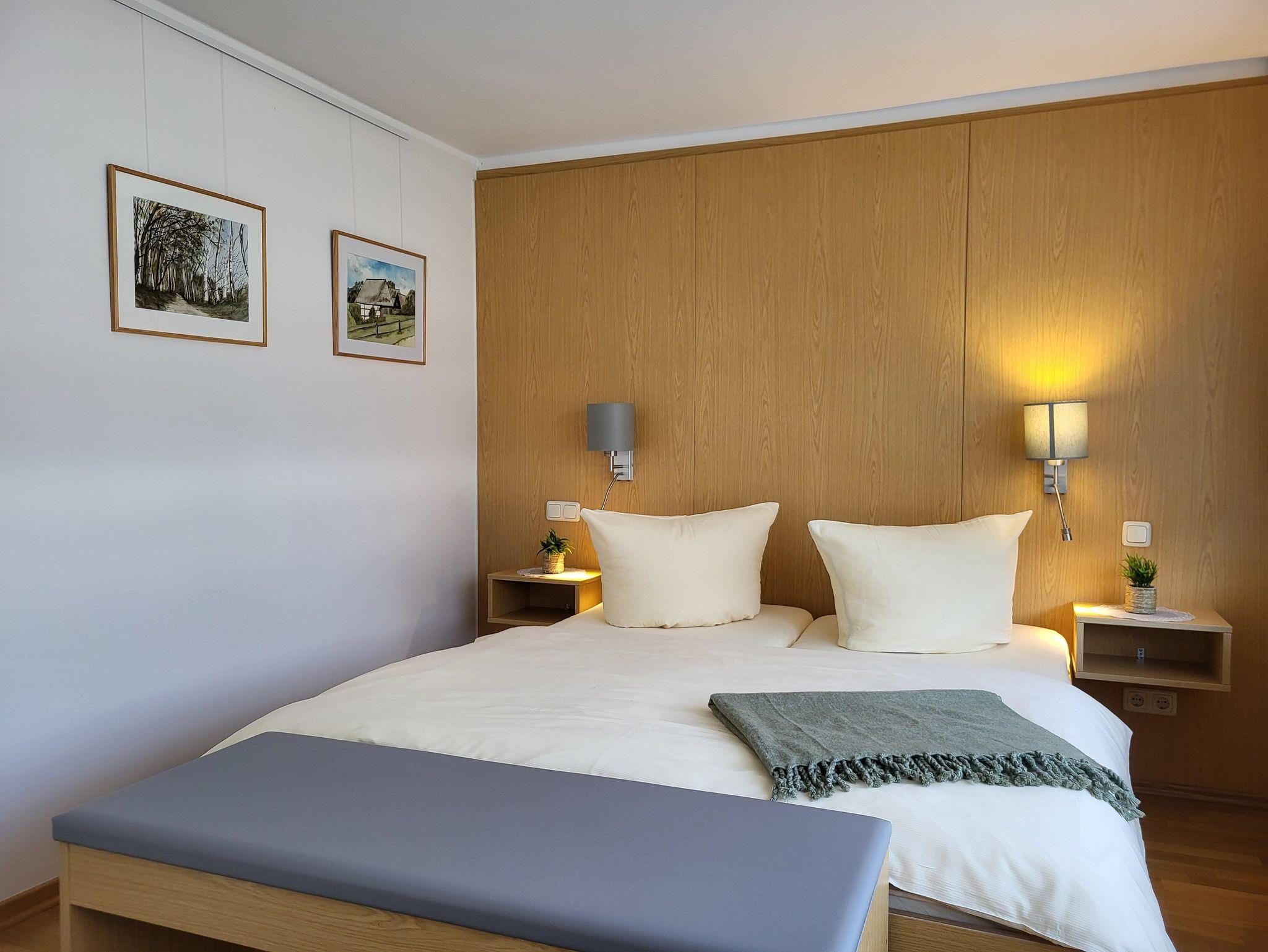 Das Schlafzimmer verfügt über ein Doppelbett 1,60 x 2,00 m (getrennte Matratzen). Die Bettwäsche ist inclusive, Handtücher können in der Zimmervermittlung für 7,00 pro Person (1 Badetuch, 1 Handtuch) dazugebucht werden.Das Bad verfügt über eine ebenerdige Dusche.
