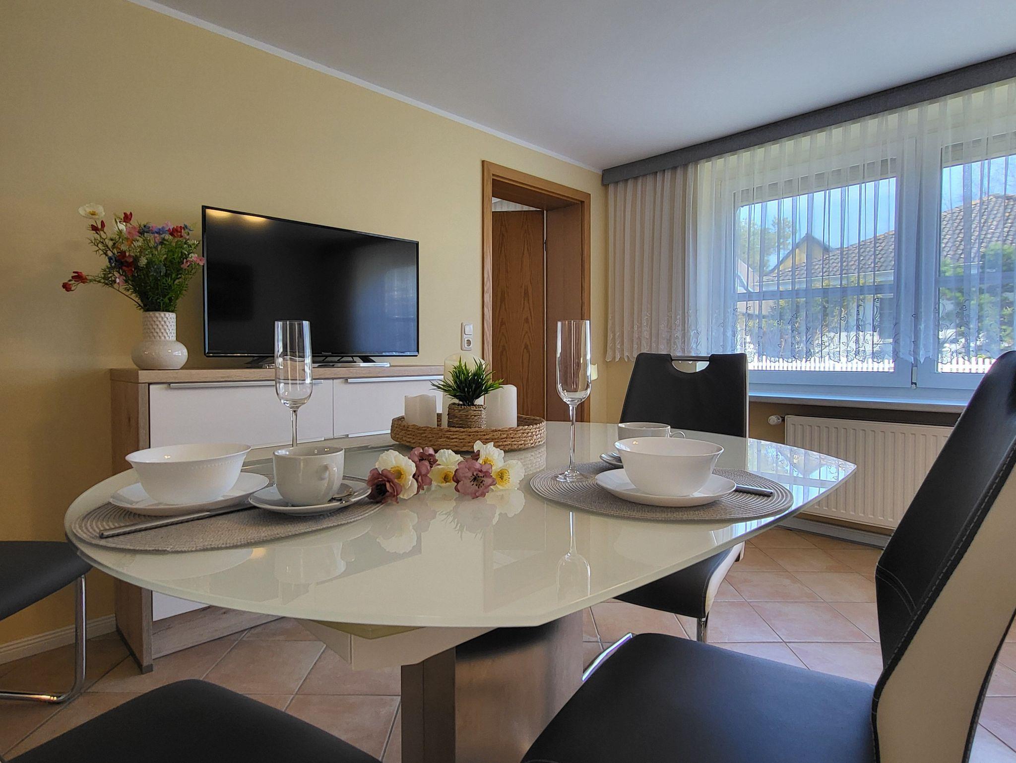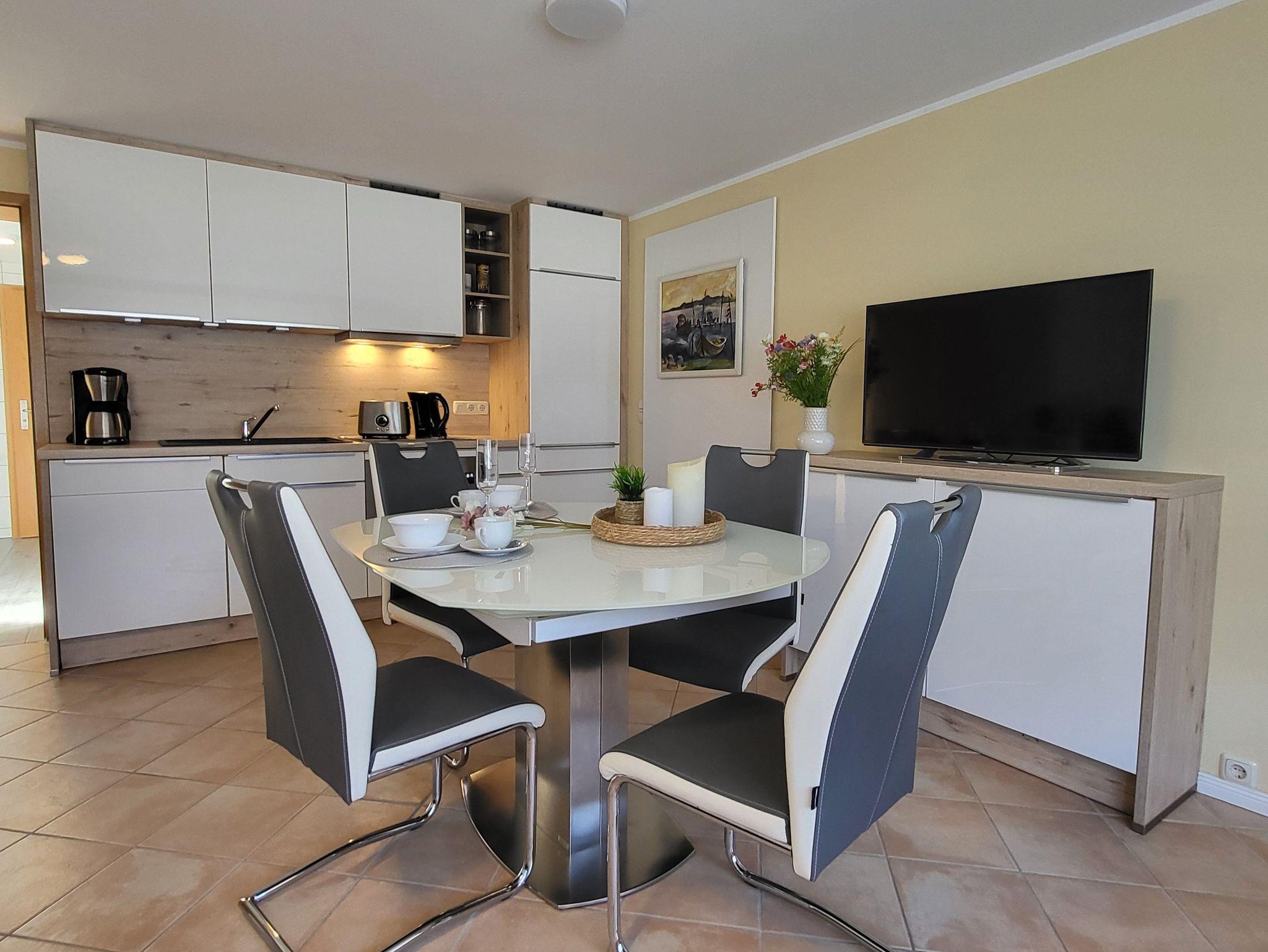 die zentral und hochwertig ausgestattete Ferienwohnung Anika 1 liegt in ruhige Lage am Ortsrand. Der Sitzplatz mit Grillmöglichkeit befinden sich im Garten, diesen teilen Sie sich mit der Wohnung Anika 2. Die Wohnung verfügt über einen separaten Eingang und einen Parkplatz auf dem Grundstück. Das Wohnzimmer mit offener Küchenzeile und Essplatz sind gemütlich eingerichtet und verfügt über einen WLAN- Anschluß, Der Strand liegt in ca. 500 m Entfernung. Die offene Küchenzeile ist ausgestattet mit einem Geschirrspüler, Kühlschrank mit Gefrierfach, Induktionskochfeld, Herd und Mikrowelle.