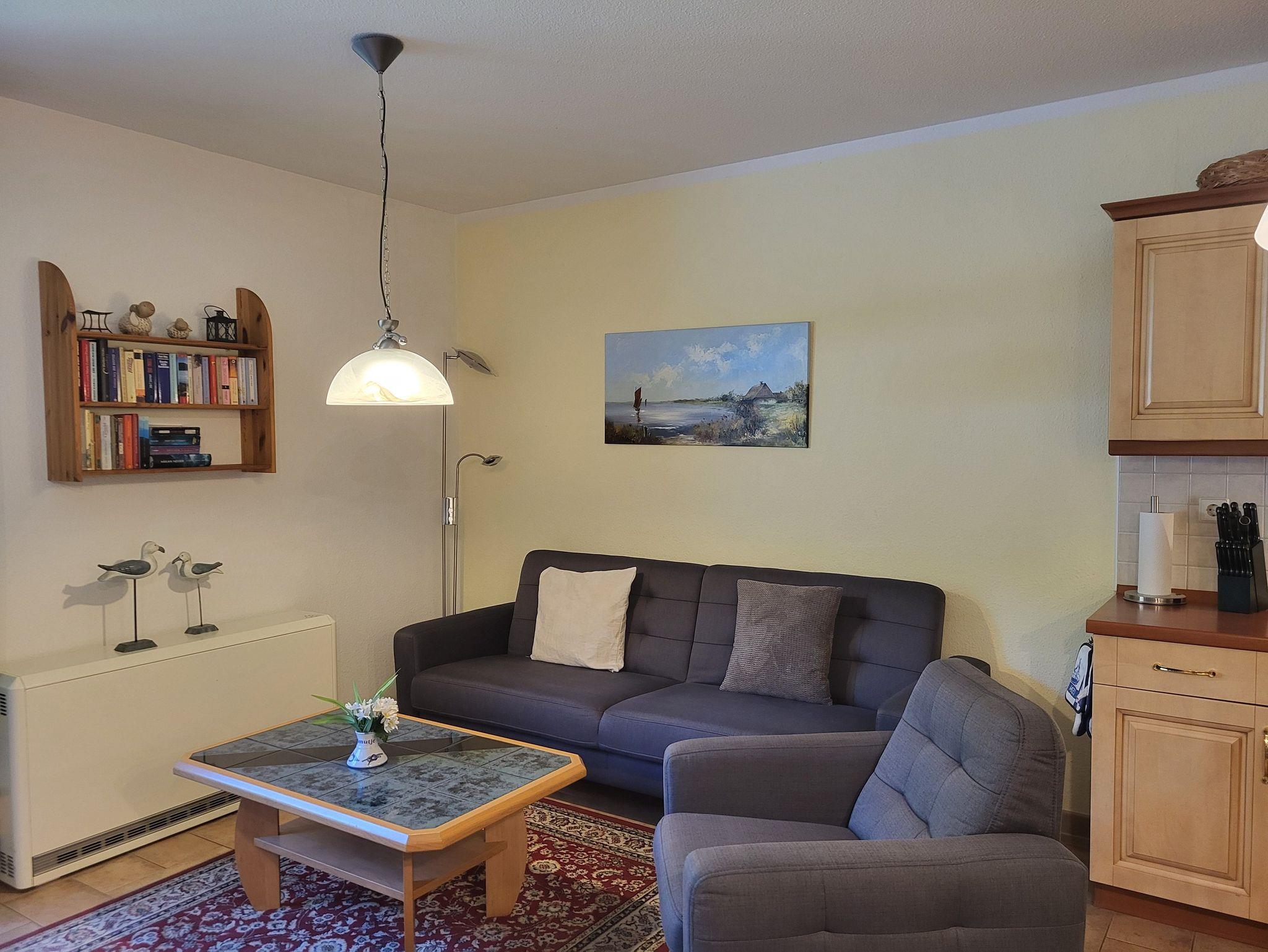 Die Ferienwohnung ist komfortabel mit hellen Möbeln, Radio, Sat-TV und DVD-Player ausgestattet. An die offene Eckküche mit Cerankochfeld, Backofen, Kaffeemaschine, Toaster, Geschirrspüler und Kühlschrank schließt sich der Essplatz an. Das Schlafzimmer verfügt über ein Doppelbett mit den Maßen 1,80 x 2,00 m (getrennte Matratze). Im Bad befindet sich eine Dusche mit niedrigem Einstieg. Im Haus gibt es einen kostenlosen WLAN- Zugang. Haustiere sind herzlich willkommen. Das Rauchen ist in der Ferienwohnung nicht gestattet. Auf dem Grundstück steht 1 PKW- Stellplatz zur Verfügung,