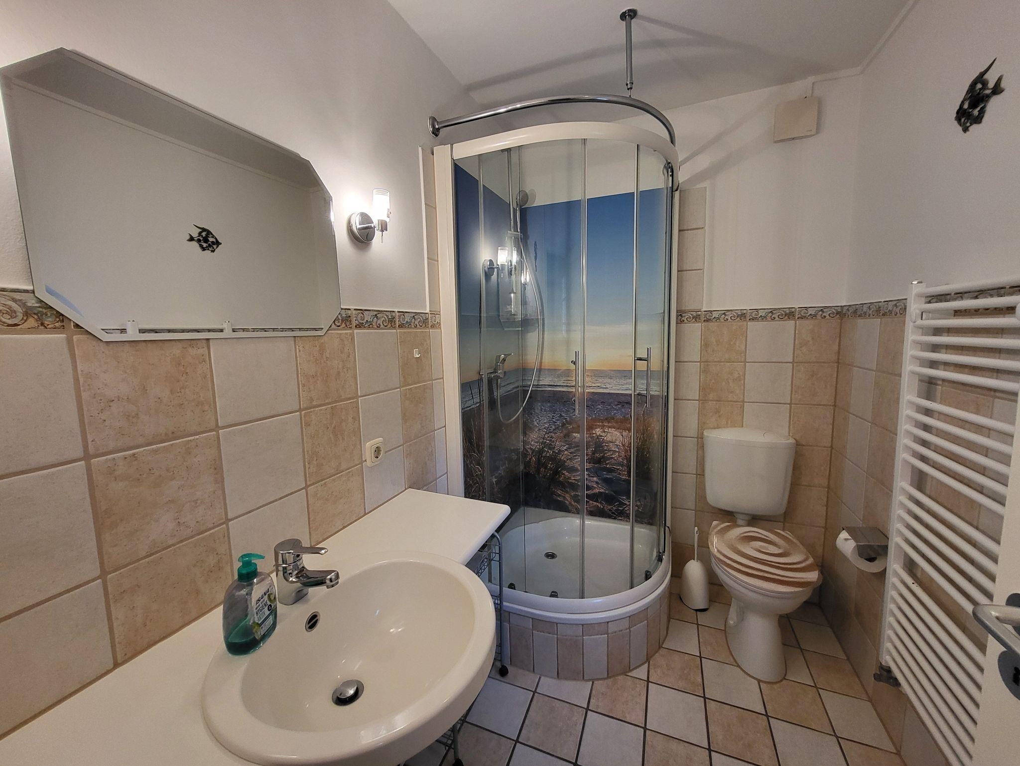 Im Erdgeschoss befindet sich ein Bad mit Dusche und WC, sowie ein Wohnzimmer mit SAT- TV. Die offene Küchenzeile ist ausgestattet mit einem Essbereich, Geschirrspüler, Induktionskochfeld, kleiner Minibackofen, Kühlschrank mit Gefrierfach, Kaffeemaschine und Wasserkocher.