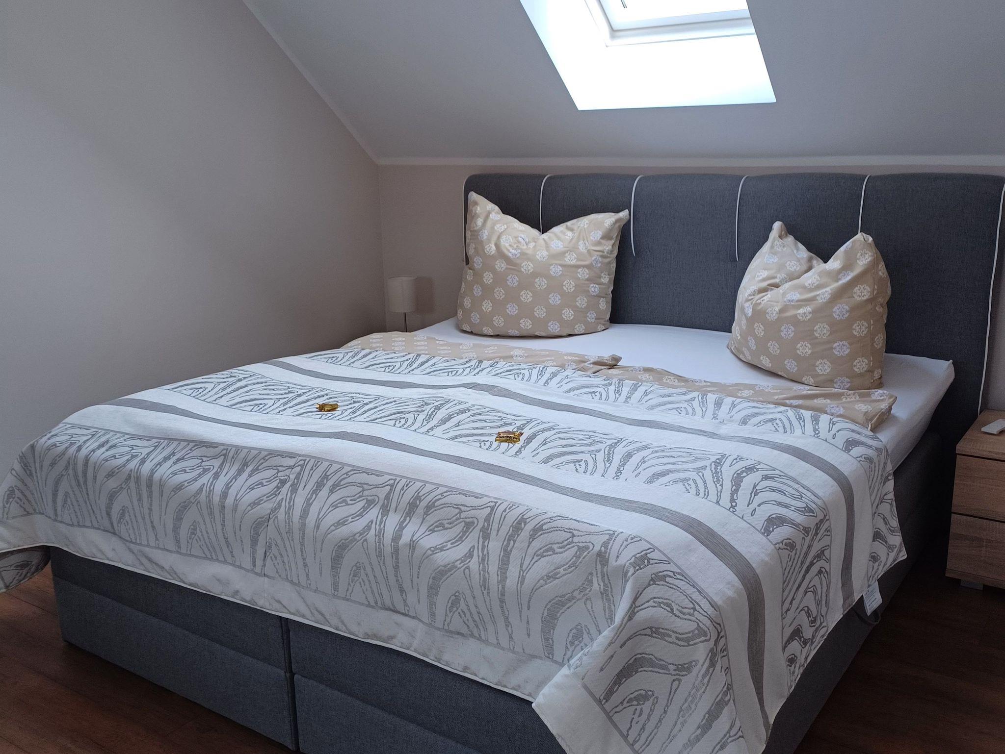 kleines modernes und gemütliches Appartement im Obergeschoss für 1- 2 Personen, mit separatem Eingang über eine Aussentreppe erreichbar. Der Wohn- und Schlafbereich ist mit einer gemütlichen Sitzgruppe, WLAN - Zugang, einem Doppelbett 1,80 x 2,00 m (getrennte Matratzen) und einer Fußbodenheizung ausgestattet. Die kleine Küchenzeile mit Mikrowelle, 2 Platten- Cerankochfeld und Kühlschrank rundet die geschmackvolle Einrichtung ab. Der Parkplatz befindet sich auf dem Grundstück. Genießen Sie die gemütliche Sitzecke im Garten beim Frühstück oder lassen Sie den Abend am Grill ausklingen. Das Appartement wird mit Bettwäsche übergeben, die Handtücher können in der Zimmervermittlung für 7,00 pro Person (1 Badetuch, 1 Handtuch) dazugebucht werden.