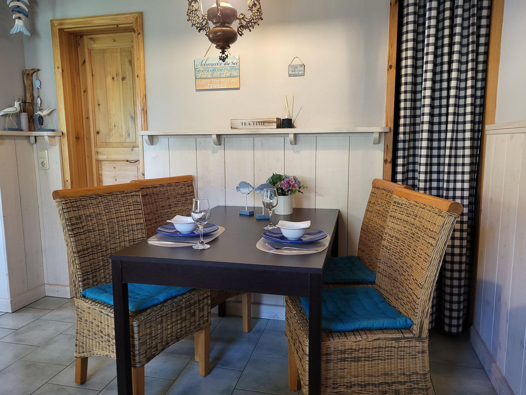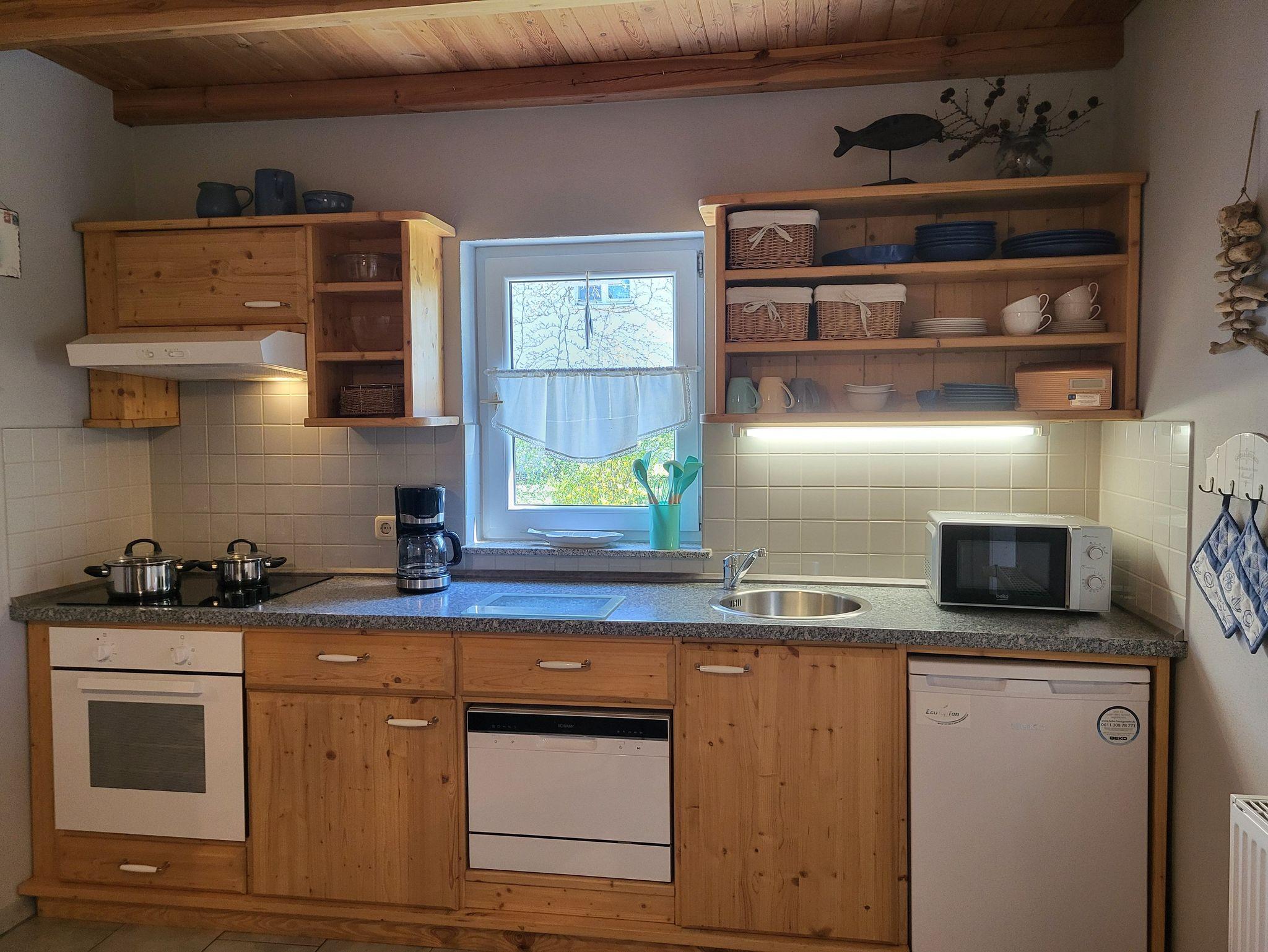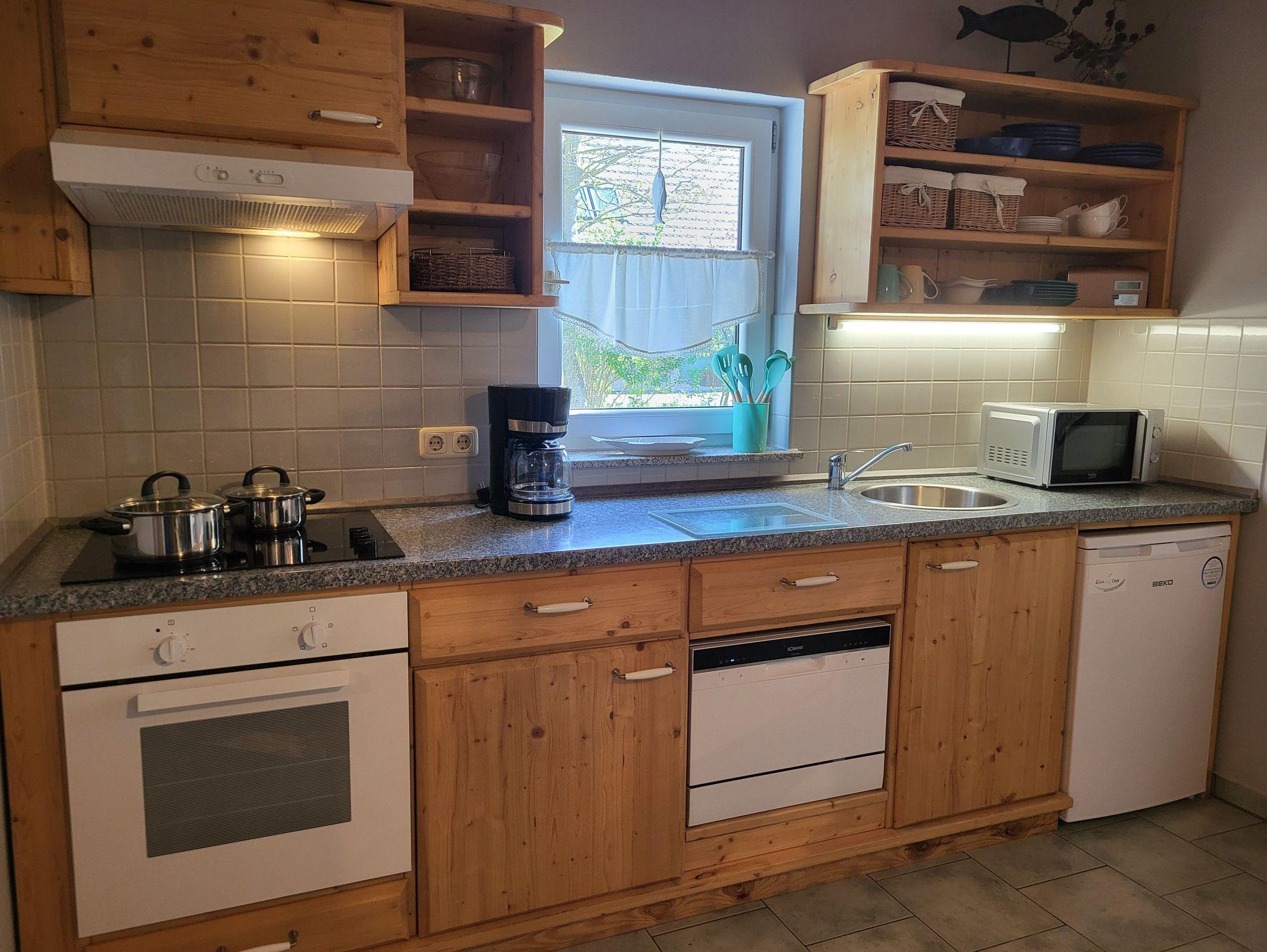 individuell und mit Liebe zum Detail eingerichtete Ferienwohnung im Erdgeschoss und separatem Eingang. Der gemütlich eingerichtete Wohnbereich mit Zugang zur Süderseitgen Terrasse, lädt zum erholen und entspannen ein. Gern können Sie auch im Garten (ca. 200 qm) sich einen gemütlichen und versteckten Platz suchen. Der offene Wohnbereich ist ausgestattet mit einer Couch und einem Kaminofen ( ein Starterpaket steht bereit), daran schließt sich die offene komplett ausgestattete Küchenzeile mit ausreichend Geschirr und umfangreicher Ausstattung an.Das Schlafzimmer ist ausgestattet mit Doppelbett (1,40 x 2,00 m) und das Kinderzimmer mit 1 Einzelbett (0,90 x 1,90 m). Im Bad befindet sich eine Dusche/WC.Die Wohnung wir mit Bettwäsche und Handtücher übergeben. Der Parkplatz befindet sich auf dem Grundstück.Alle Wohnungen sind Nichtraucherwohnungen. Haustiere sind nicht erlaubt.