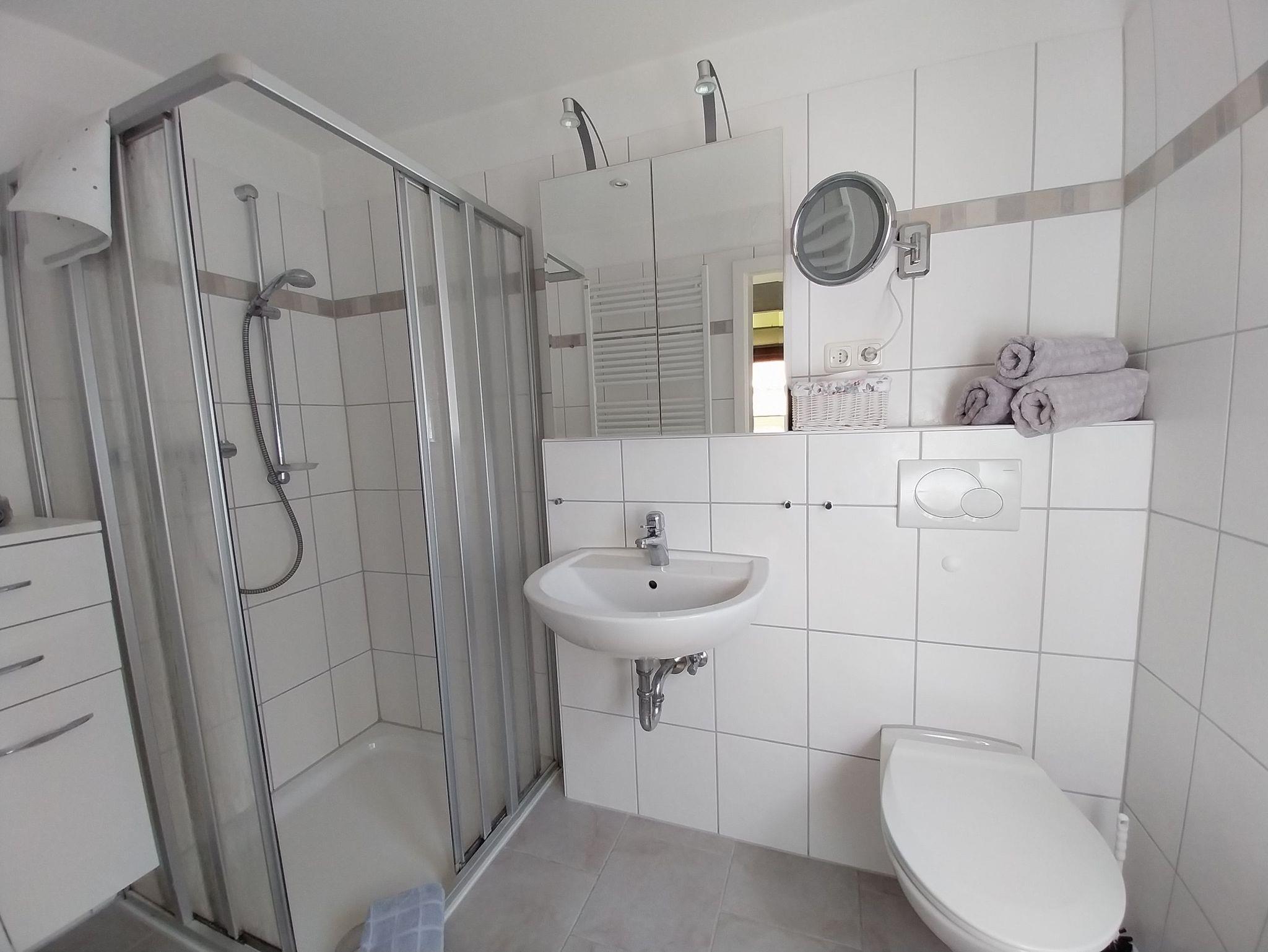 Diese lichtdurchflutete Wohnung erstreckt sich über beide Etagen des Hauses und steht zur alleinigen Nutzung zur Verfügung. Wohn- und Esszimmer gehen ineinander über und bieten viel Platz, um sich auch bei Regentagen wohl zu fühlen. Kinderzimmer (Boxspringbett 1,40 x 2,00 m), Elternschlafzimmer (Doppelbett 1,80 m x 2 m) und 1 Babybett