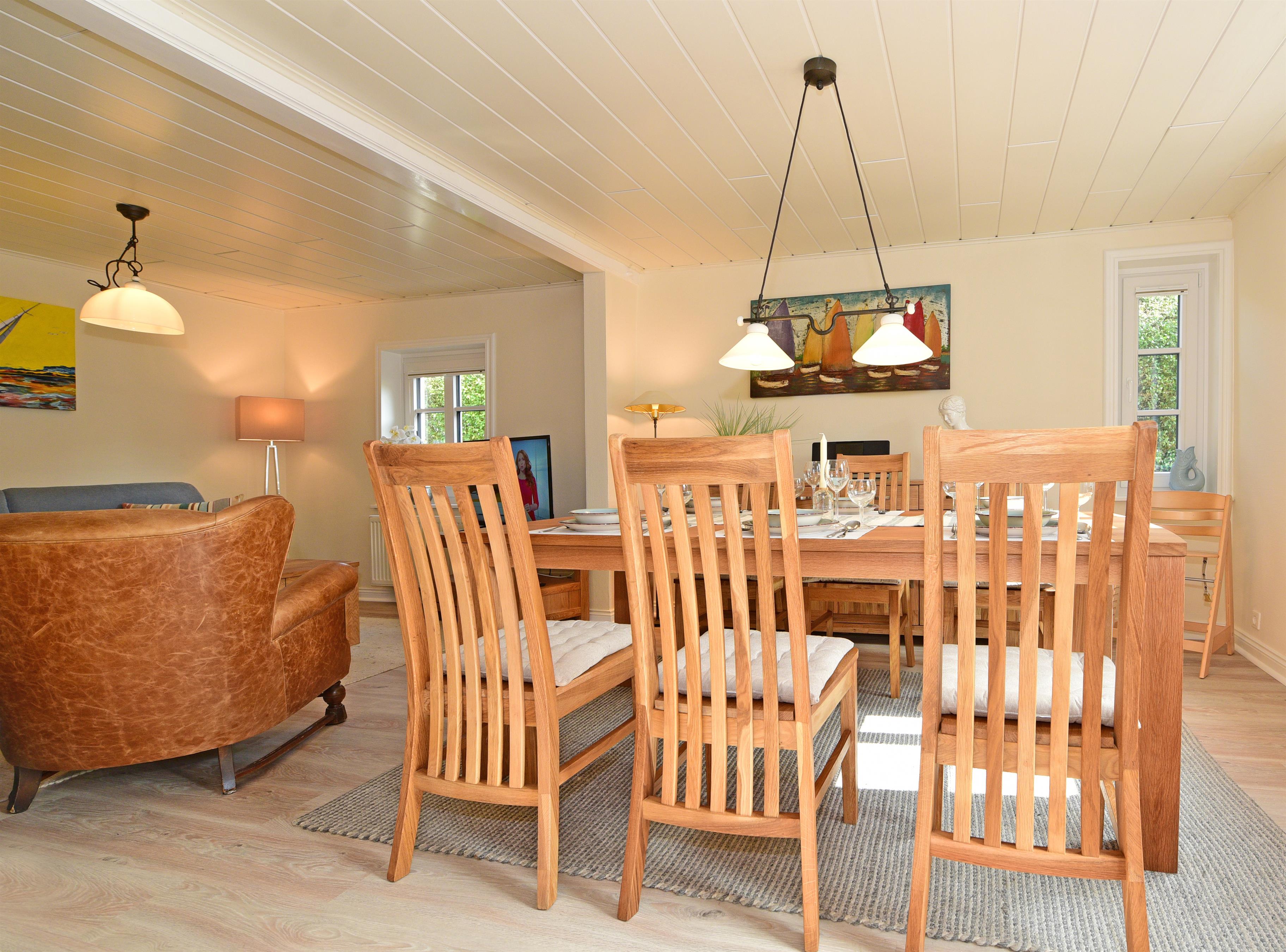 Im Erdgeschoss erwartet Sie ein großes, gemütliches Wohnzimmer mit bequemen Möbeln, Kabel-TV, Radio, Telefon und kostenlosem WLAN. Ein großer Esstisch lädt zu gemeinsamen Mahlzeiten oder geselligen Abenden bei einem Glas Wein ein.