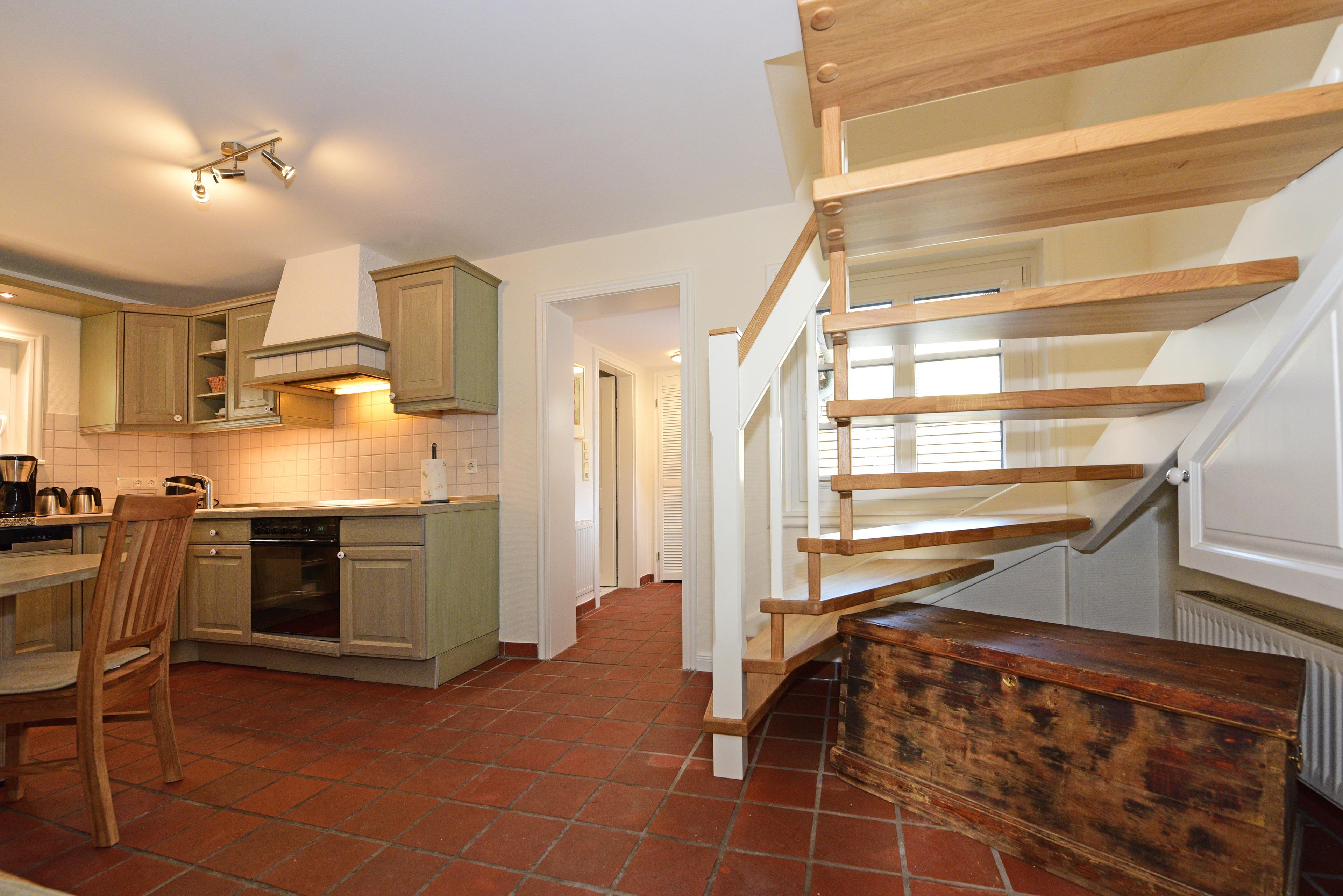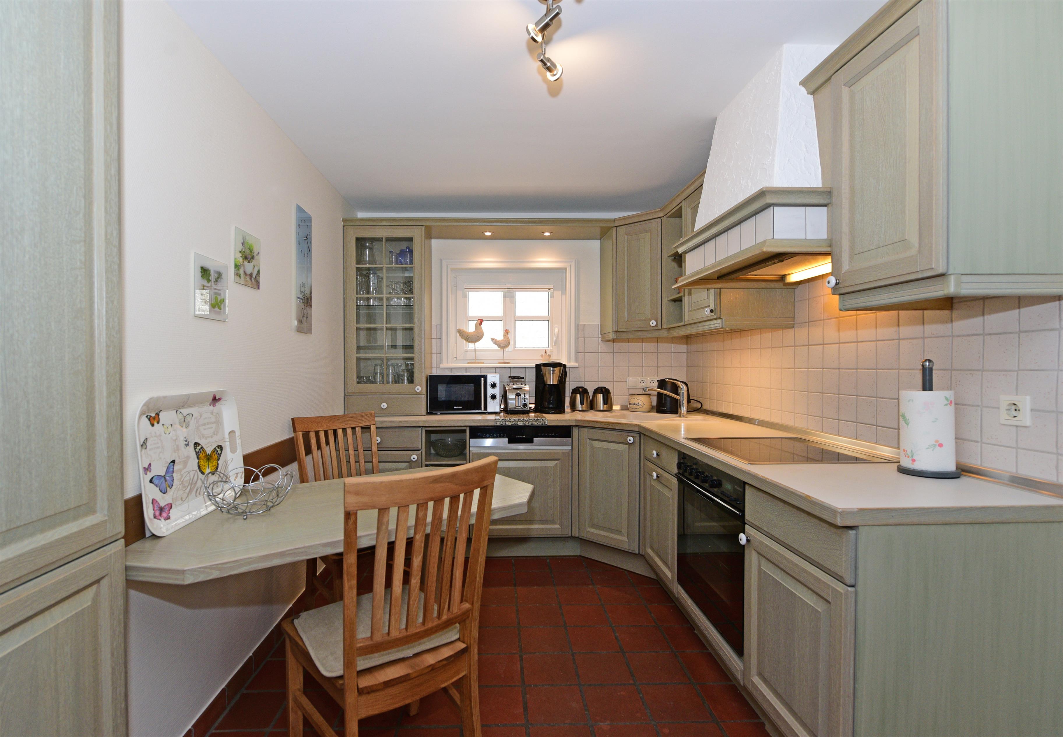 Die voll ausgestattete Küche mit Geschirrspüler, Mikrowelle, Backofen, großem Kühlschrank mit Tiefkühlfach und einem gemütlichen Bistrotisch lädt zu entspannten Kaffeepausen ein. Hier können kreative Köche ihre Talente zeigen und für kulinarische Abwechslung sorgen.