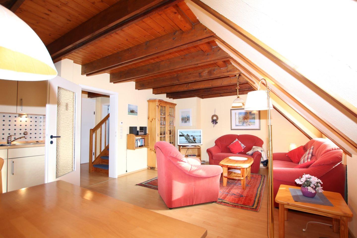 2-Zimmer-Nichtraucherwohnung in der 1 Etage mit eigener Terrasse und Strandkorb. WOHNZIMMER: 2 er Couch und 3 er Couch und 1 Sessel, Esstisch mit 4 Stühlen und KÜCHENZEILE m. Vollausstattung. SCHLAFZIMMER mit Doppelbett (1,60 x 2 m) und Kleiderschrank. BAD mit Dusche und WC. Vom Flur aus führt eine Treppe in den Spitzboden. Die Wohnung ist komplett mit Laminat ausgelegt und verfügt über eine Fußbodenheizung (überall). Fahrradständer und Parkplatz am Haus. Zum Strand sind es nur wenige Meter, zum Zentrum, Kurmittelhaus u. Wellenbad ca. 15 - 20 Minuten Fußweg. Die Wohnung ist liebevoll und gepflegt eingerichtet. Waschmaschine und Trockner, Bügeleisen und -brett stehen im Keller zur Verfügung. Mindestaufenthalt 5 Nächte.