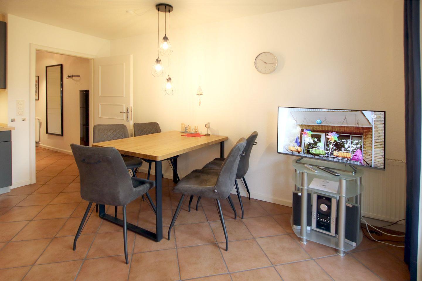 - Wohnzimmer mit Sitzecke aus zwei Sofas und Esstisch mit 5 Stühlen