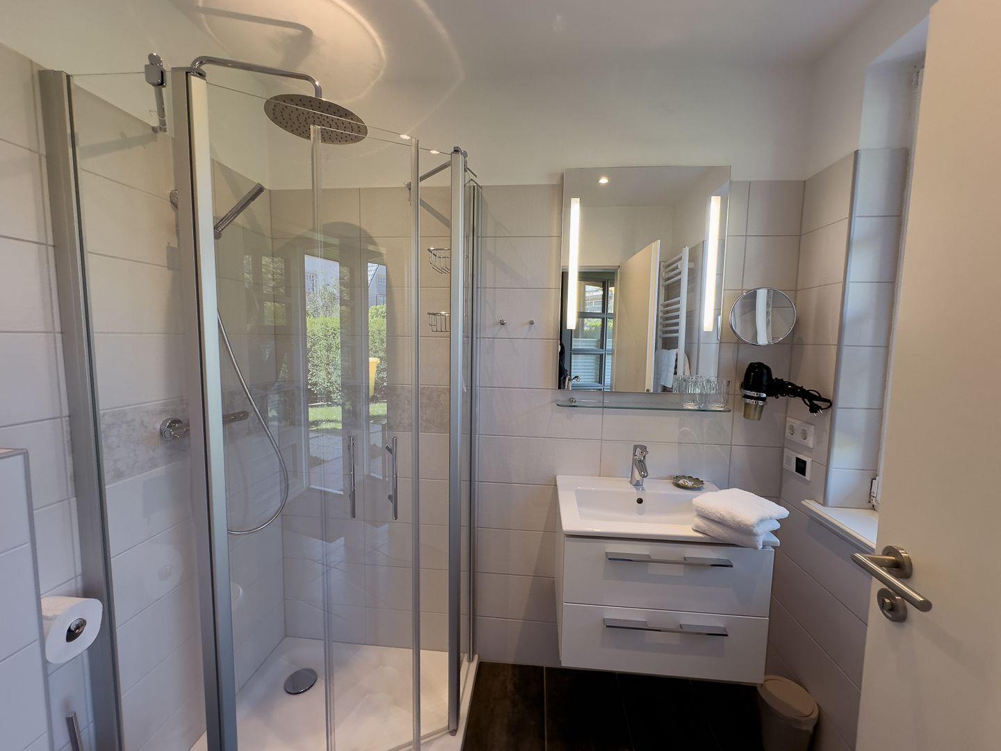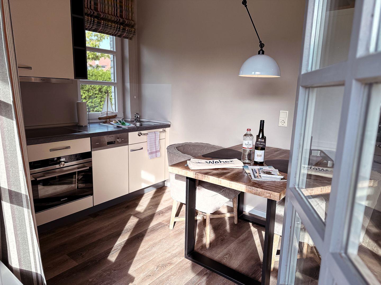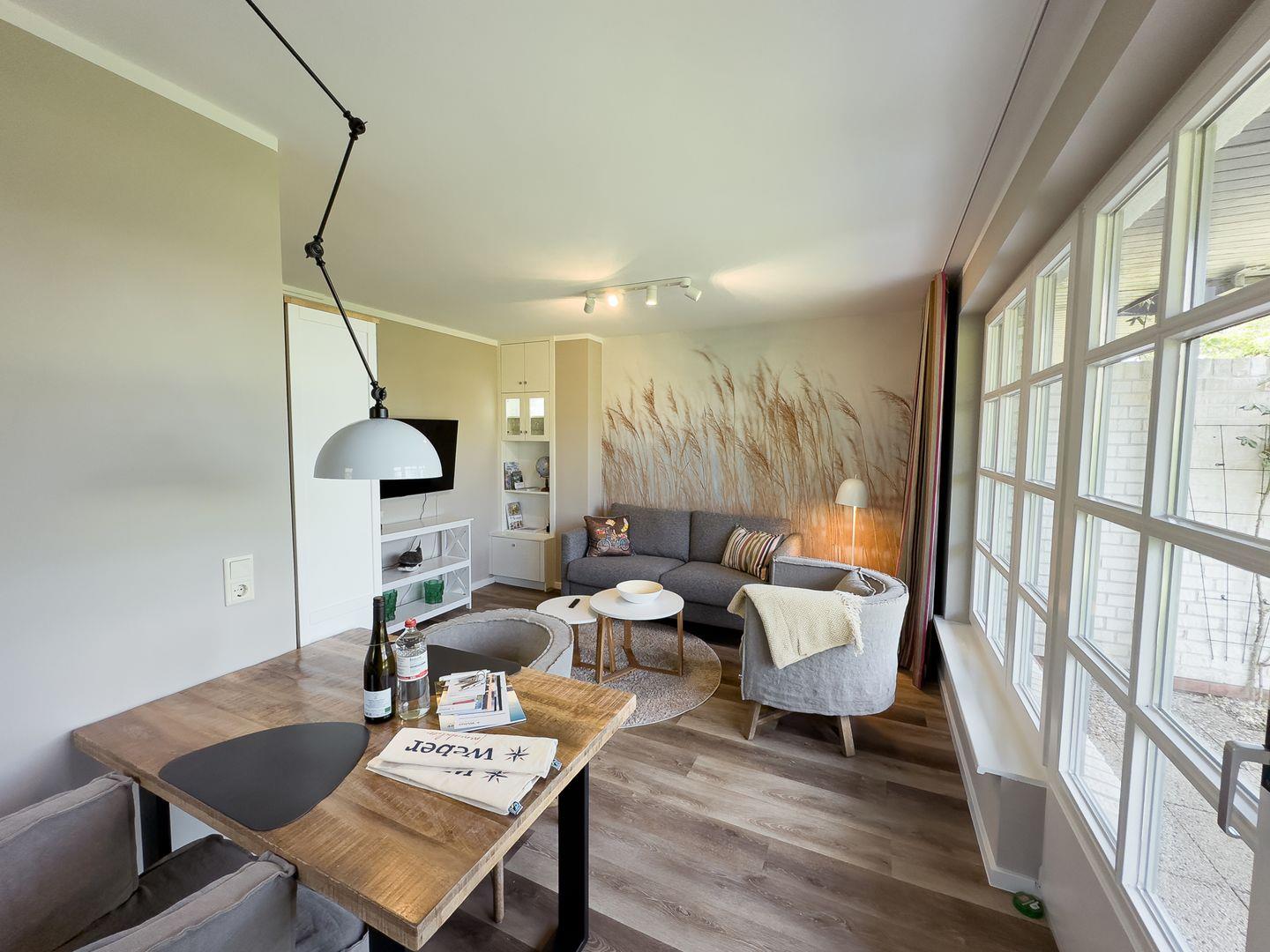 Die Erdgeschosswohnung verfügt über einen Wohn- und Essbereich mit offener Küche sowie einer Schlafcouch, ein Schlafzimmer mit Doppelbett und ein Duschbad. Über den Wohnbereich gelangen Sie direkt auf die eigene Terrasse und in den gemeinschaftlich genutzten Garten.